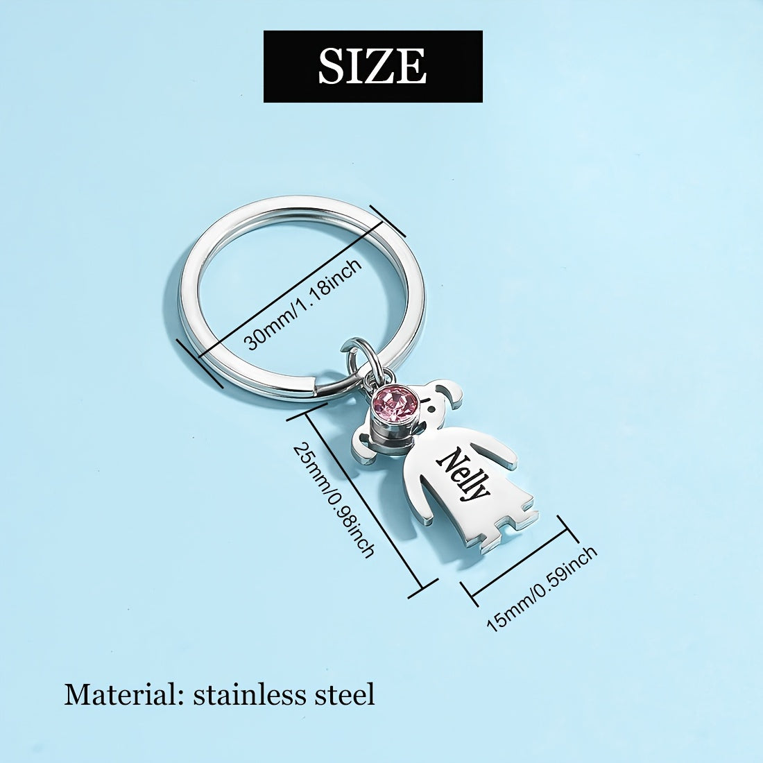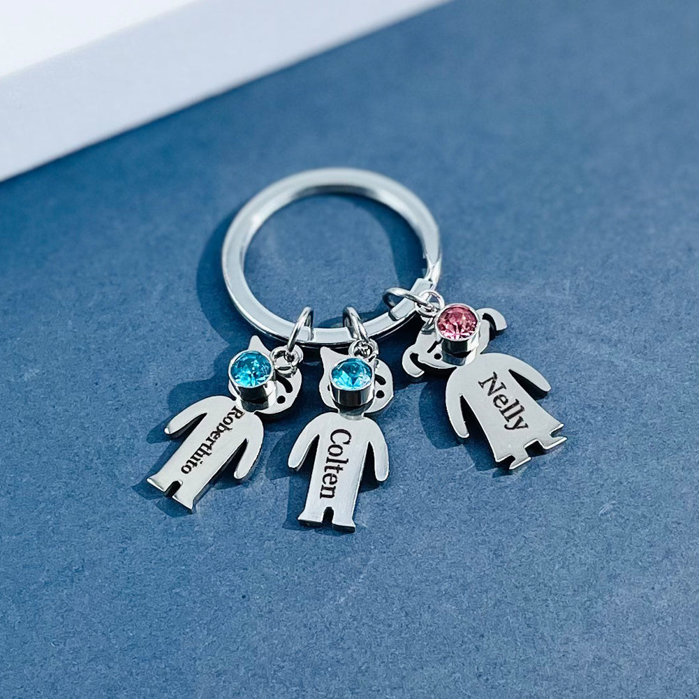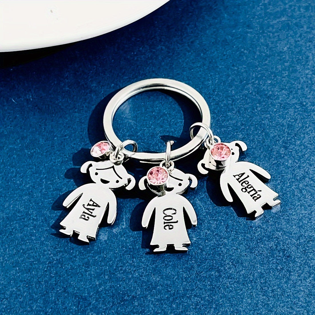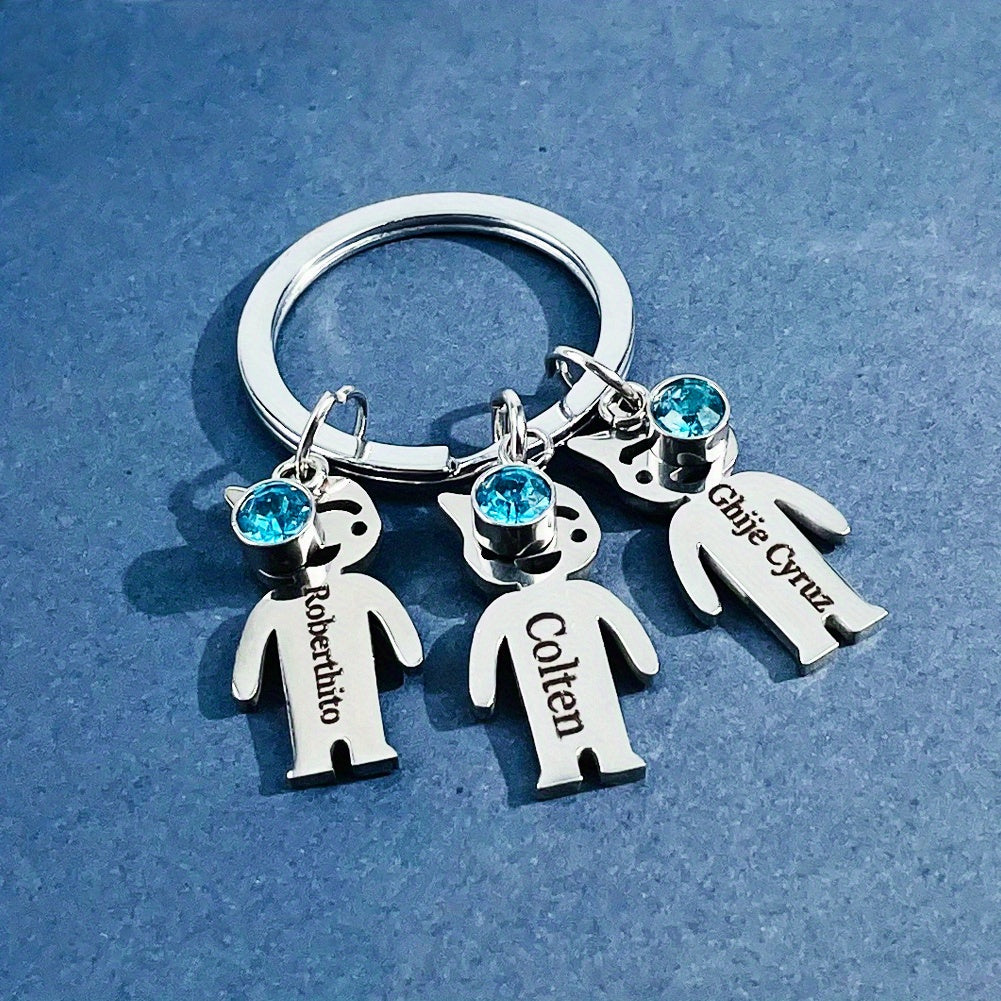 This custom engraved stainless steel keychain features a charming cat charm and a beautiful gemstone. It is a perfect family gift for Dad, beautifully customized with a name. Ideal for a special touch to keys or bags.