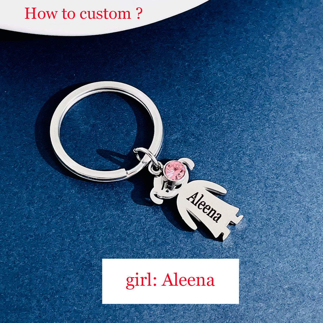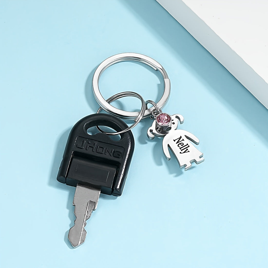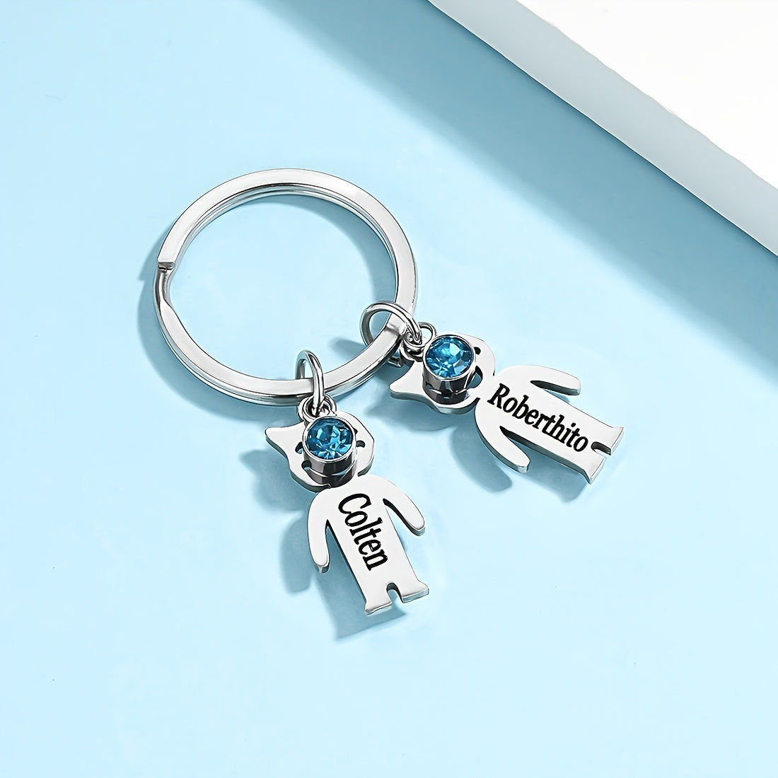 This custom engraved stainless steel keychain features a charming cat charm and a beautiful gemstone. It is a perfect family gift for Dad, beautifully customized with a name. Ideal for a special touch to keys or bags.