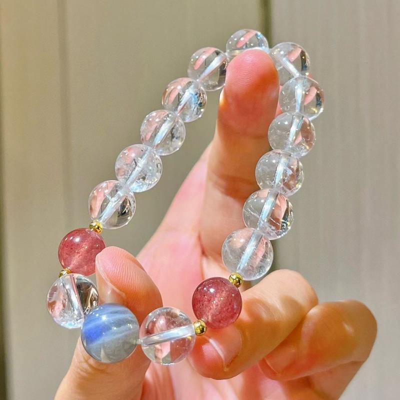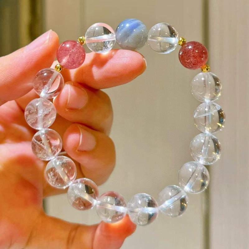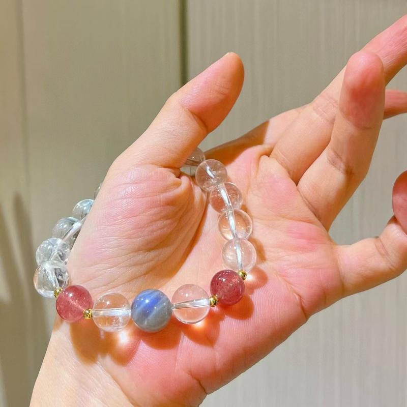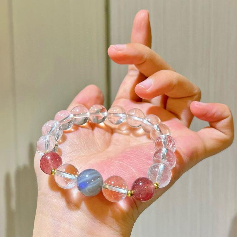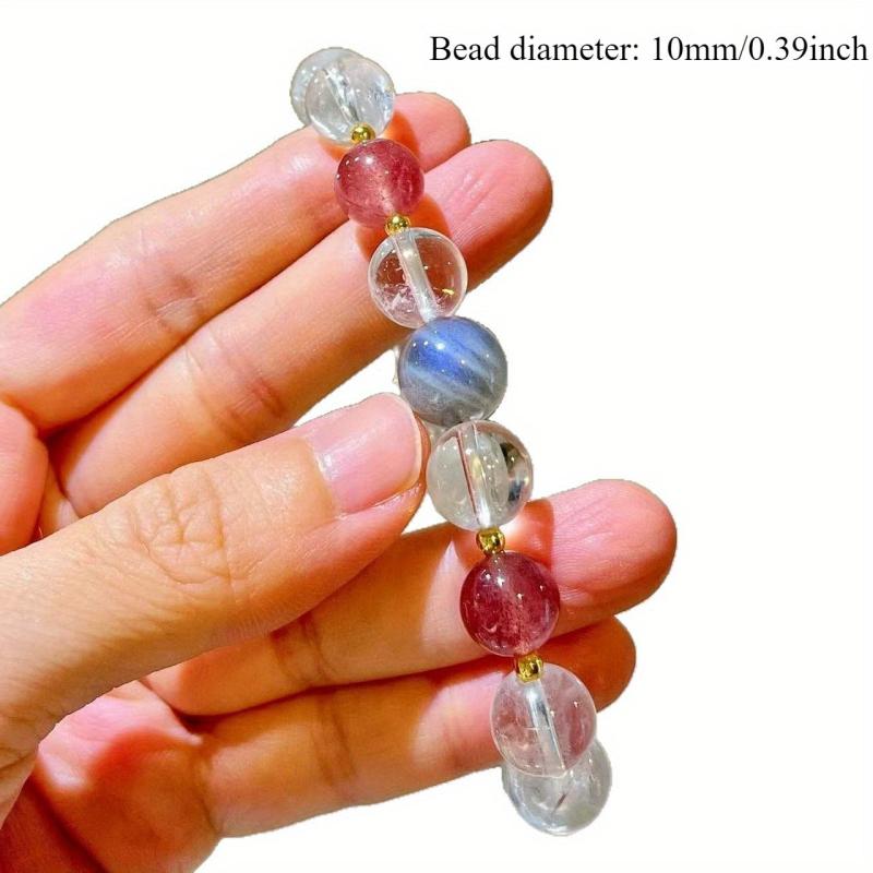 This boho ethnic chakra bracelet features a 10mm crystal strand with elegant pink and gray moonstone beads. Perfect for adding a touch of spirituality to your style.