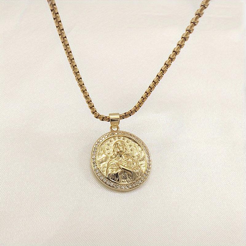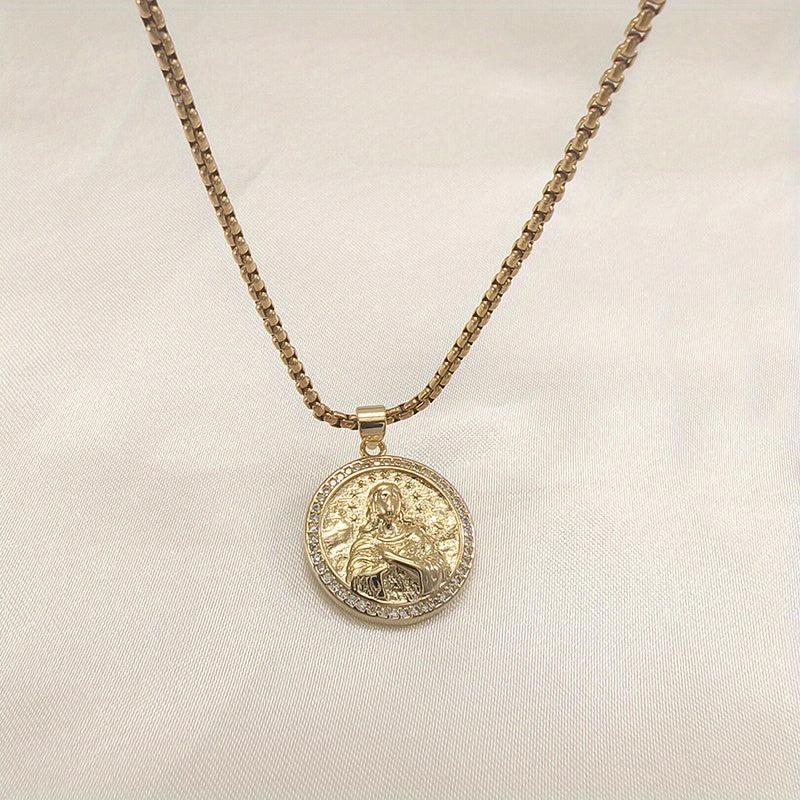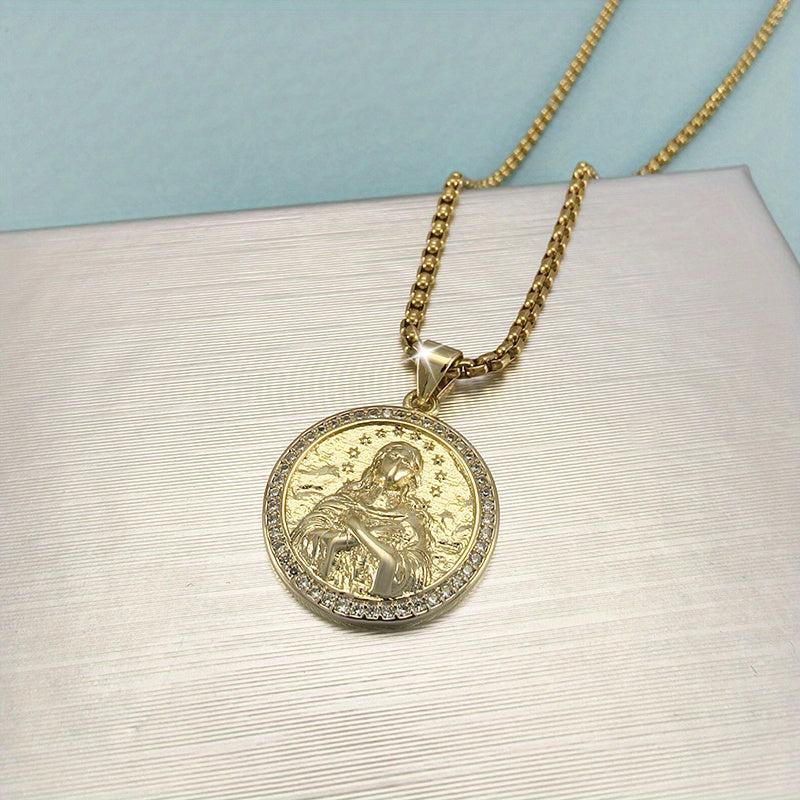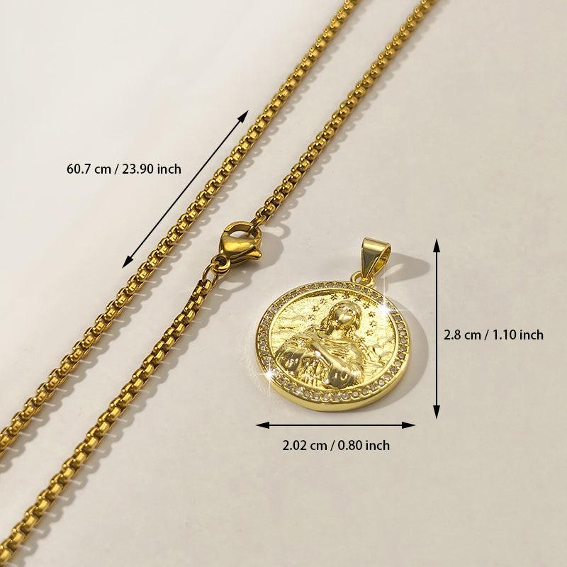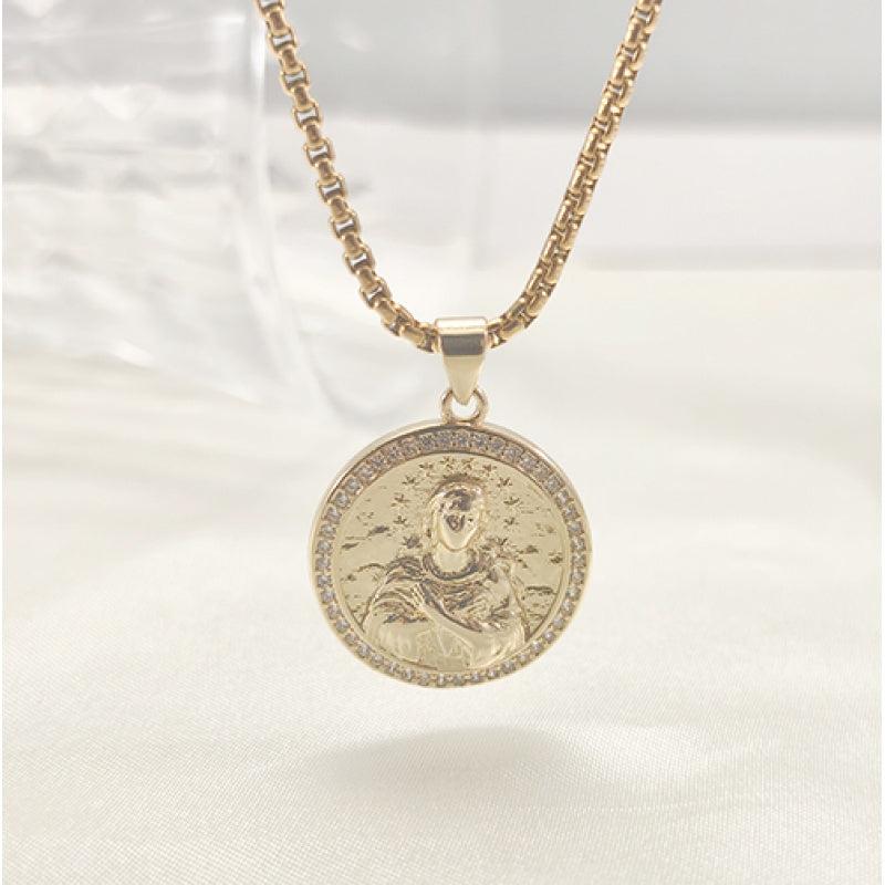 Elegant vintage-inspired necklace with round synthetic zirconia Mary pendant. Perfect for daily wear or special occasions.