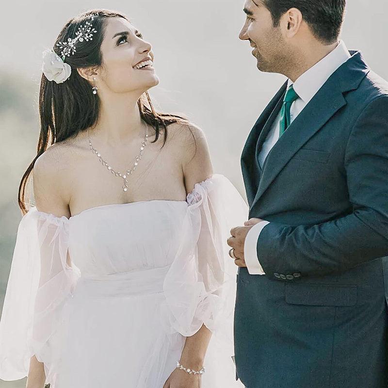 This elegant prom jewelry set includes a synthetic pearl drop necklace, earrings, bracelet, and hair pins adorned with synthetic rhinestones and crystals.
