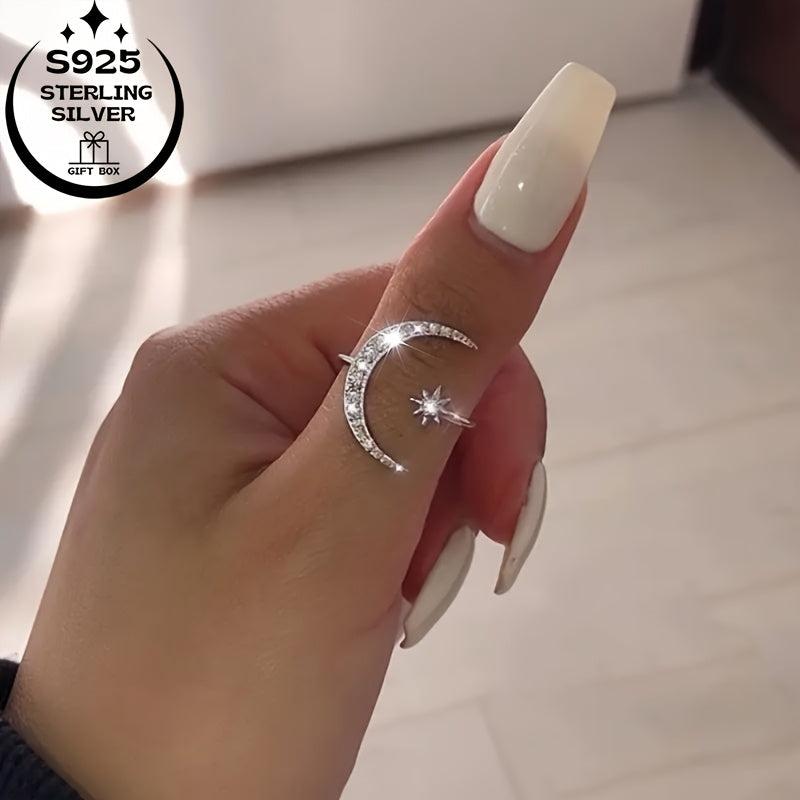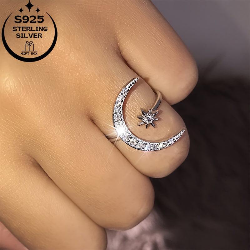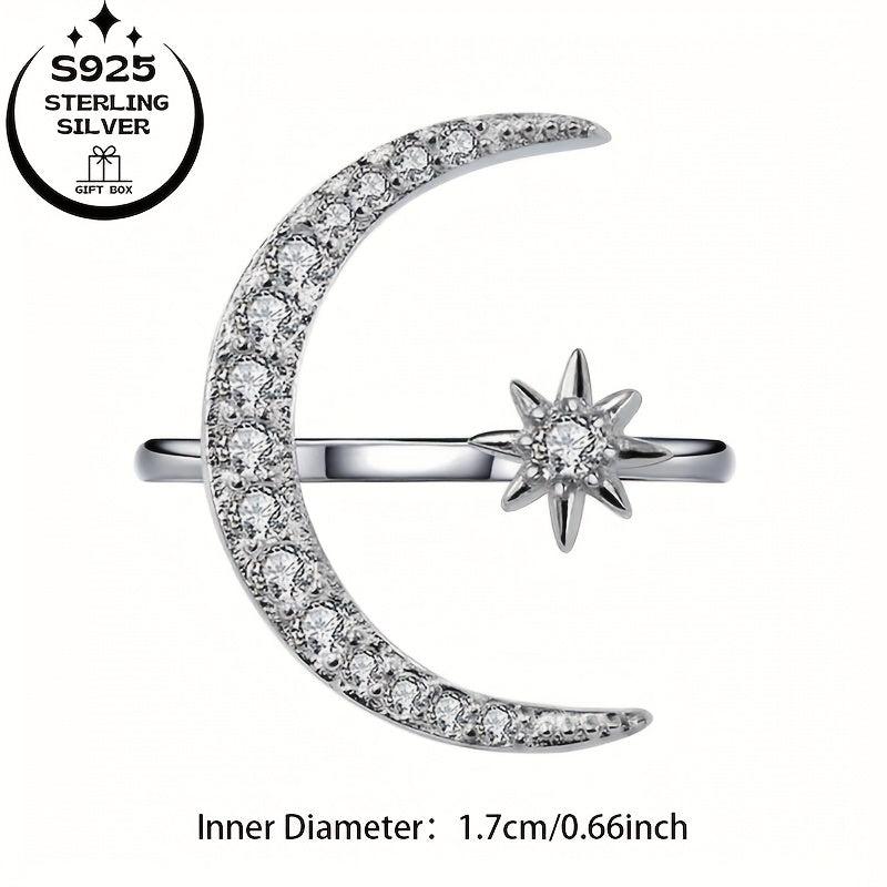 This stunning ring features sparkling synthetic Zirconia stones in a star and moon design. Perfect for anniversaries or special occasions. Comes in a gift box.