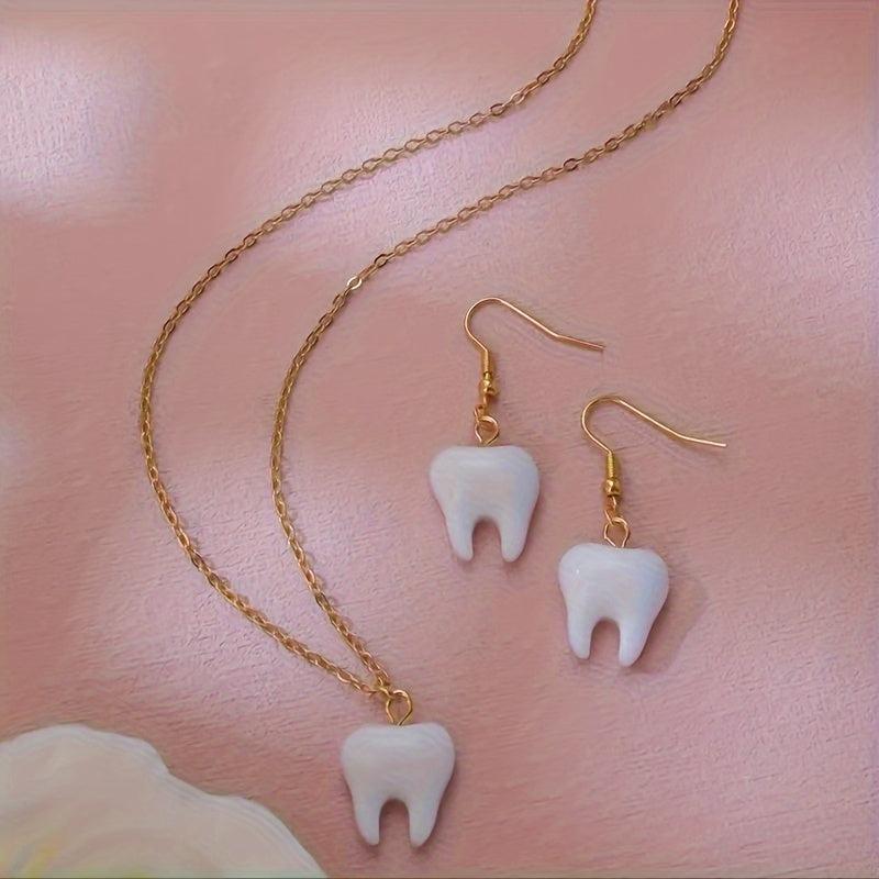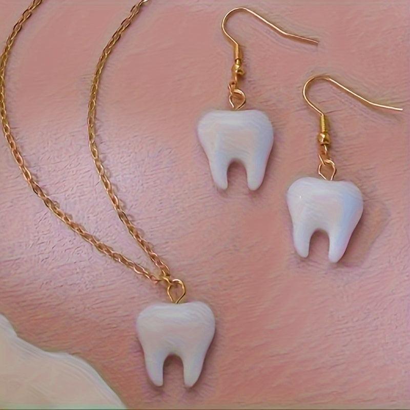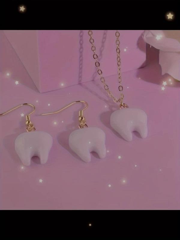 This stylish set features a tooth-shaped acrylic pendant necklace and matching earrings. Perfect for daily wear, this jewelry set is versatile and showcases a trendy design that is sure to complement any outfit.