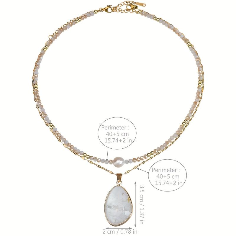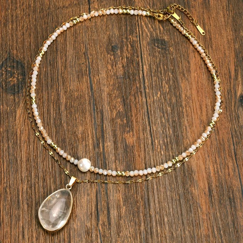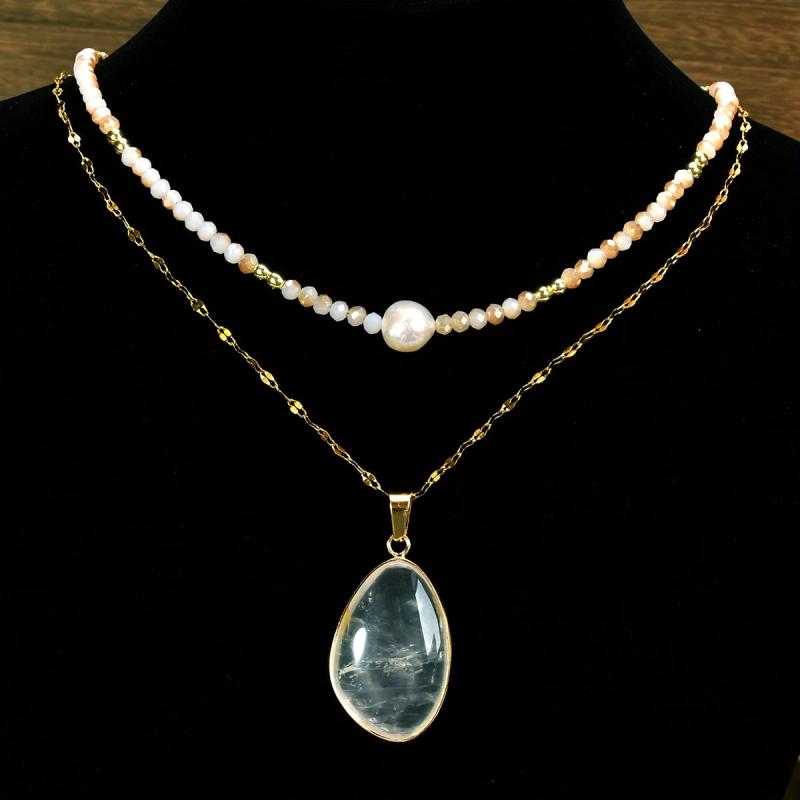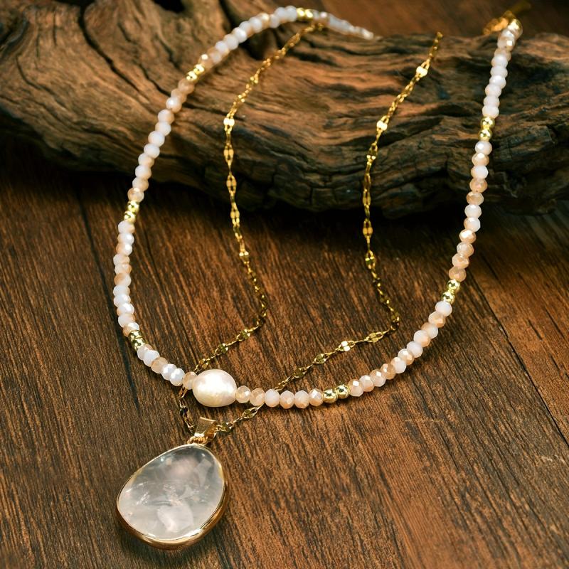 Two-piece set featuring a baroque freshwater pearl necklace and a quartz pendant necklace, perfect for a bohemian summer look.