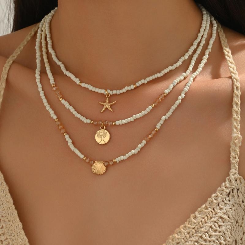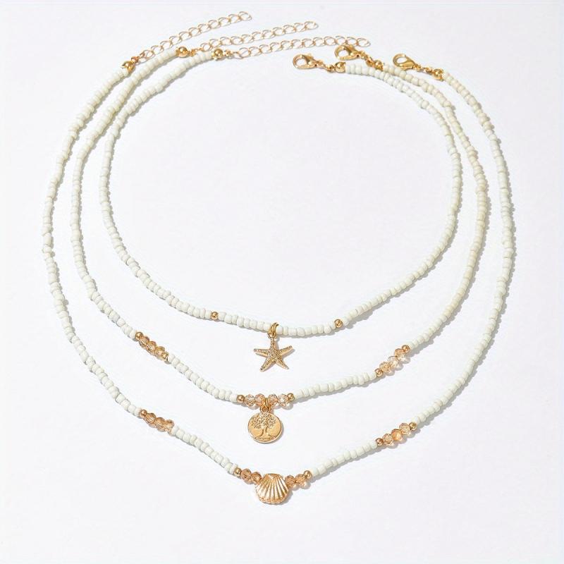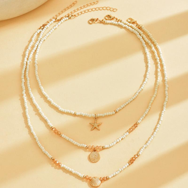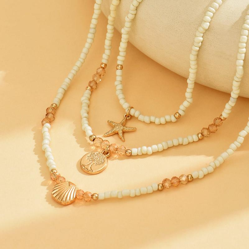 Enhance your summer beach look with this bohemian style necklace set featuring life tree and starfish pendants. Made of beige beaded round glass beads.