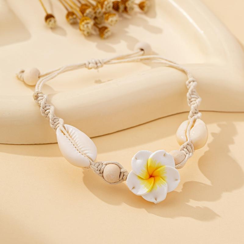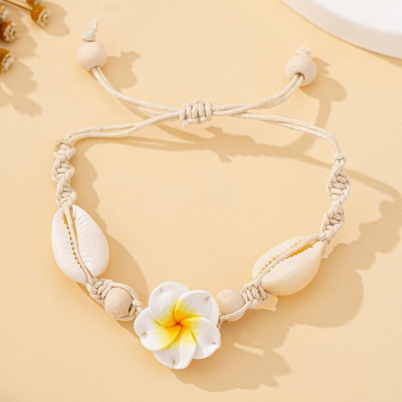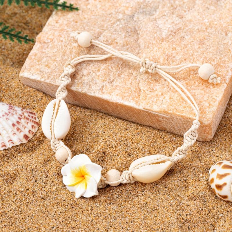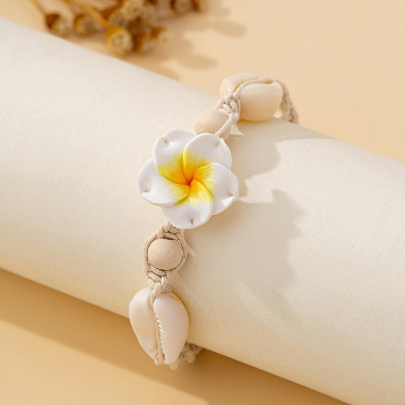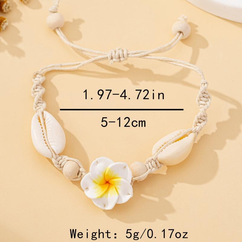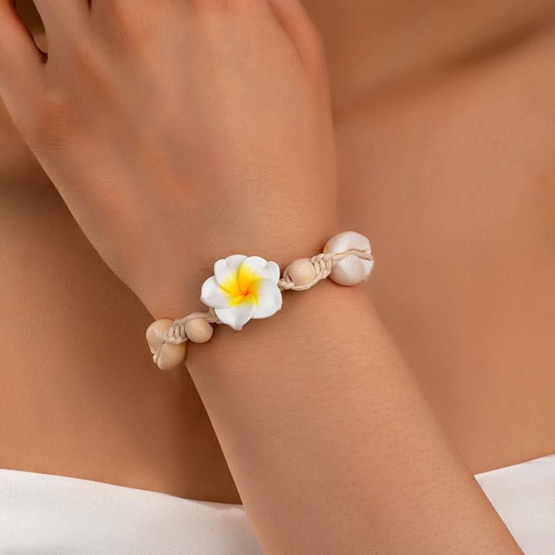 Add a touch of bohemian charm to your outfit with this stylish clay flower bracelet featuring cowrie shell accents. Perfect for both daily wear and vacation.