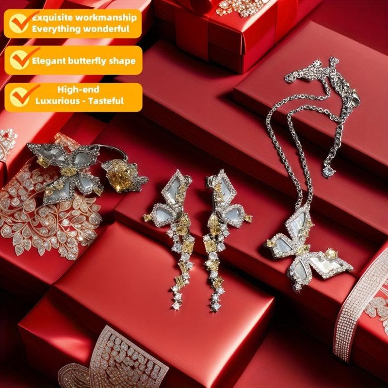 Elegant jewelry set featuring a butterfly pendant necklace and open ring earrings in yellow with sparkling rhinestones. Perfect for banquets, business engagements, or as a luxurious gift.