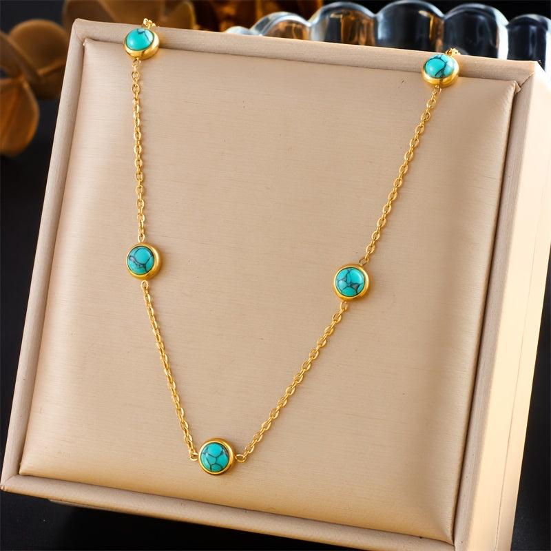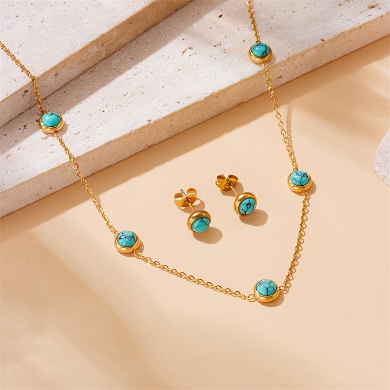 Retro style stainless steel jewelry set perfect for daily wear or party occasions. Includes earrings and necklace with turquoise and golden accents.