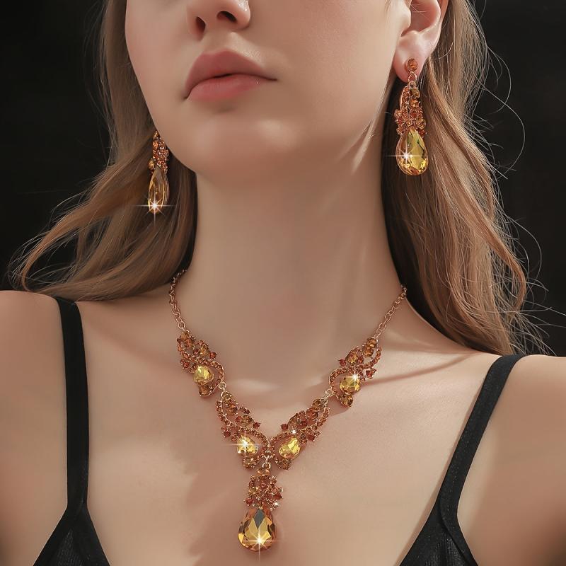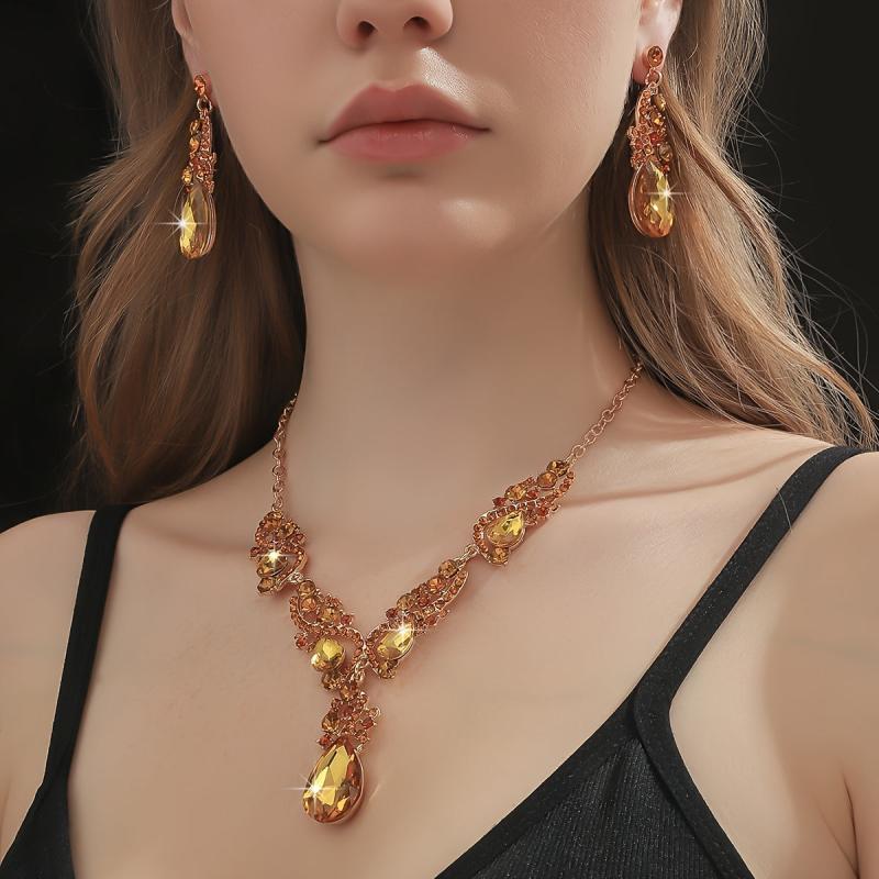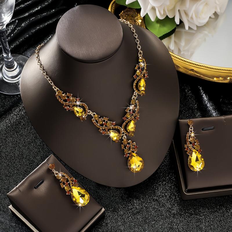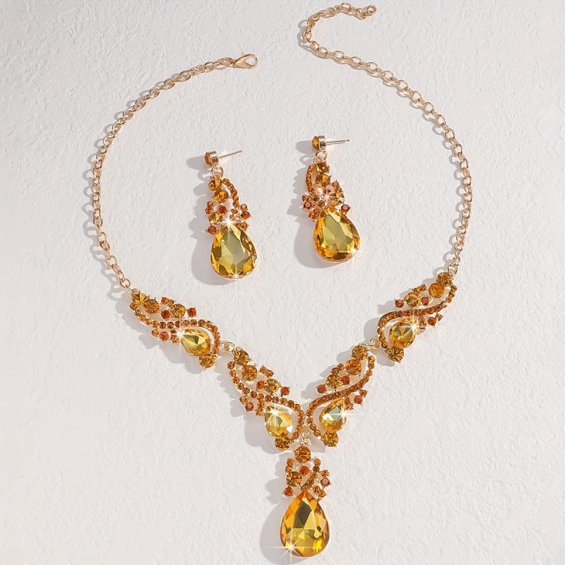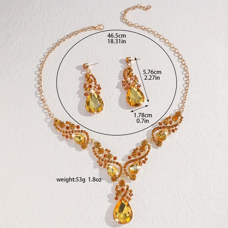 Enhance your party look with this stunning yellow synthetic gemstone teardrop necklace and ring set. Perfect for parties, banquets, or as a gift for someone special.
