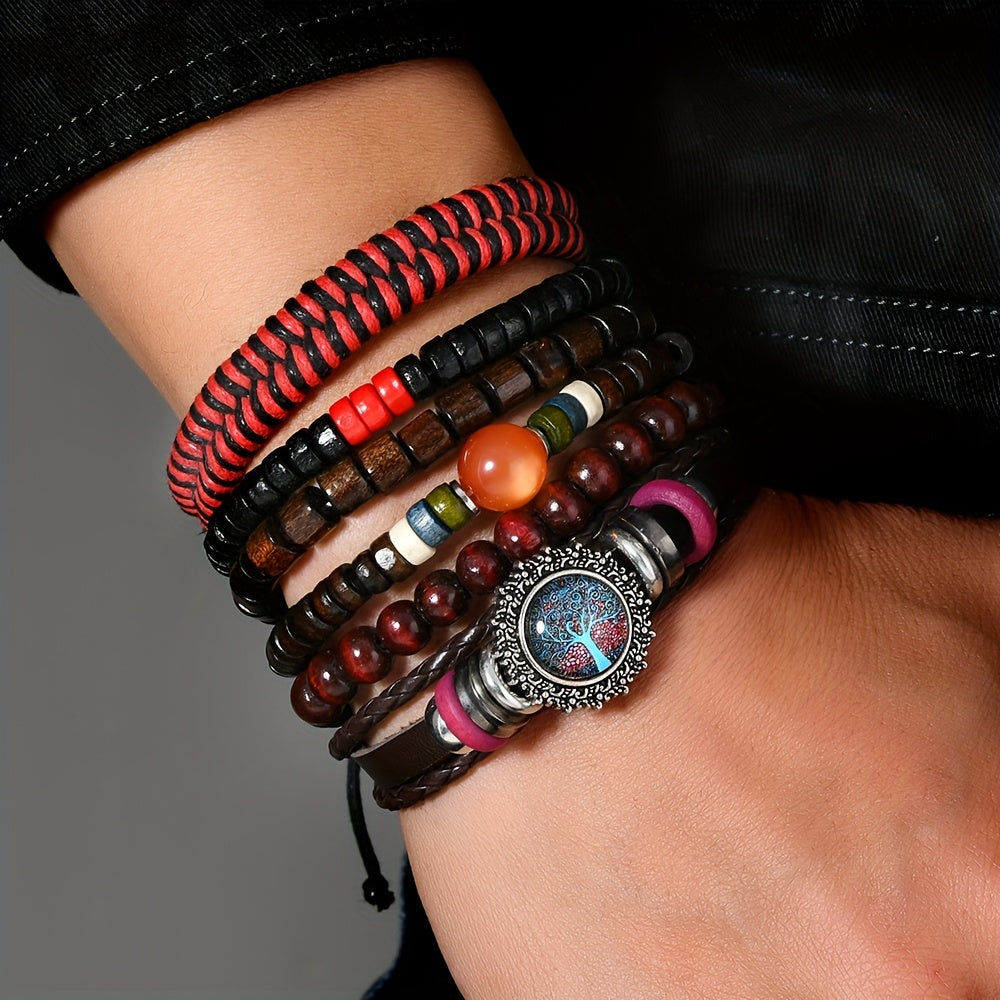 This set includes 6 Gothic retro faux leather bracelets with braided and beaded design. Each bracelet has wooden beads, cat's eye stones, and inlaid glass. The tree of life pattern adds a mystical touch.