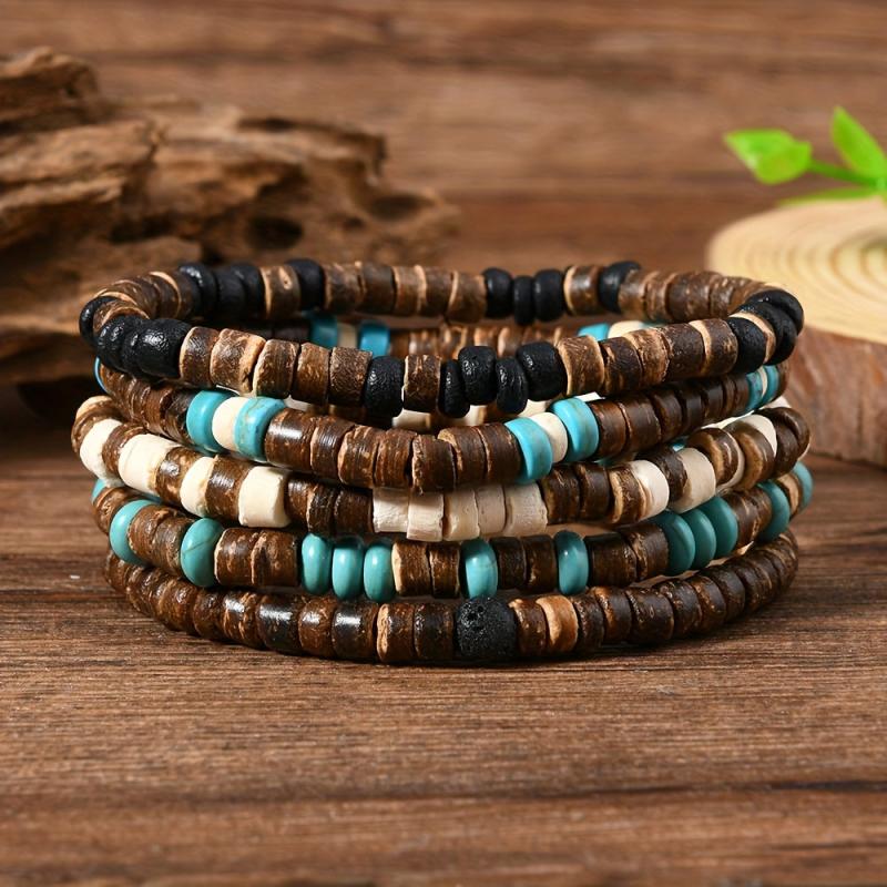 This bracelet set is perfect for men and women who appreciate a tribal and ethnic style. Handmade with adjustable coconut shell beads, it's ideal for yoga practice and daily wear.