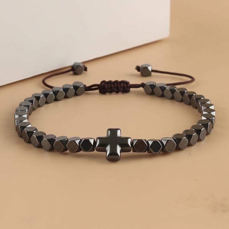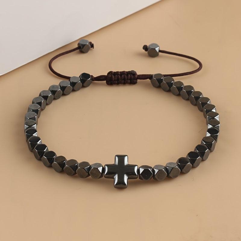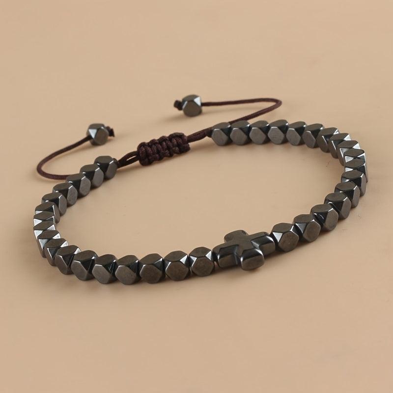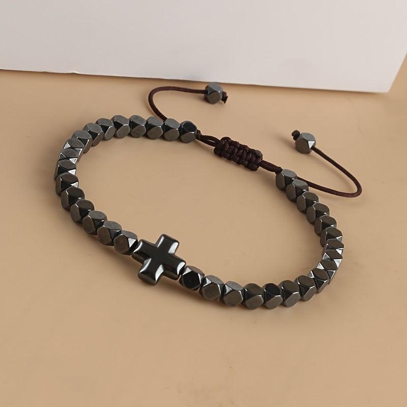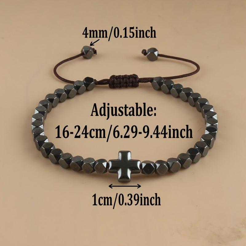 Stylish and adjustable bracelet featuring natural hematite beads and a cross pendant. Ideal gift for Father's Christmas Year Square Beads.