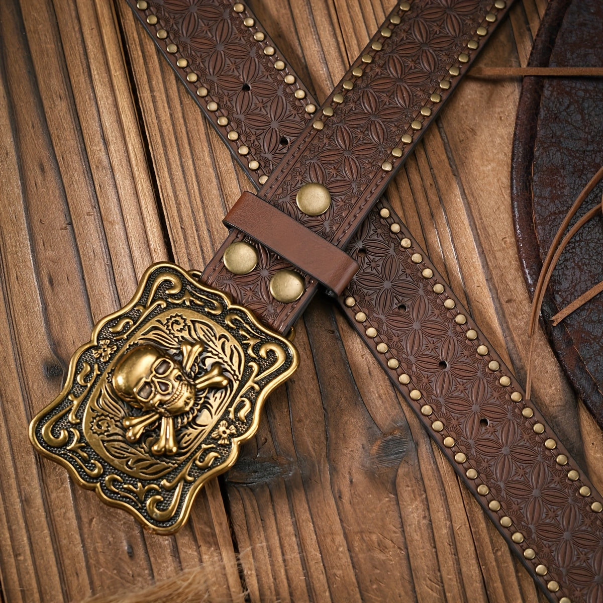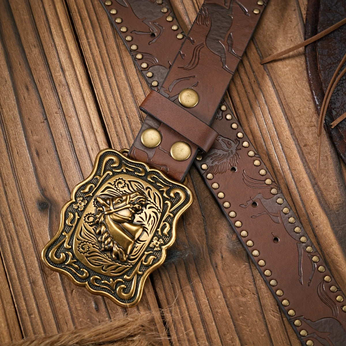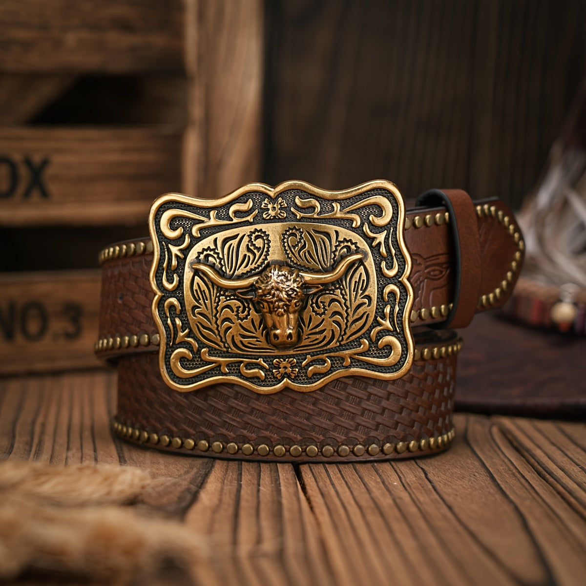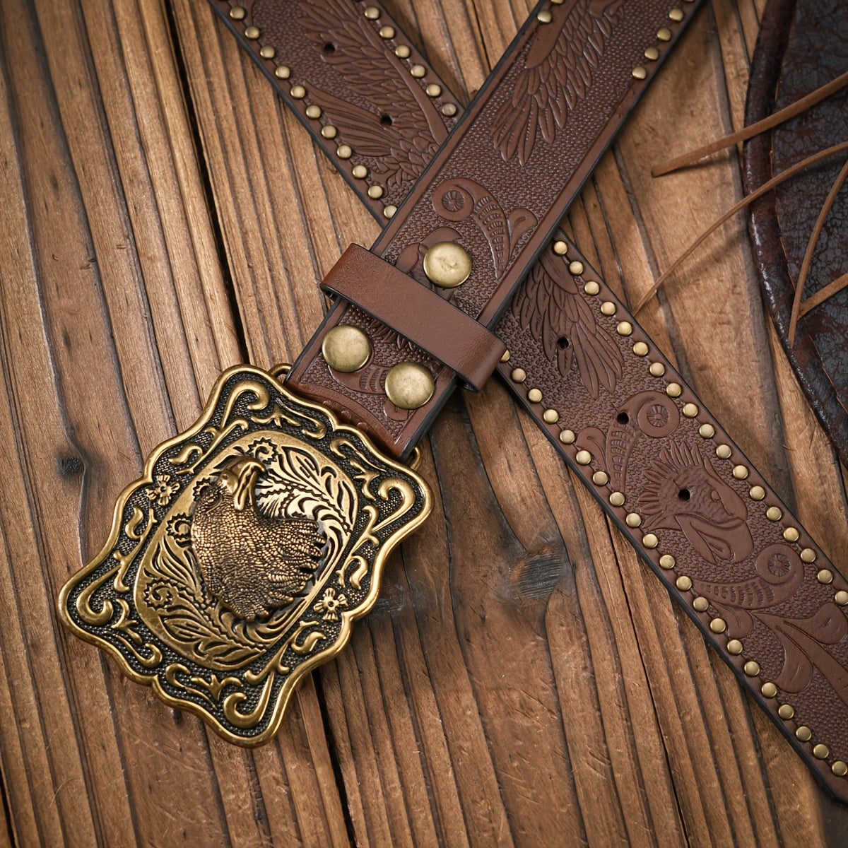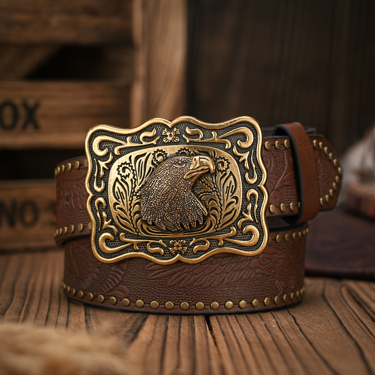 This unisex Western cowboy belt features a vintage brown PU material with an embossed eagle buckle in a golden tone alloy closure. It exudes a bohemian style perfect for casual wear.