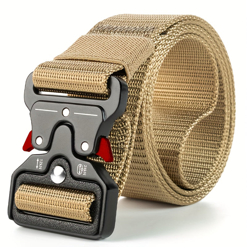 This casual men's belt features a polyester fiber construction with a plastic buckle and rivet details. It provides a quick release mechanism for easy adjustment.