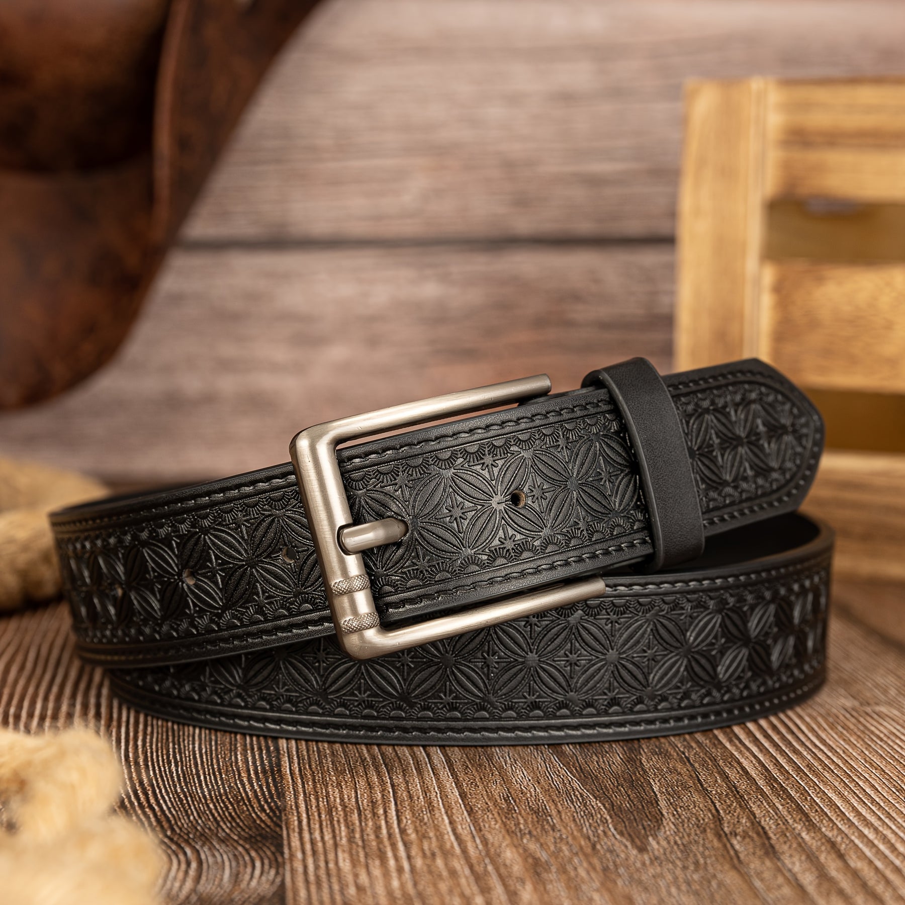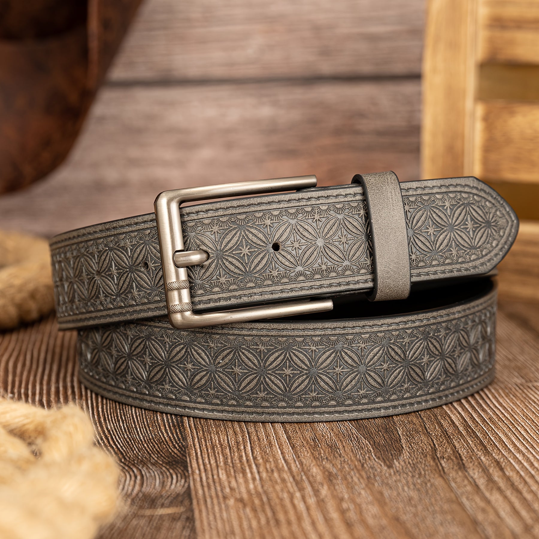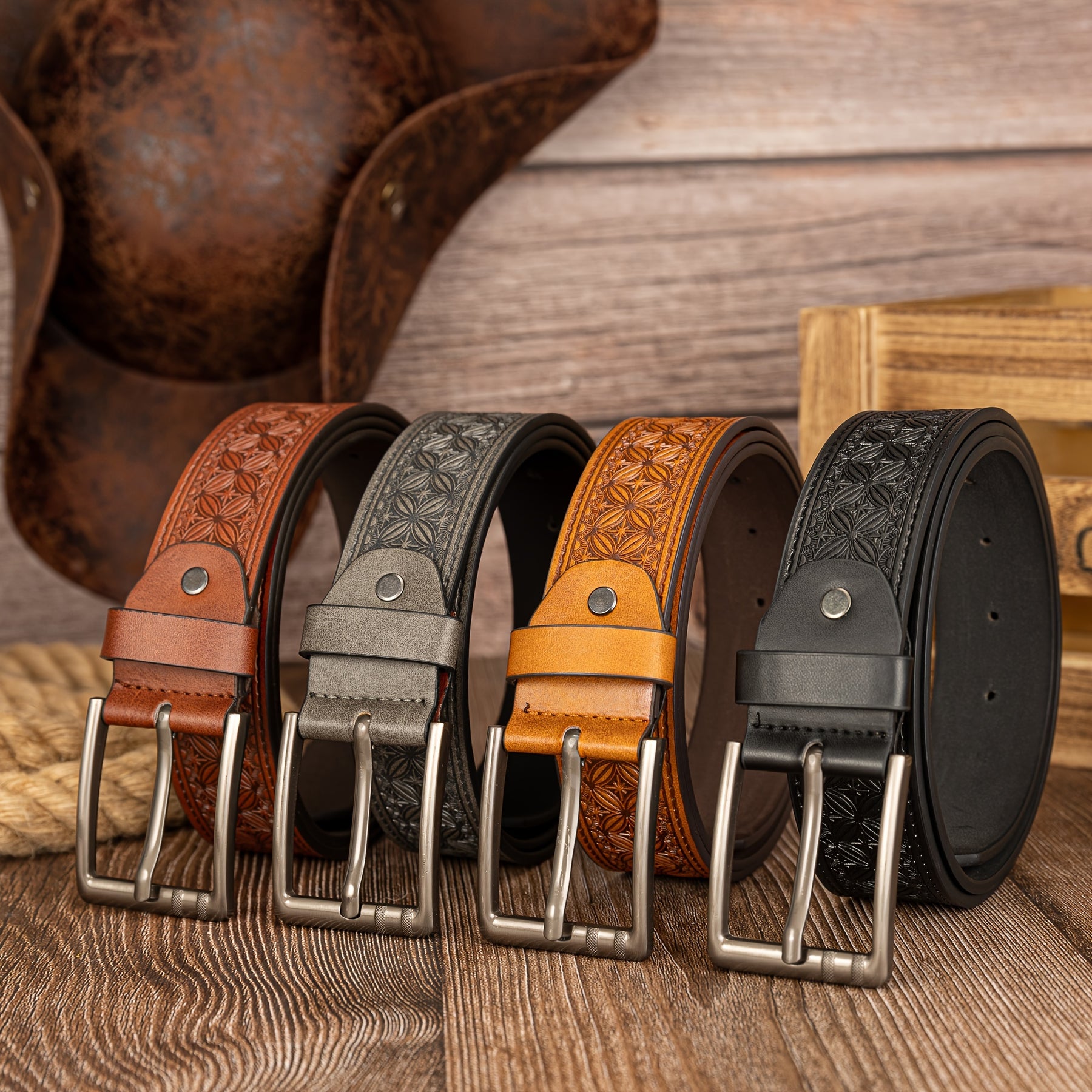 This men's belt features a button buckle design with embossed flower details. Made of high-quality PU material, it offers a casual and stylish look for everyday wear.