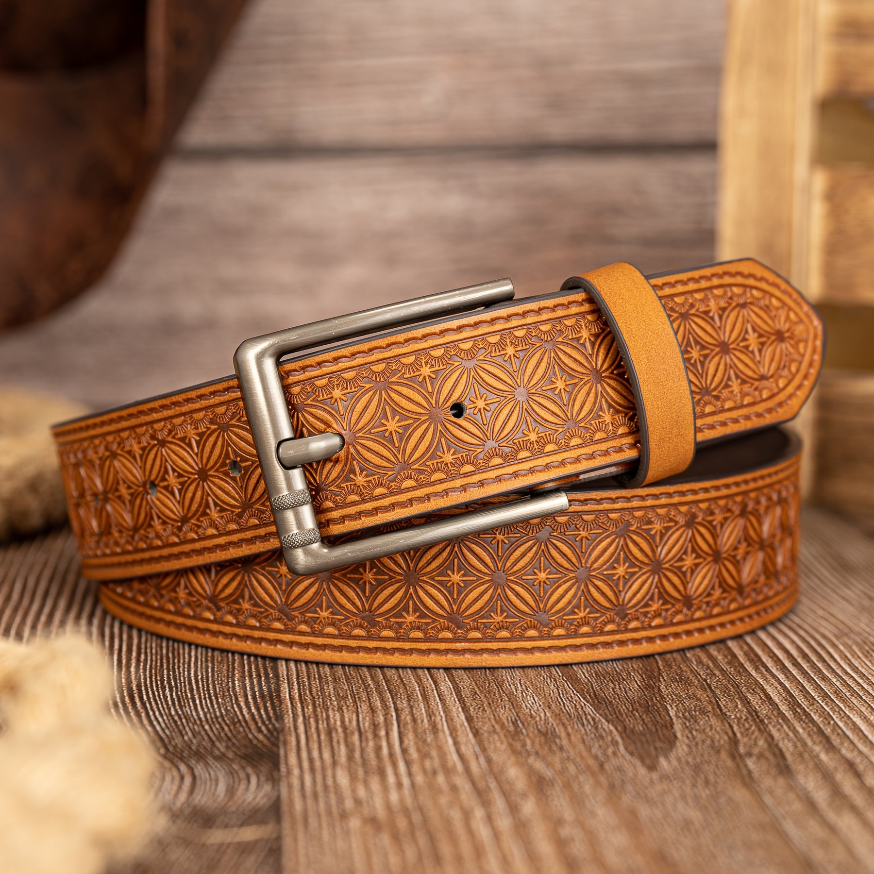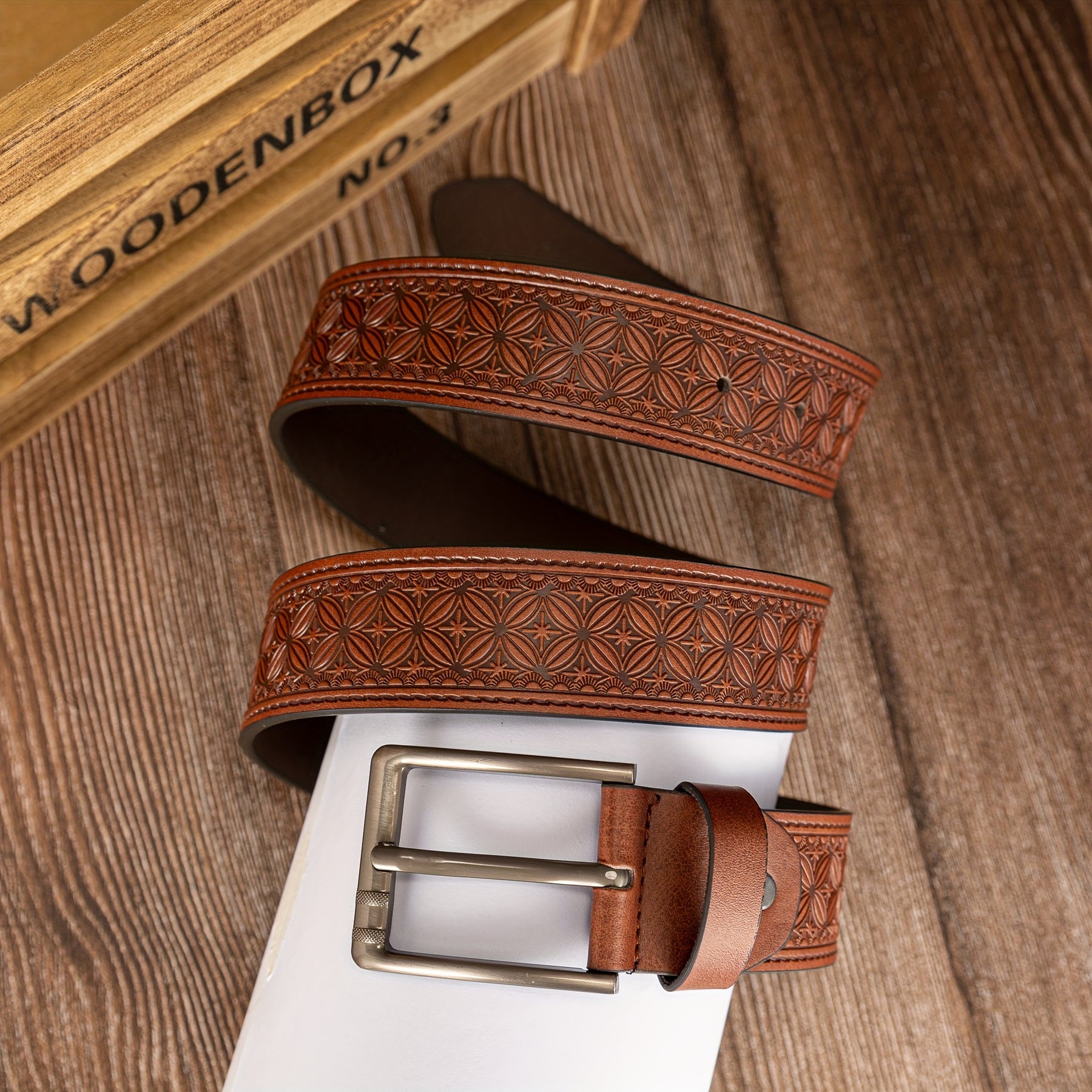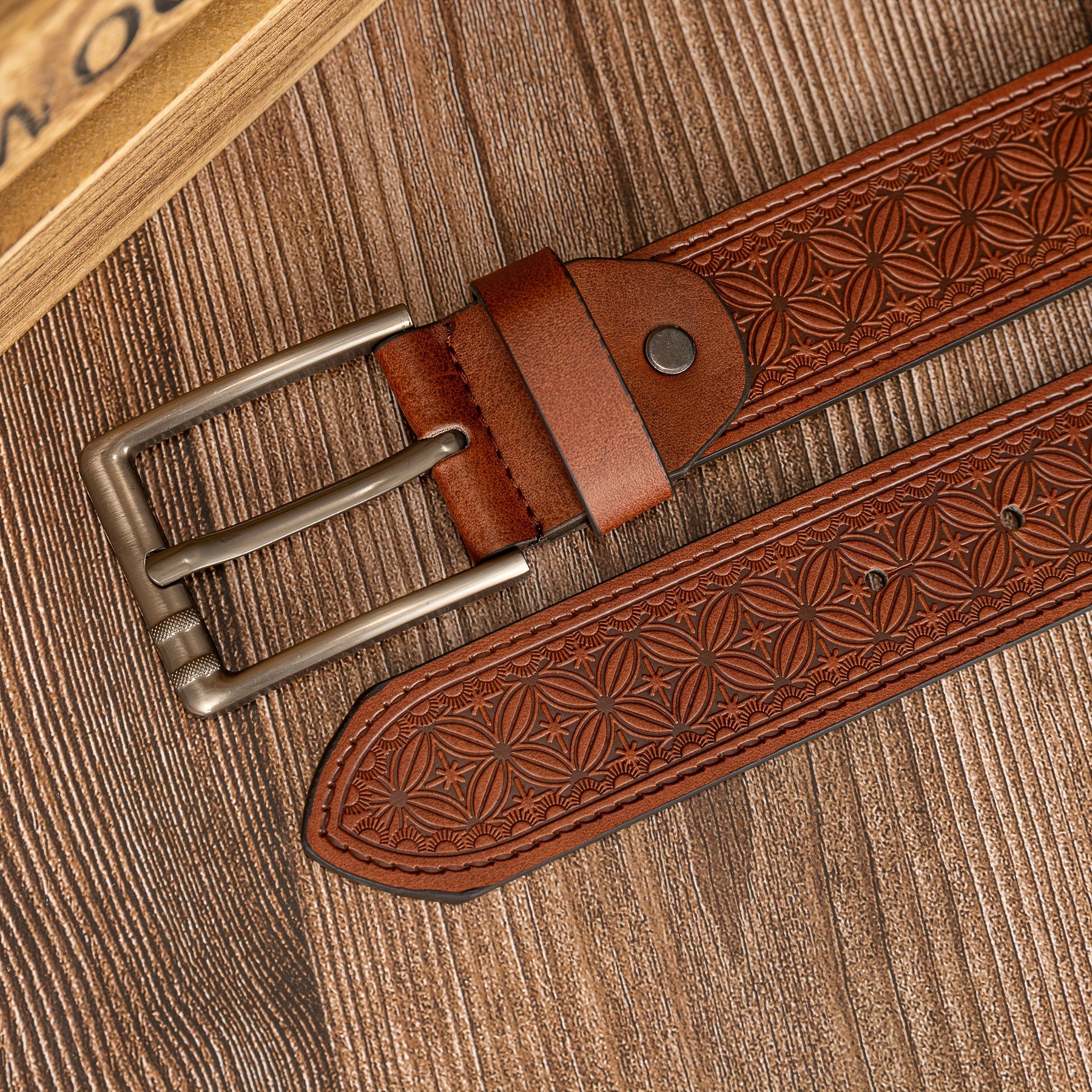 This men's belt features a button buckle design with embossed flower details. Made of high-quality PU material, it offers a casual and stylish look for everyday wear.