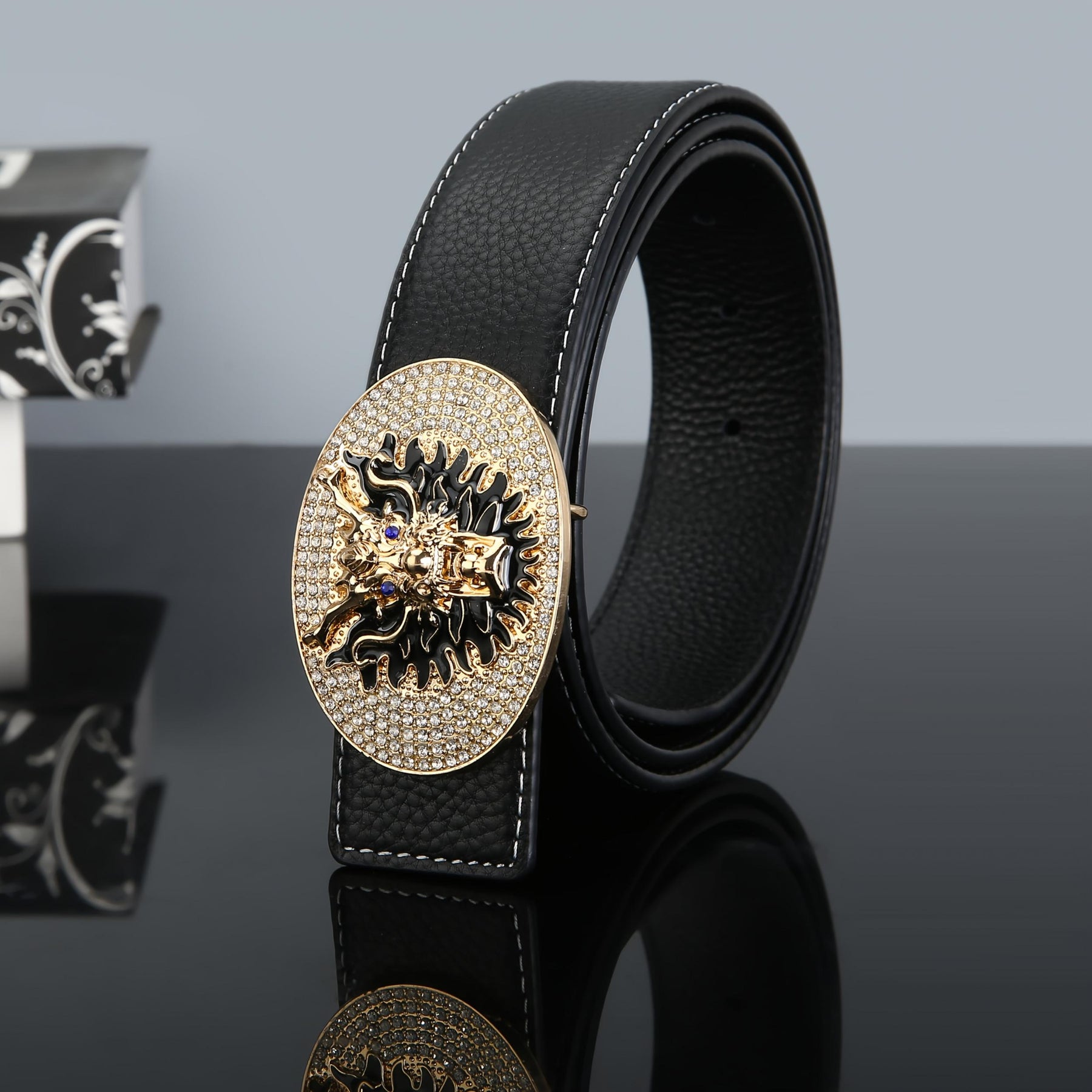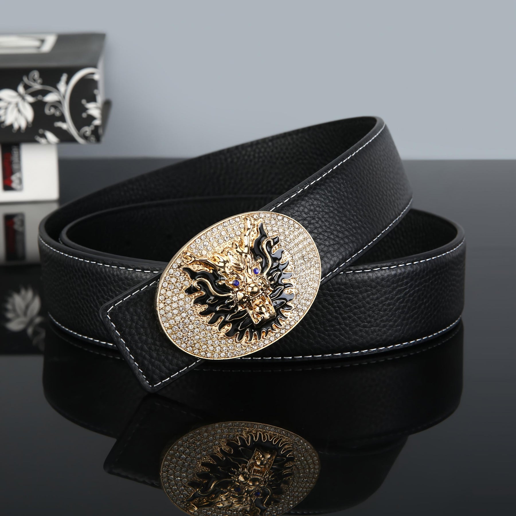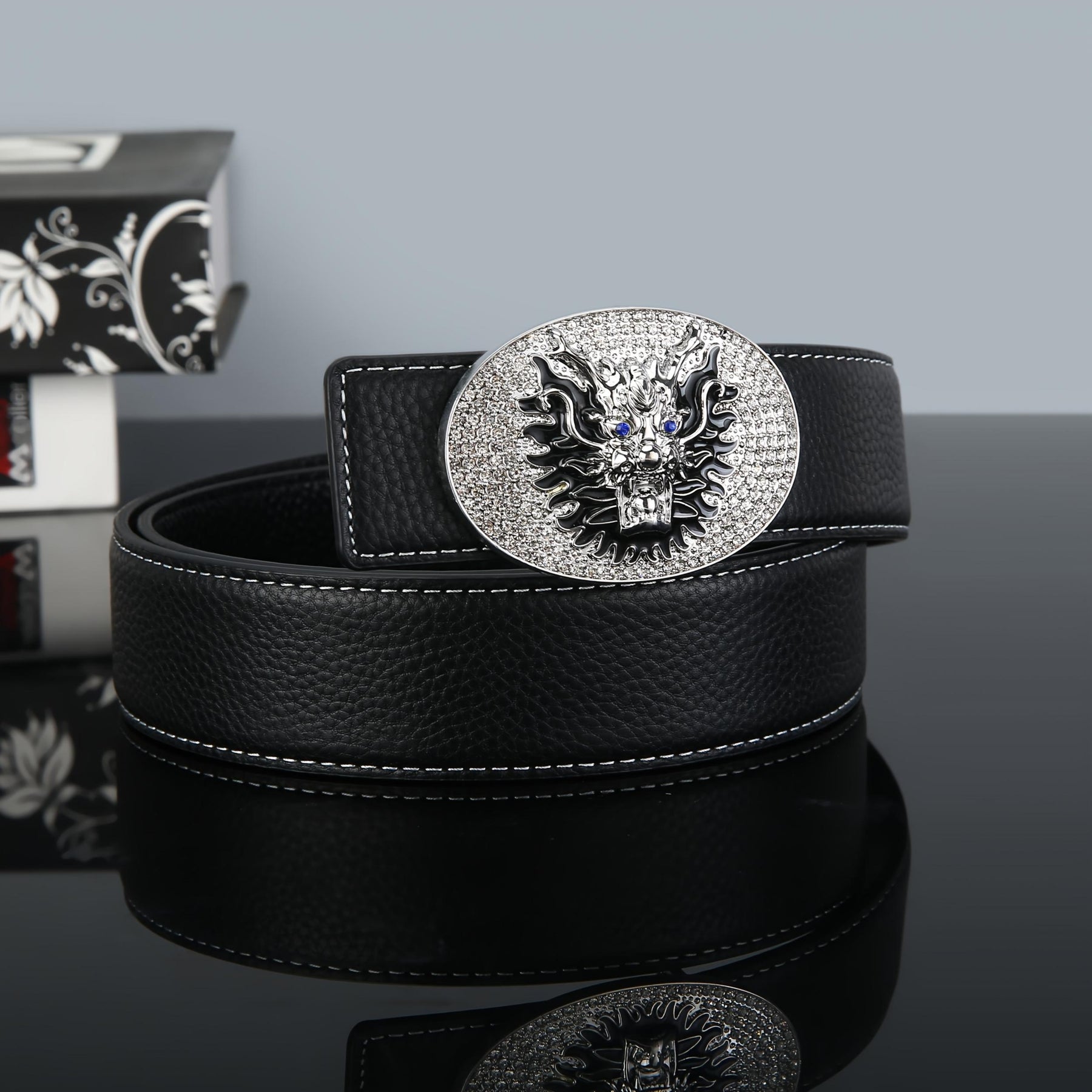 Impress with this luxurious men's leather belt featuring a diamond studded dragon head buckle. Made from top layer cowhide, the belt is 3 inches wide and perfect for a Christmas or year gift.