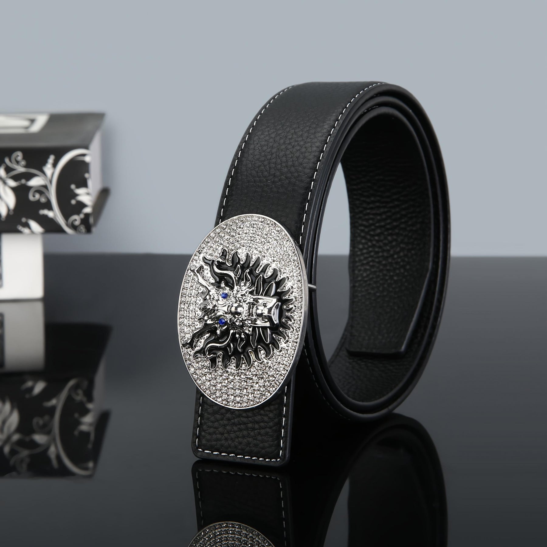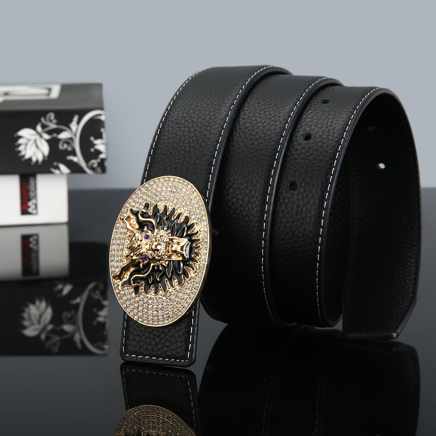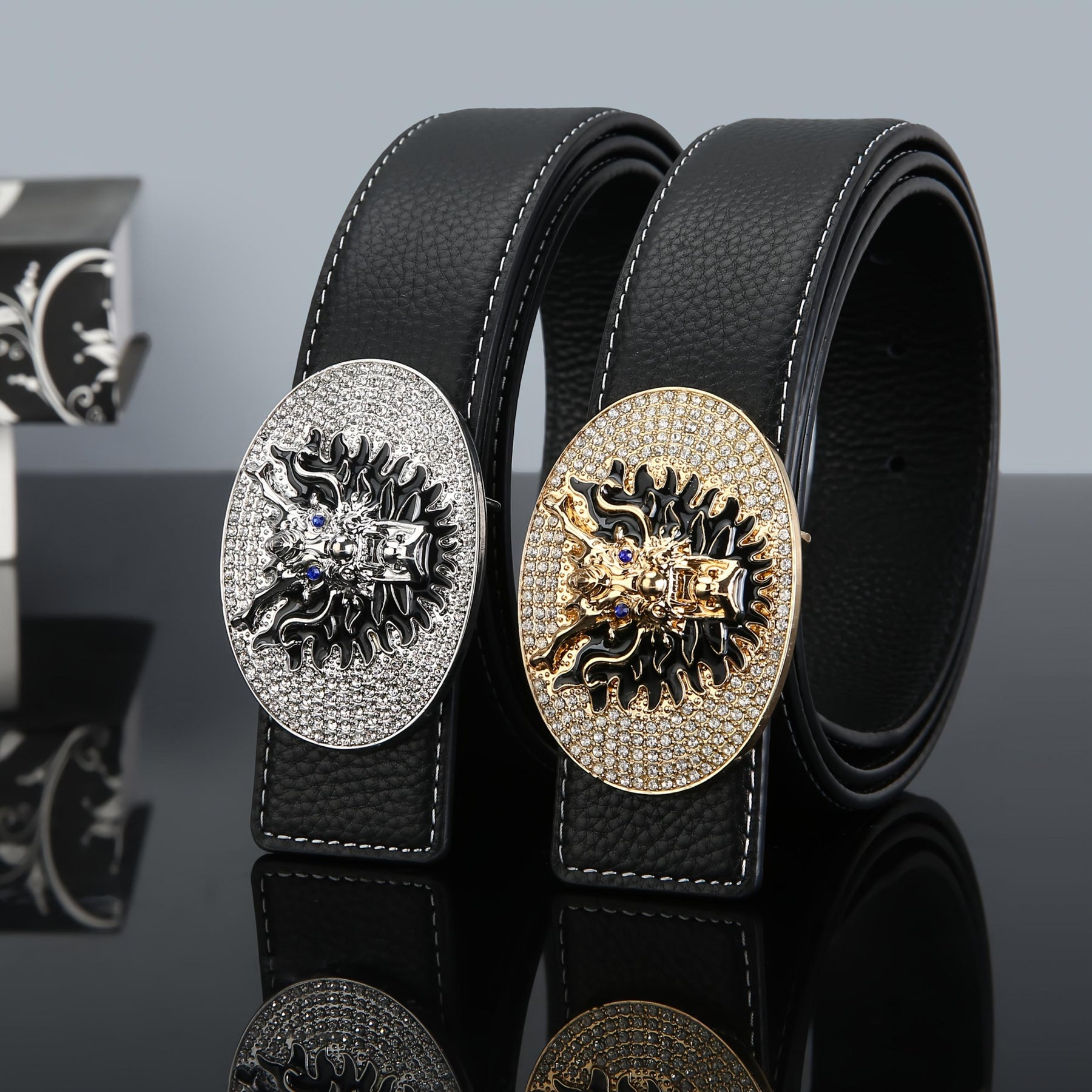 Impress with this luxurious men's leather belt featuring a diamond studded dragon head buckle. Made from top layer cowhide, the belt is 3 inches wide and perfect for a Christmas or year gift.