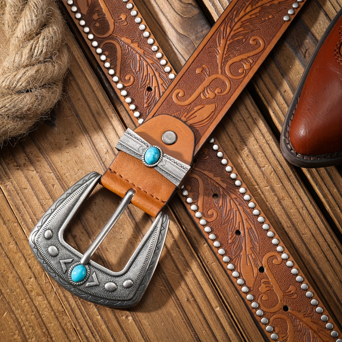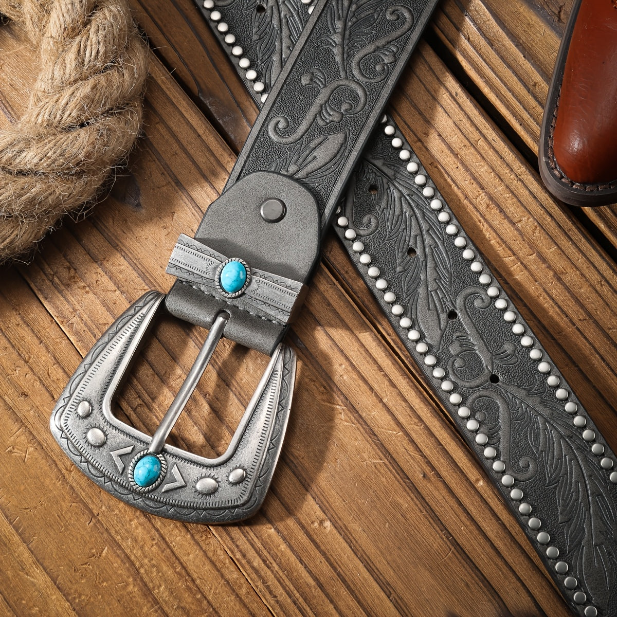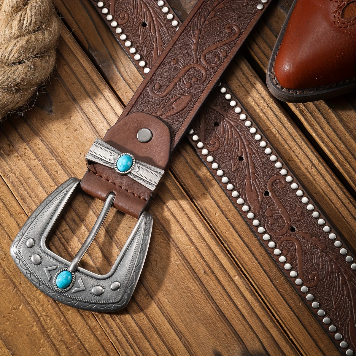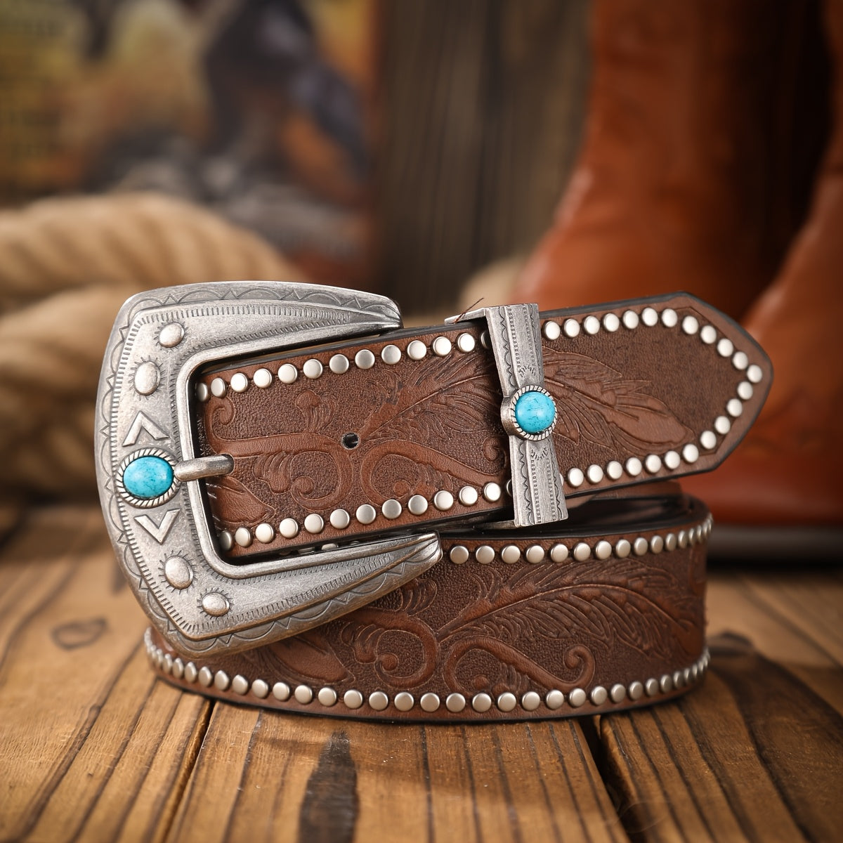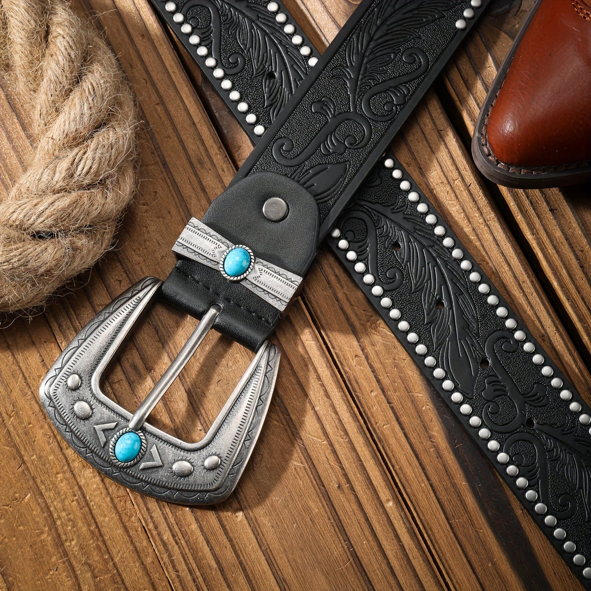 Vintage inspired belt featuring embossed rivets, rhinestone accents, and a durable faux leather construction. Suitable for both men and women.