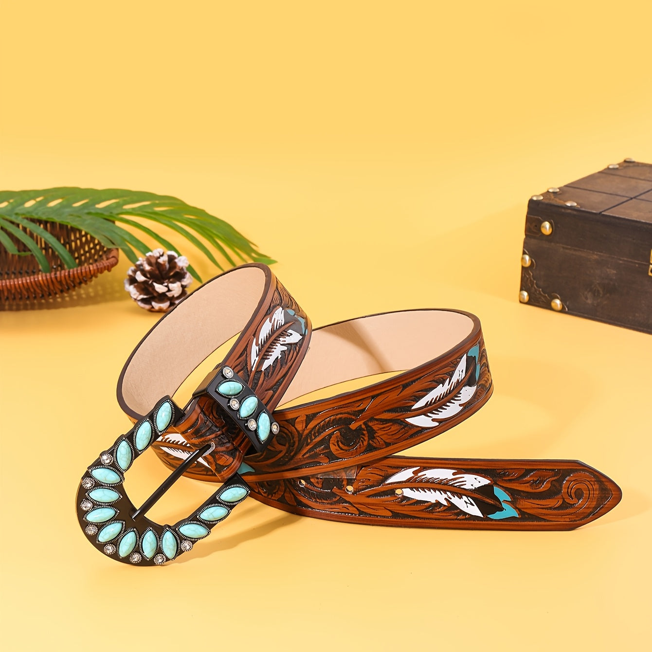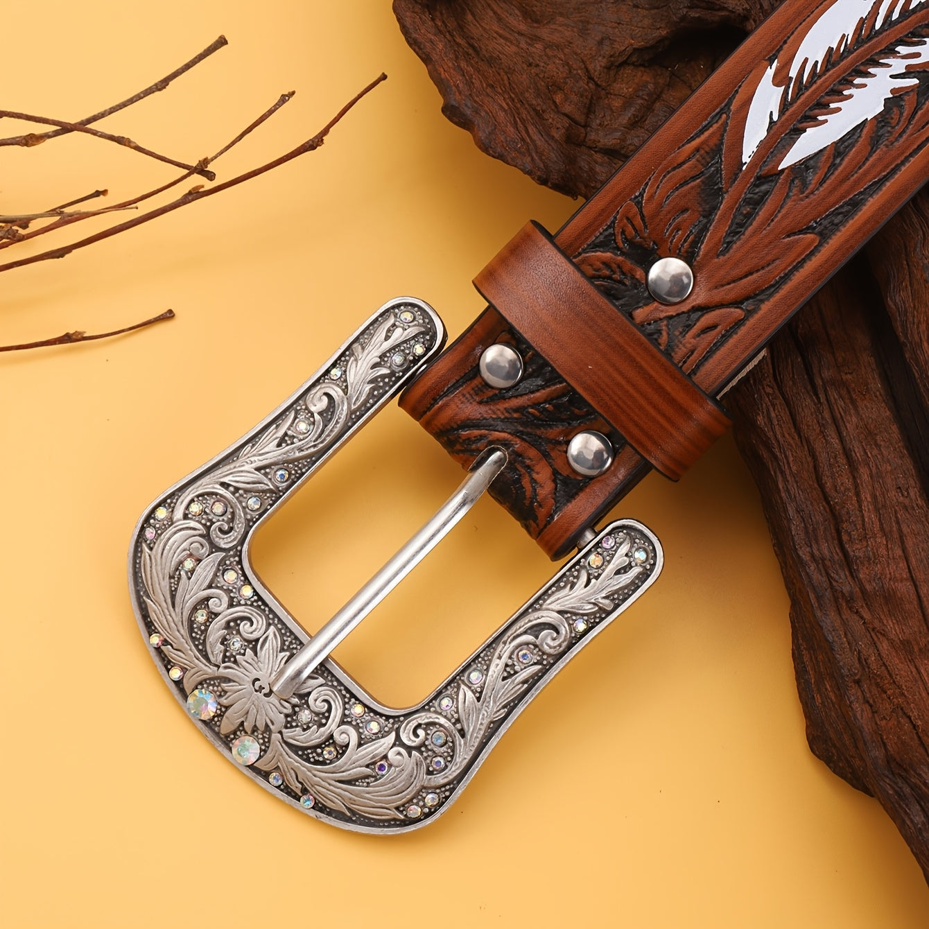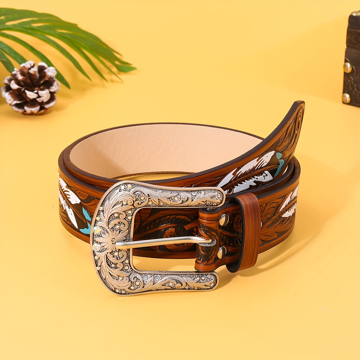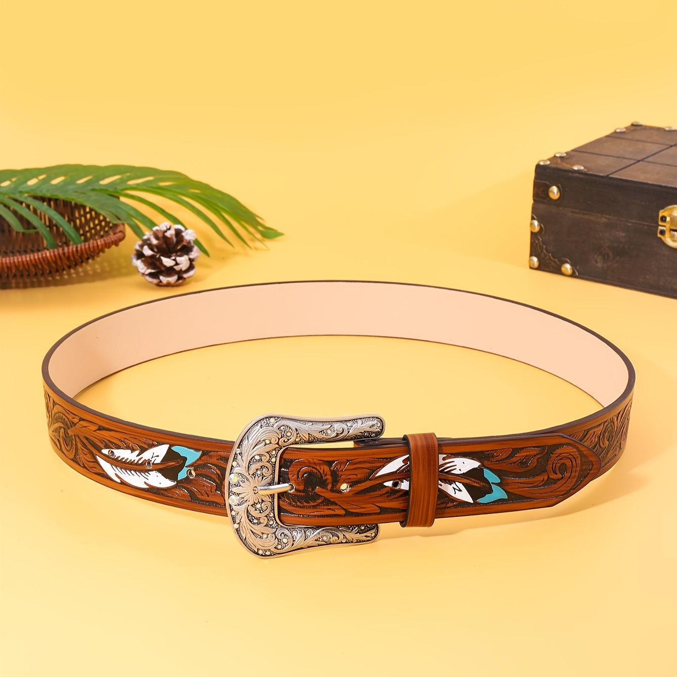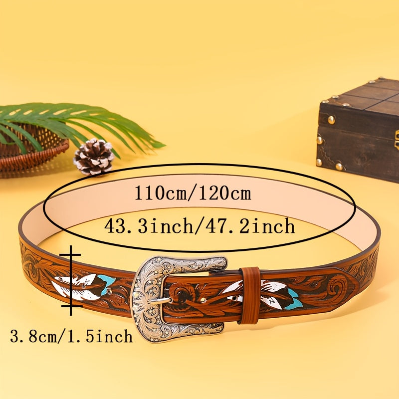 Upgrade your street style with this unisex belt featuring an embossed feather detail. The alloy square buckle adds a touch of edge, while the faux leather strap offers versatility for casual wear.