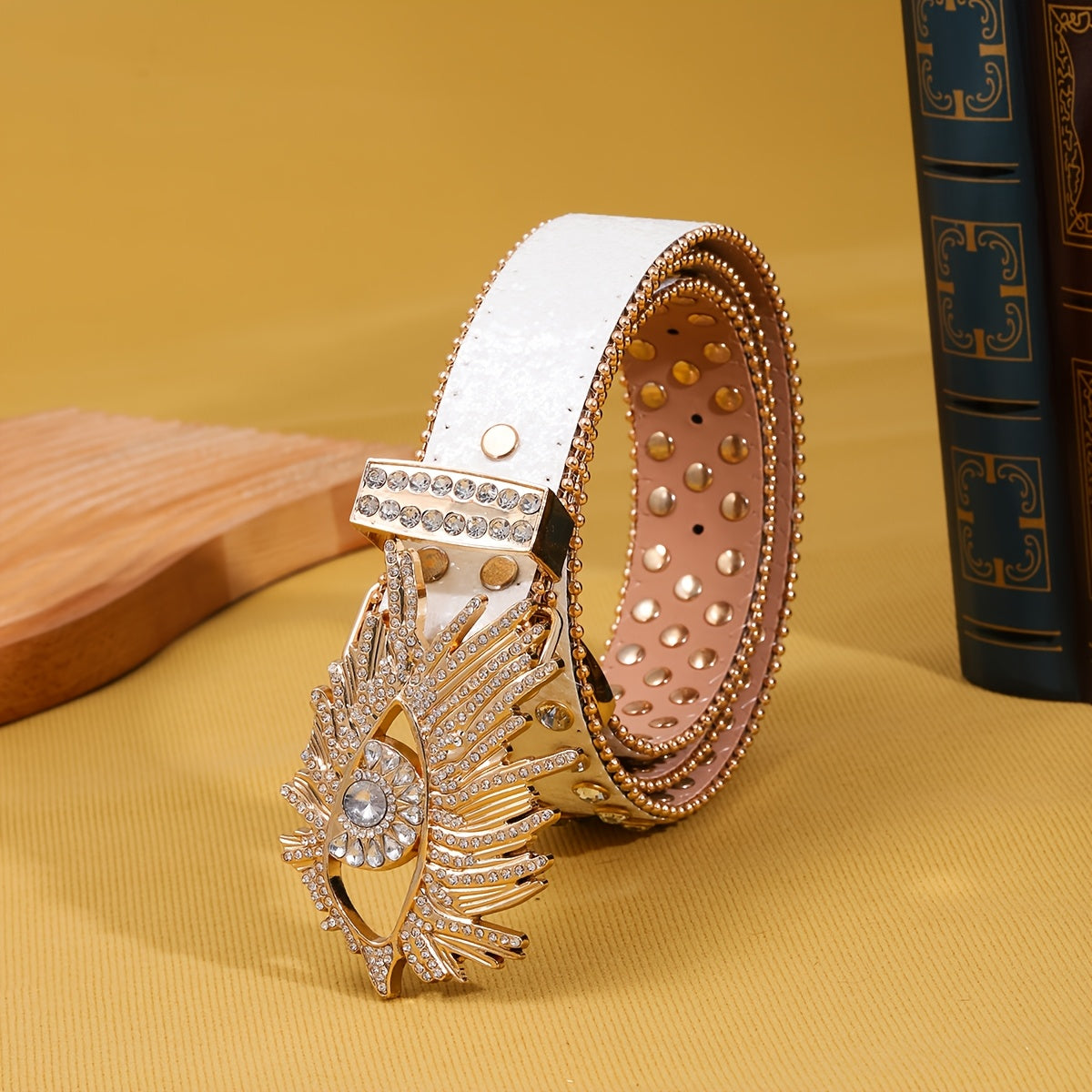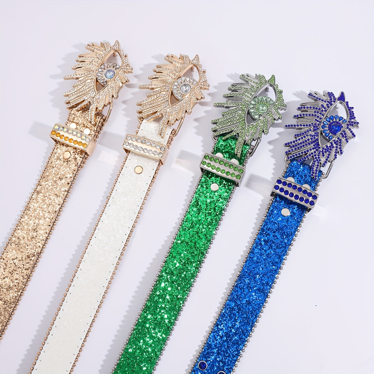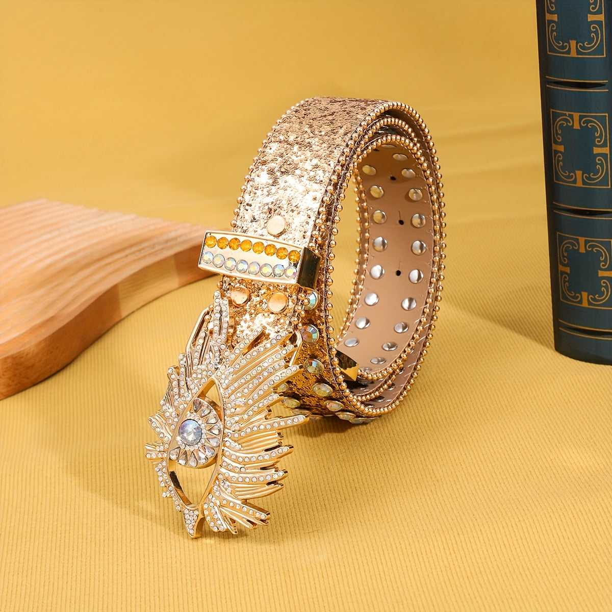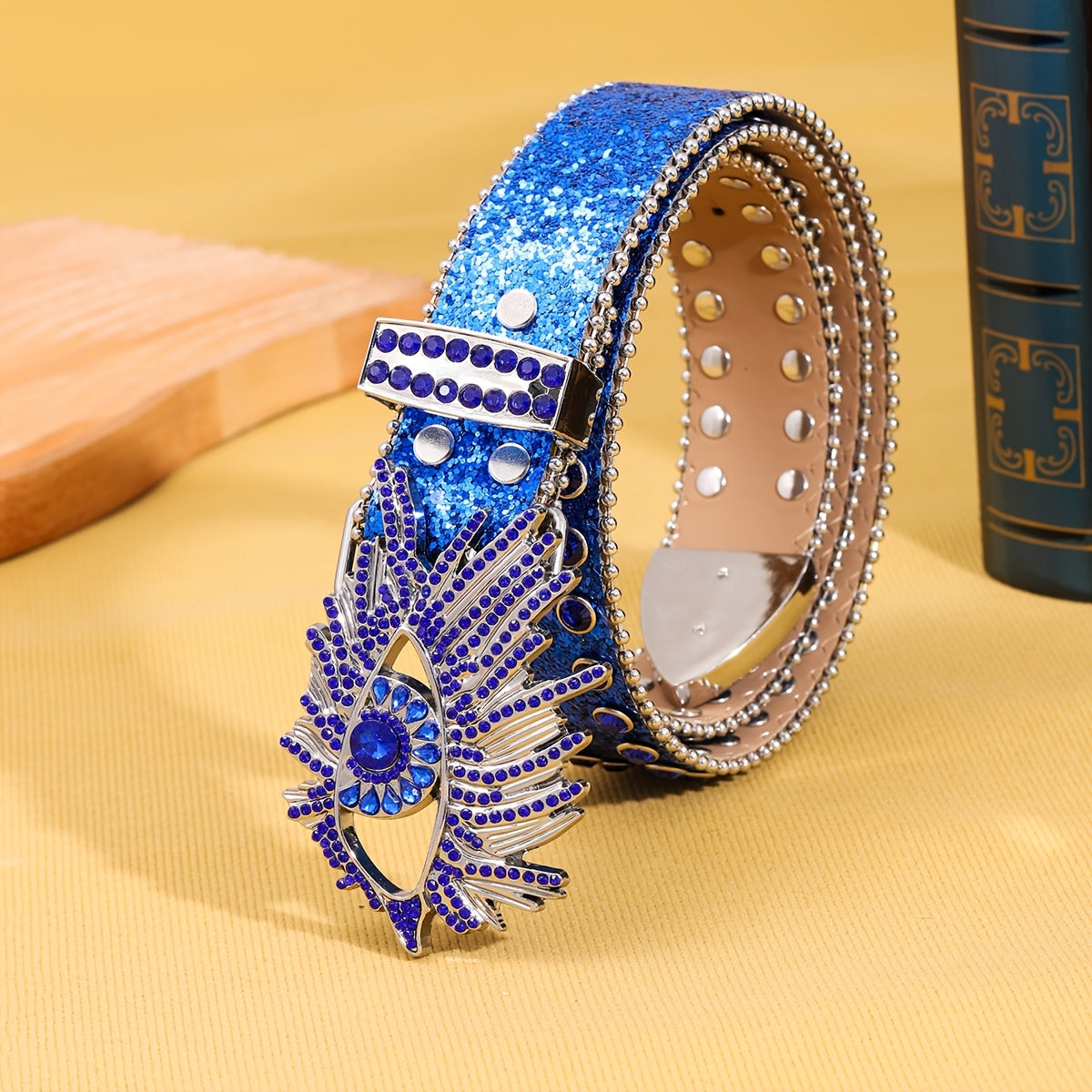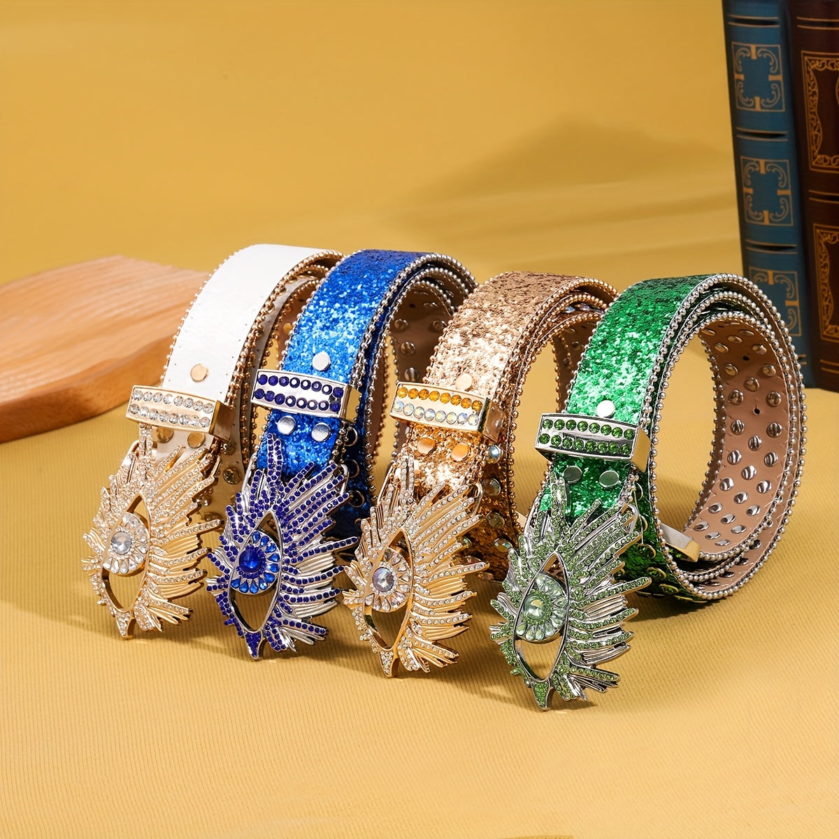 Add some sparkle to your outfit with this dazzling flamingo belt featuring rhinestones, sequins, and studs. Perfect for Valentine's Day or any special occasion.