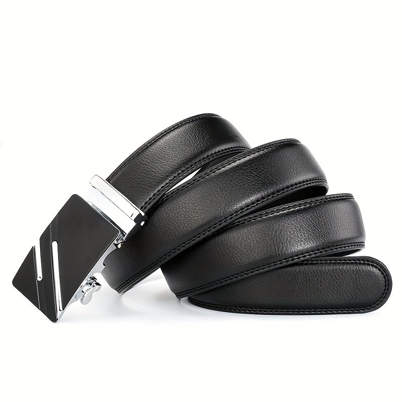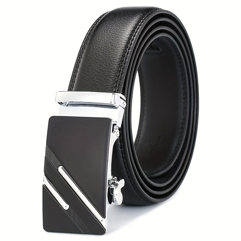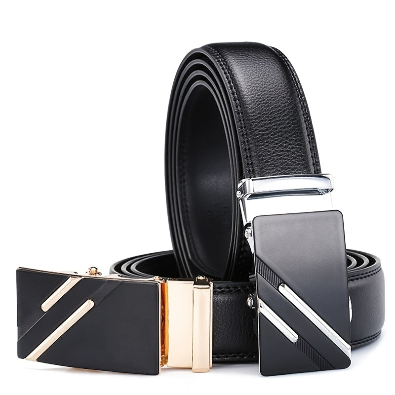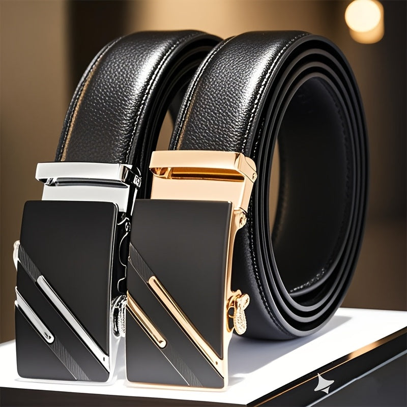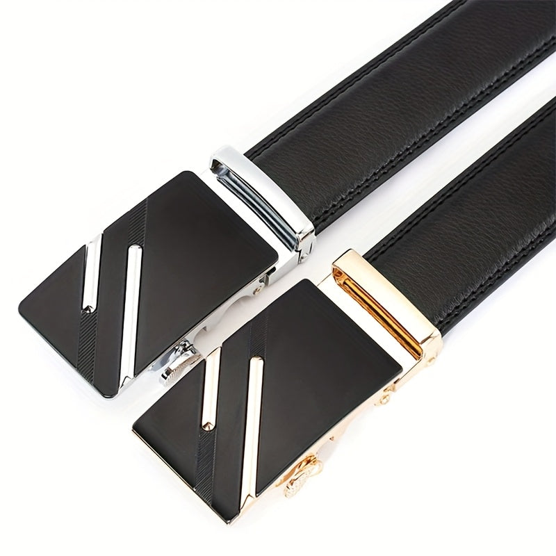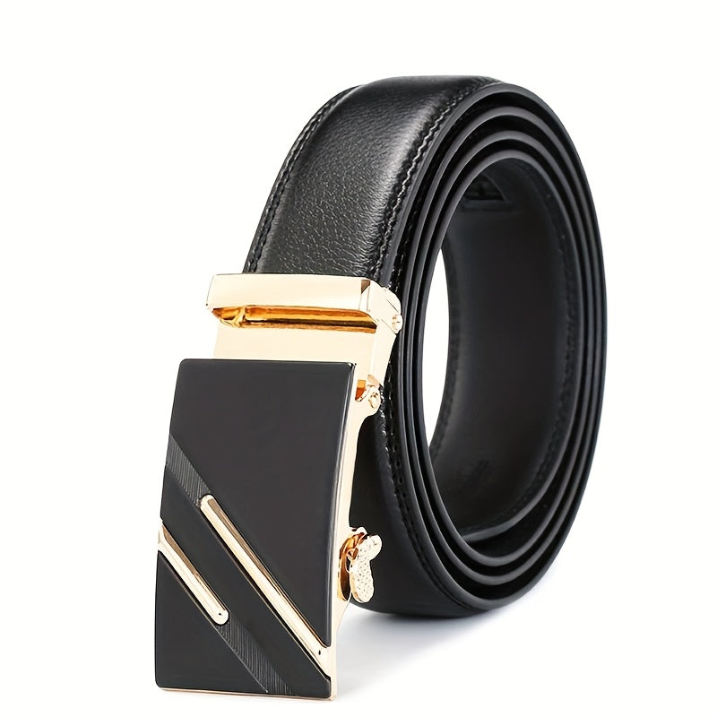 This business casual belt features a smooth faux leather material with an automatic alloy buckle. The belt is adjustable in length for a comfortable fit and comes in golden tone options.