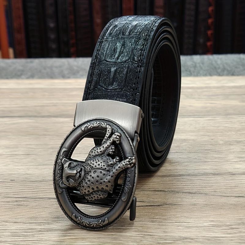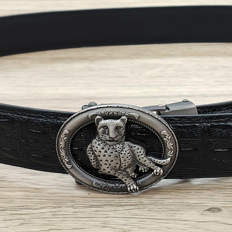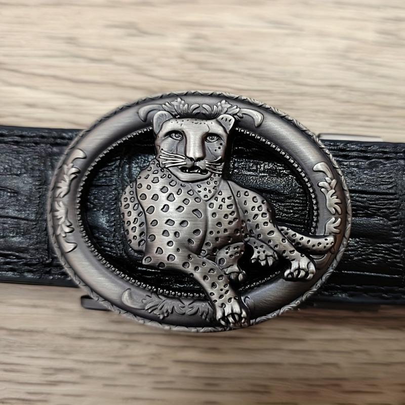 Upgrade your casual attire with this stylish leather belt featuring an embossed leopard buckle. Perfect for adding a touch of animal print to your look.