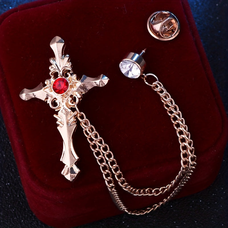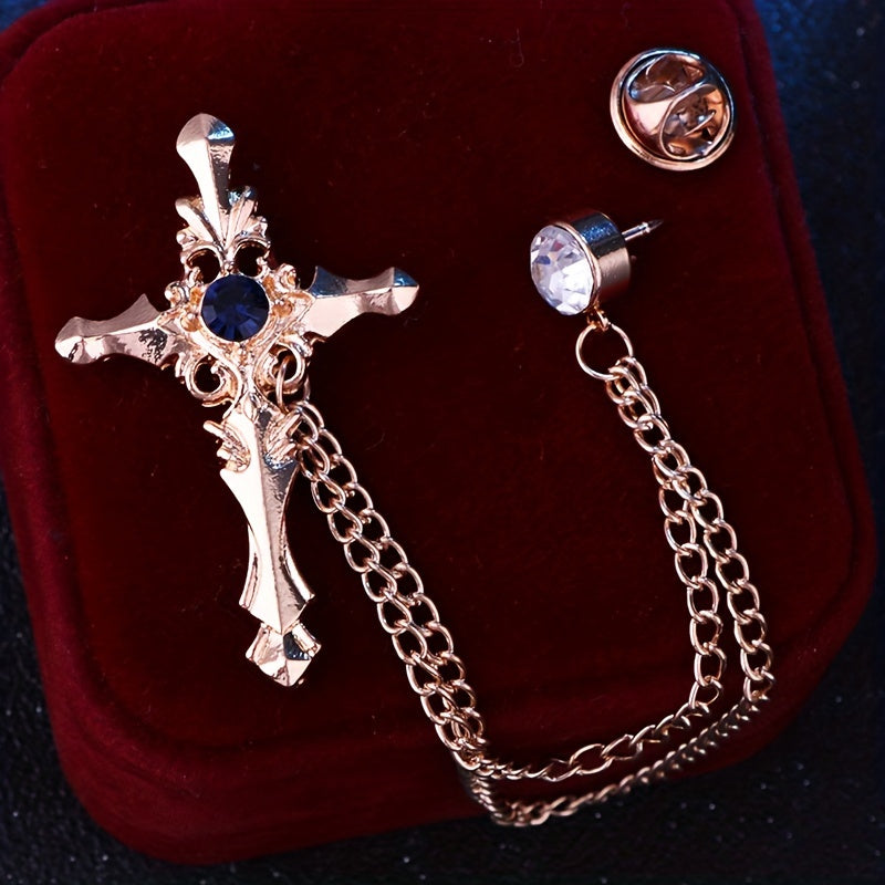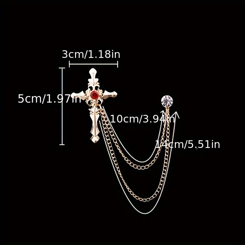 Add a touch of elegance to your attire with this golden tone cross brooch featuring sparkling rhinestones and a vintage chain tassel. Ideal for business events and formal occasions.
