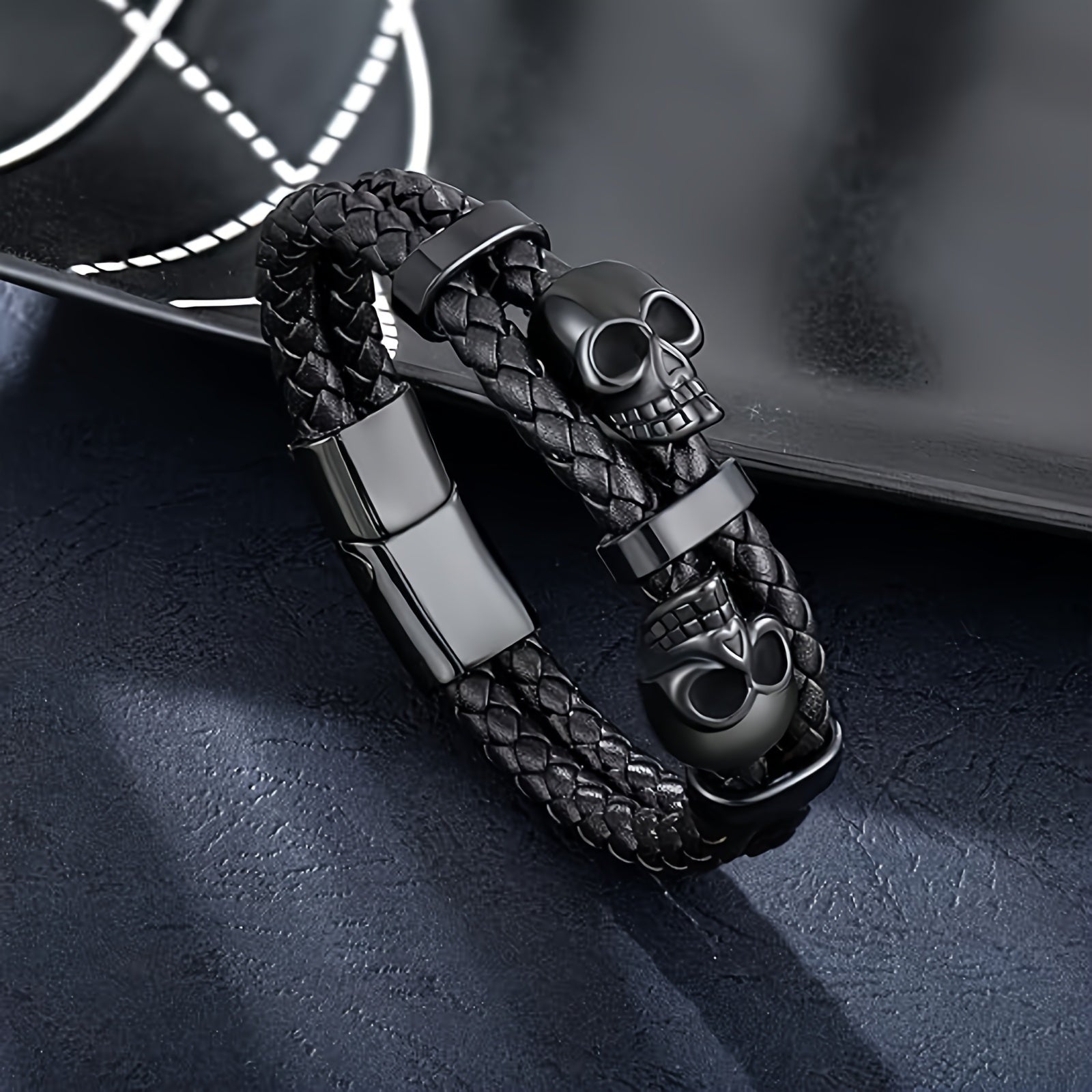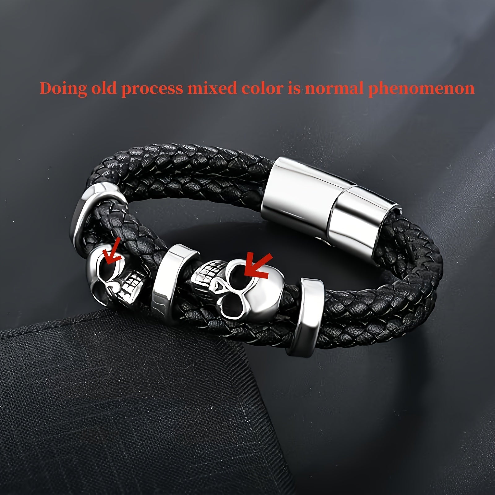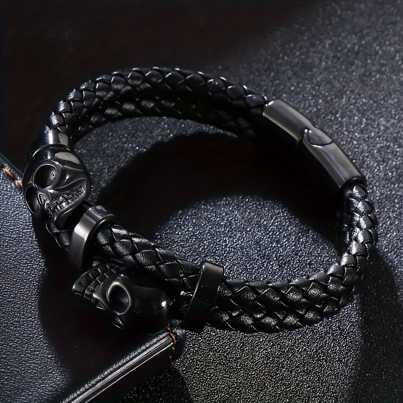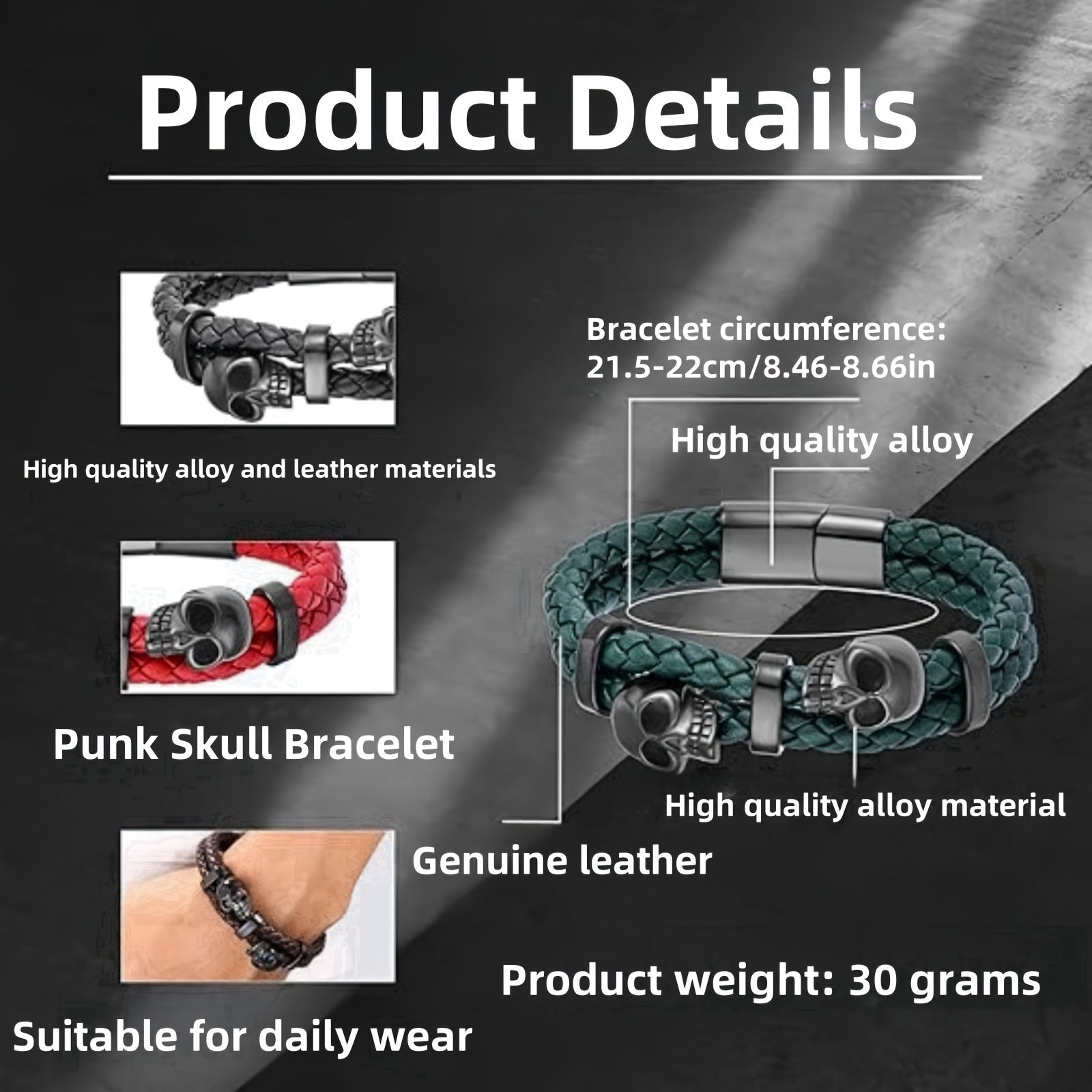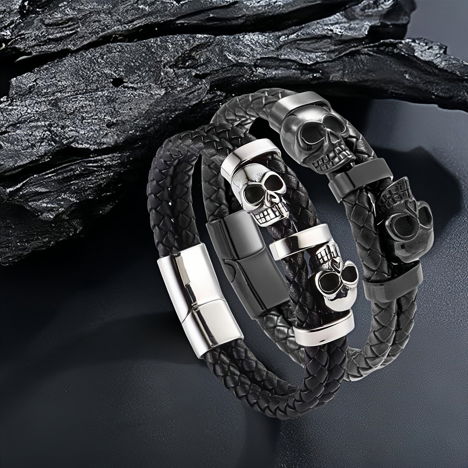 Complete your edgy look with this set of men's leather bracelets featuring skull accents. The cufflinks add a touch of sophistication to your attire.