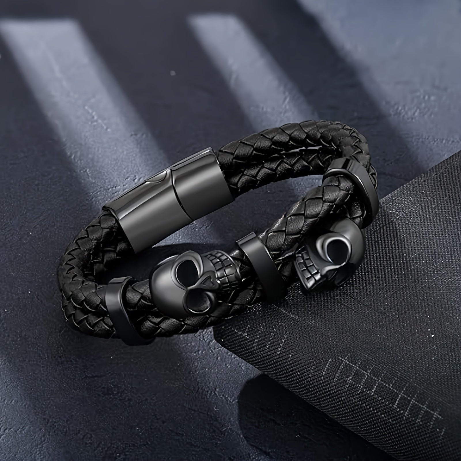 Men's Double Skull Leather Bracelet & Golden Cufflinks Combo