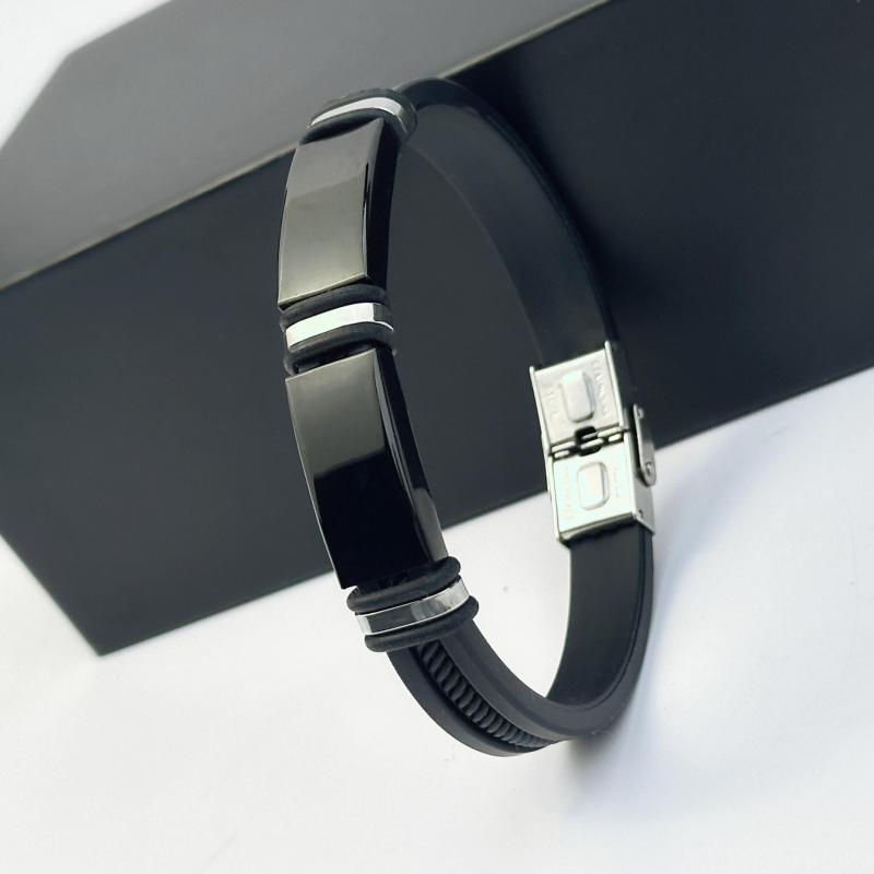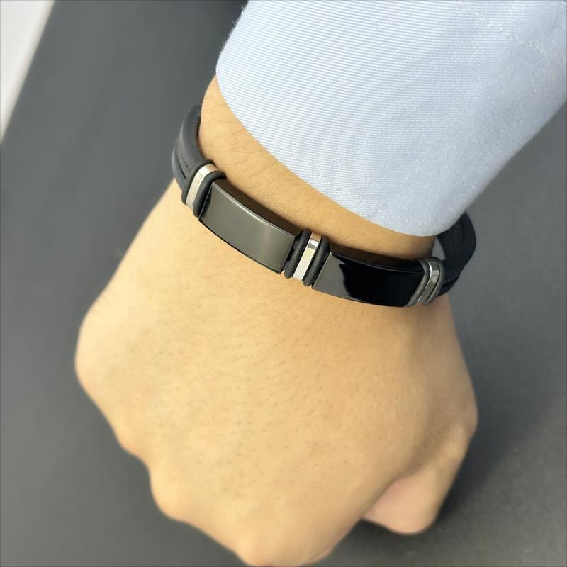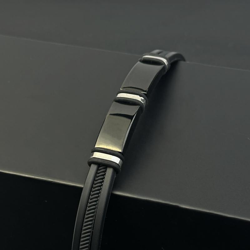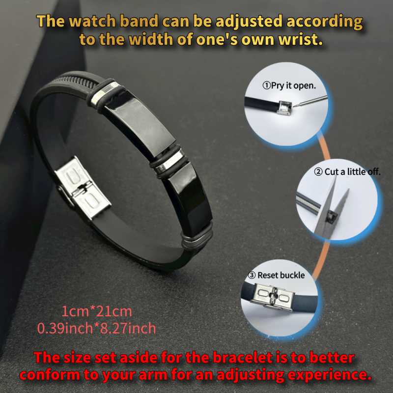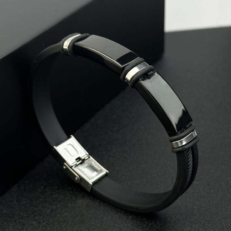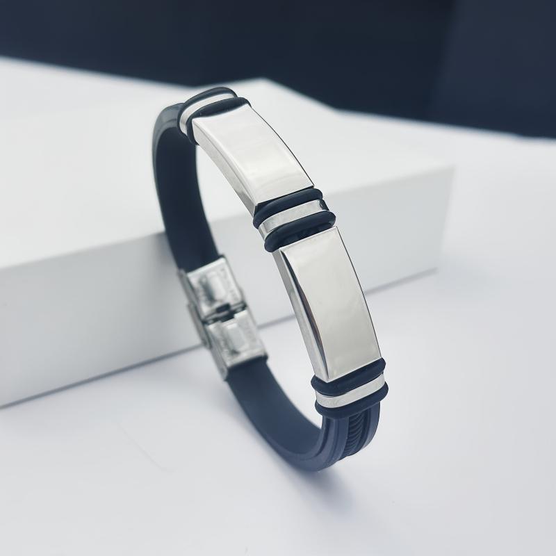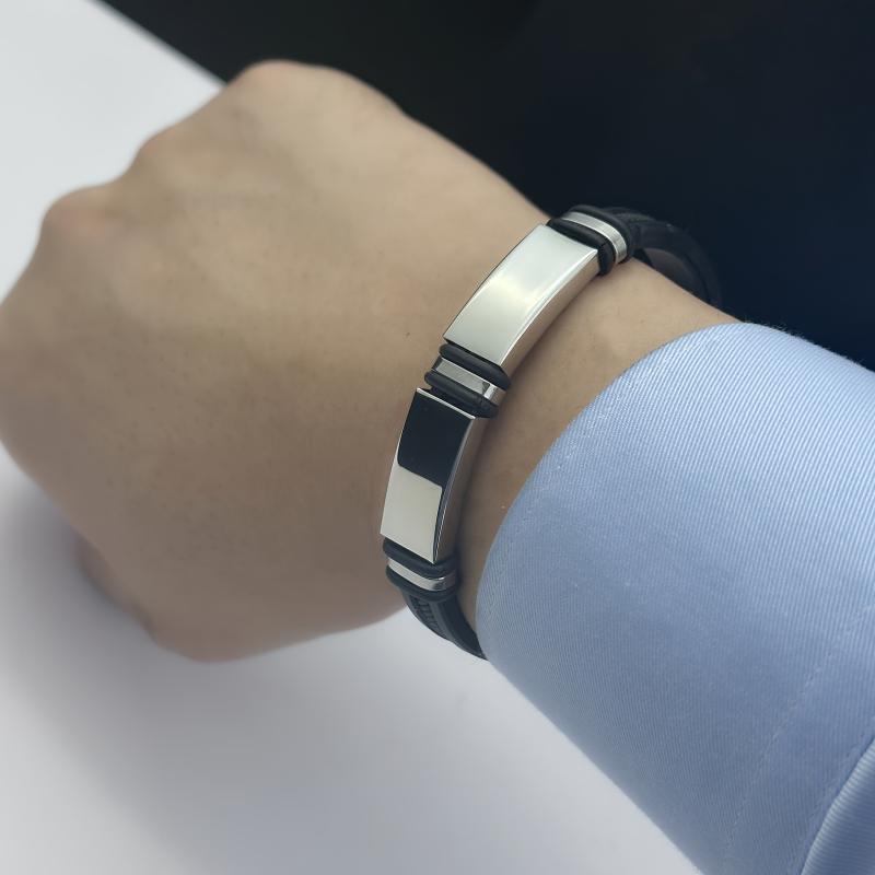 This adjustable wristband bracelet features dual stainless steel accents for a sleek and modern look, perfect for casual attire and outfits.