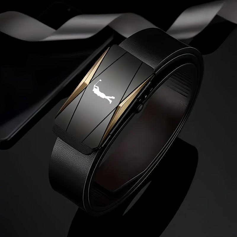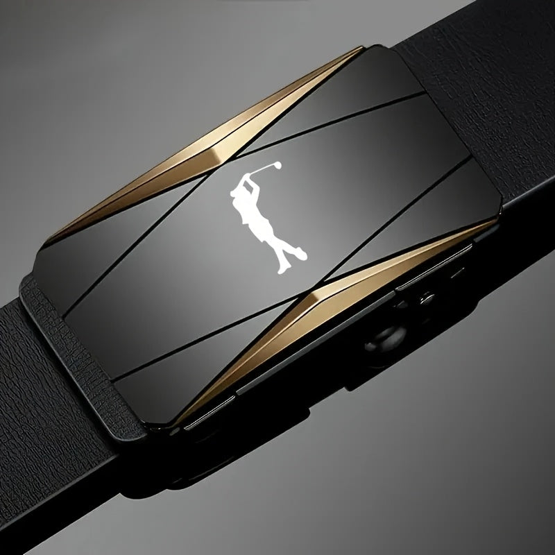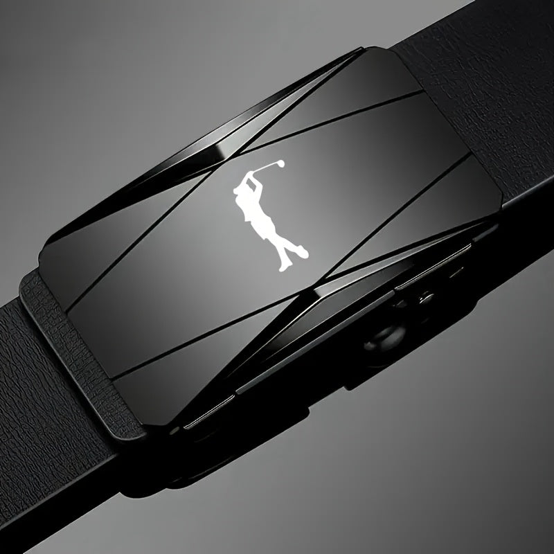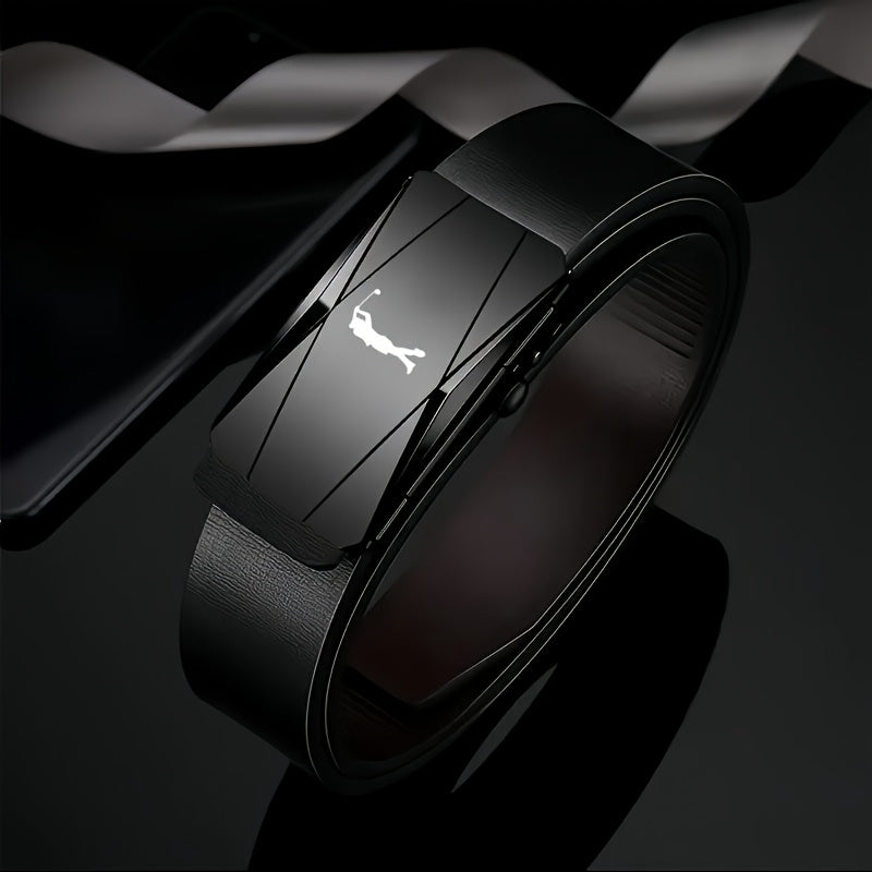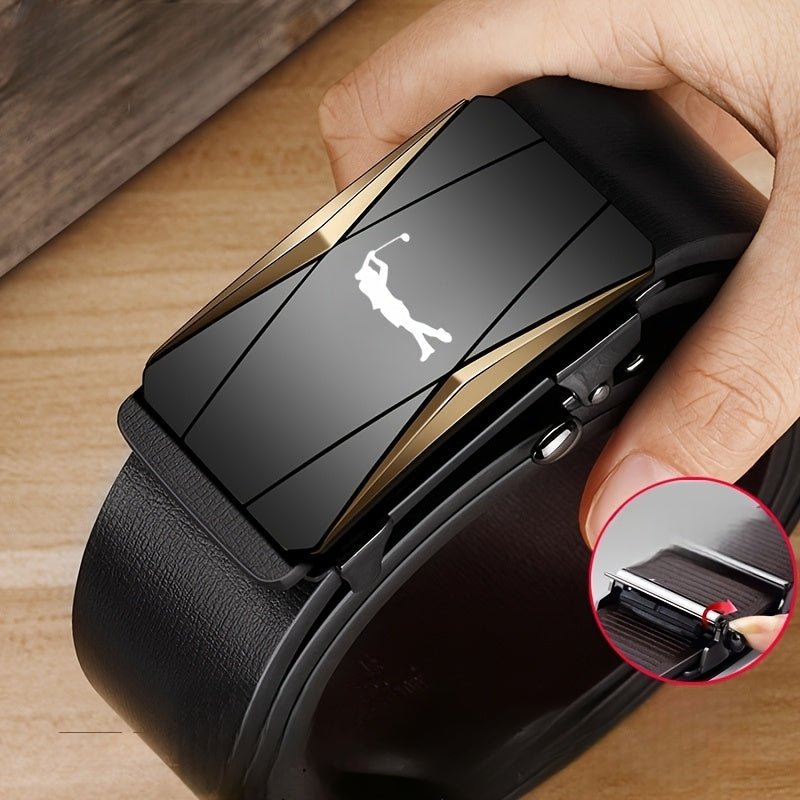 Elevate your style with this faux leather belt featuring a golden automatic buckle. The durable design makes it perfect for business or casual wear.