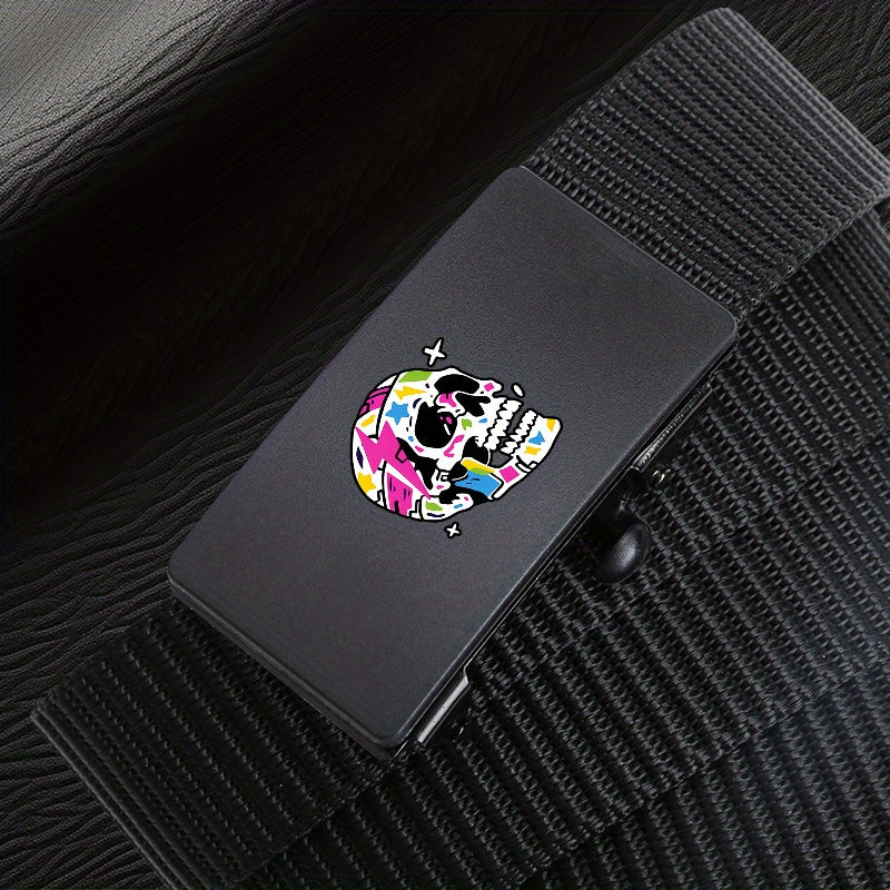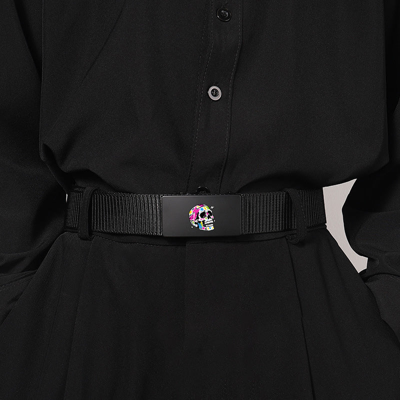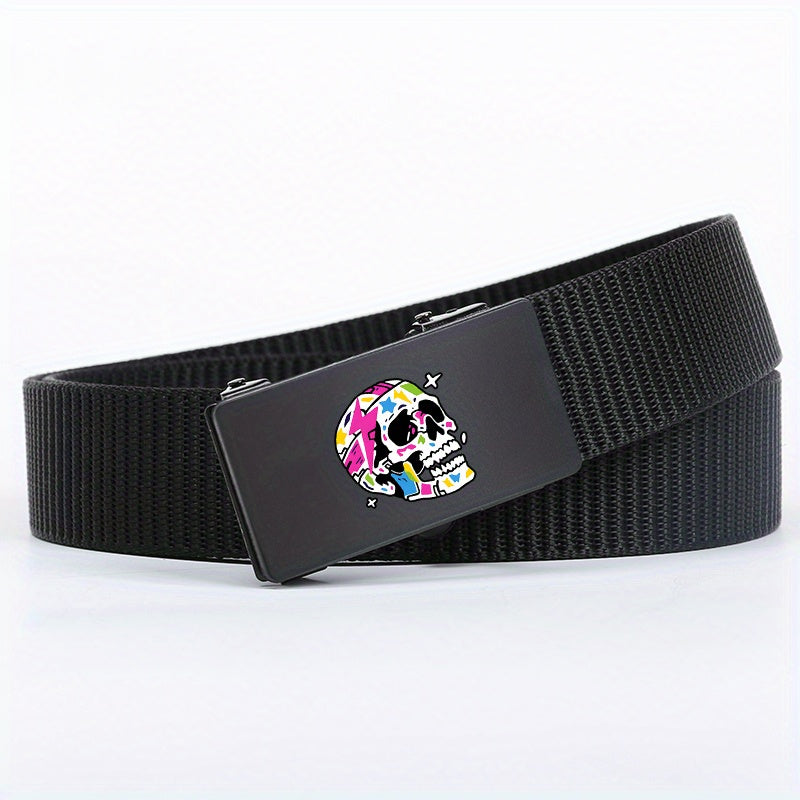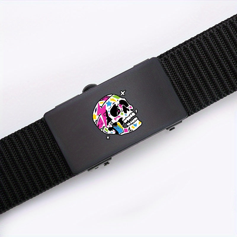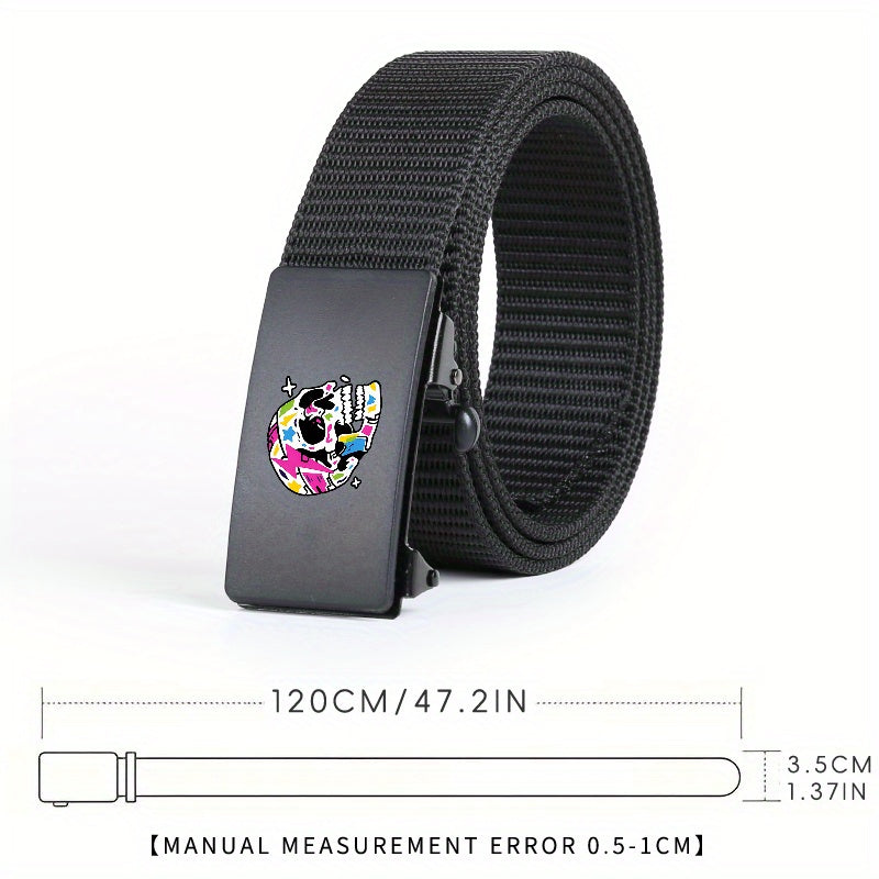 This belt features a vibrant skull pattern and an automatic buckle, making it suitable for both casual and business attire. The polyester woven design ensures durability and style.