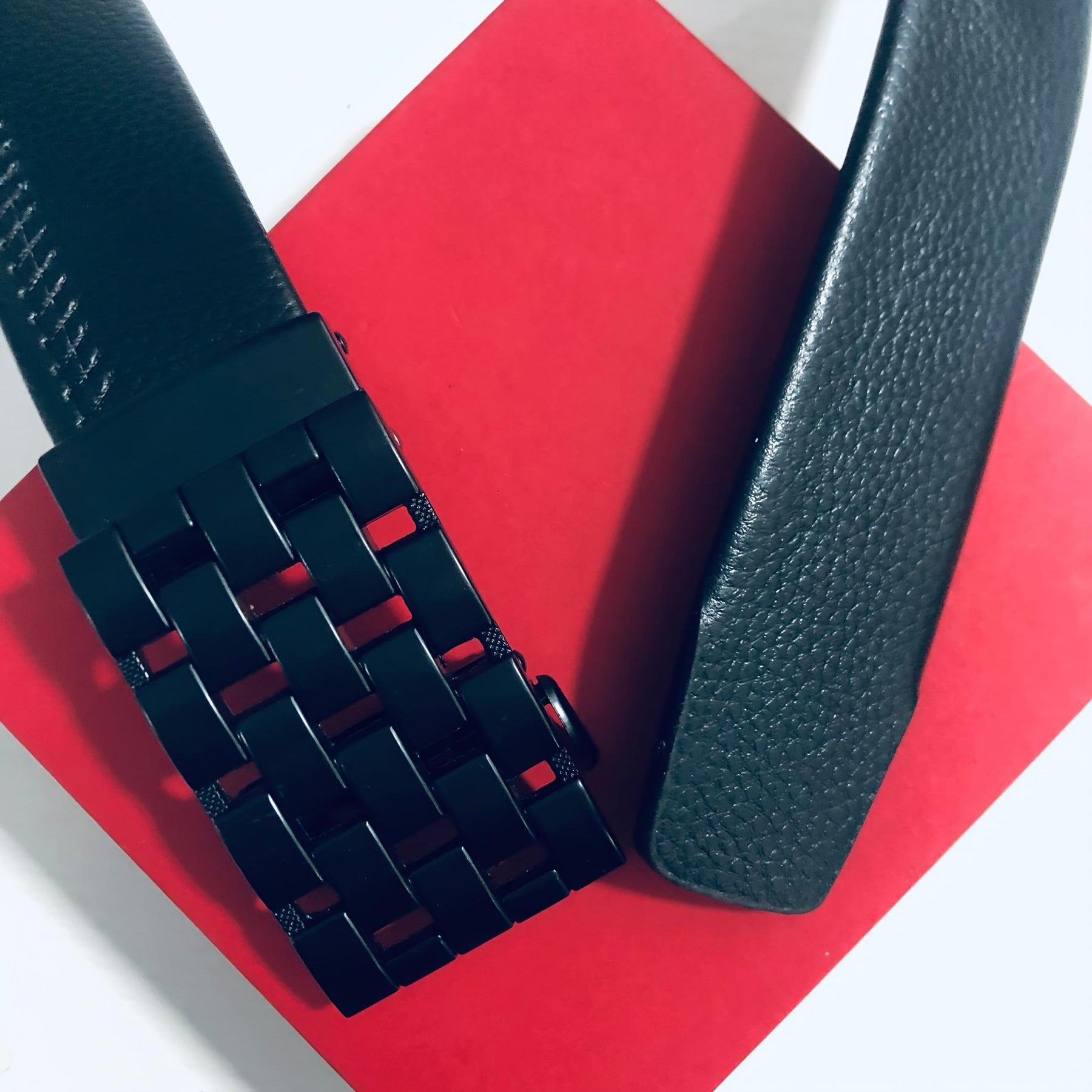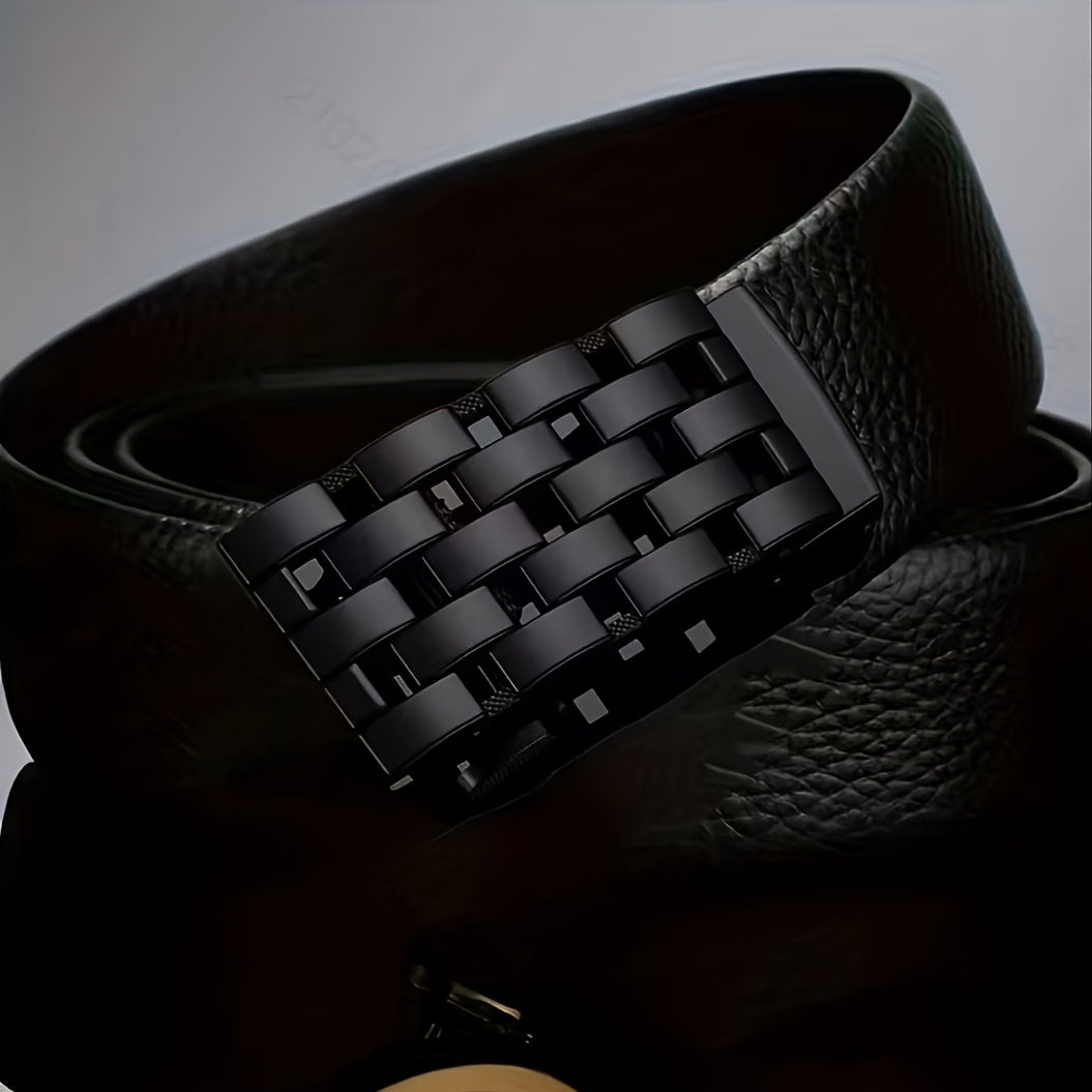 This stylish men's leather belt features high-quality cowhide material and an automatic alloy buckle with a woven pattern, making it suitable for both business and casual wear.