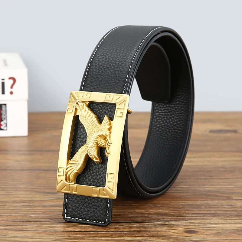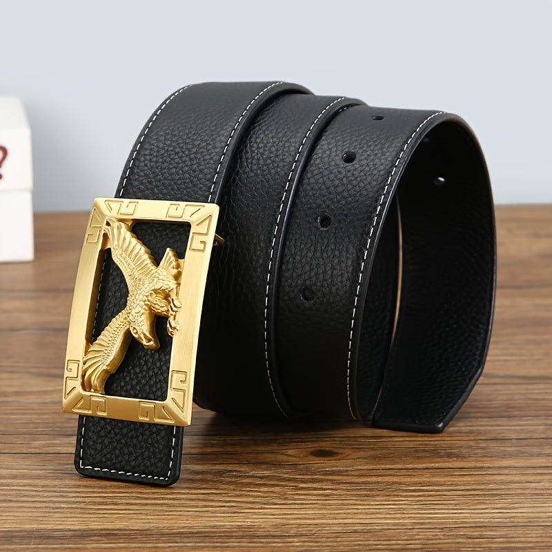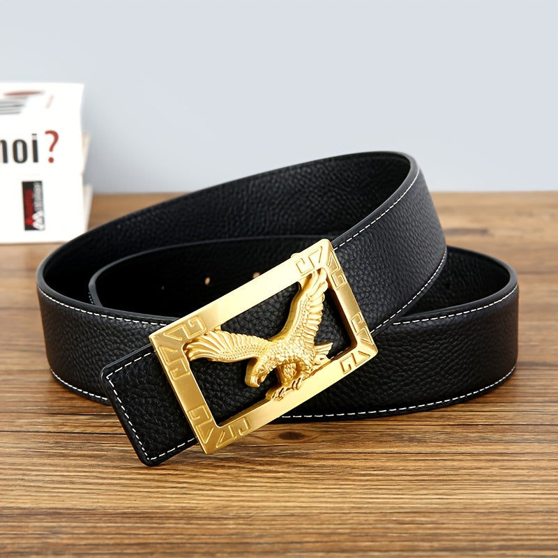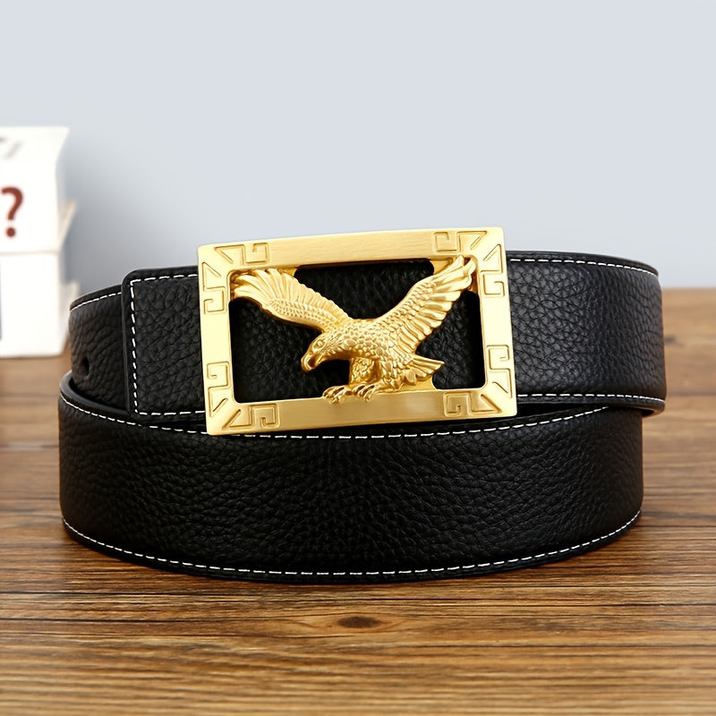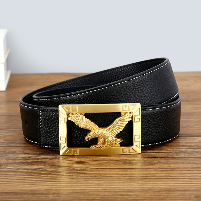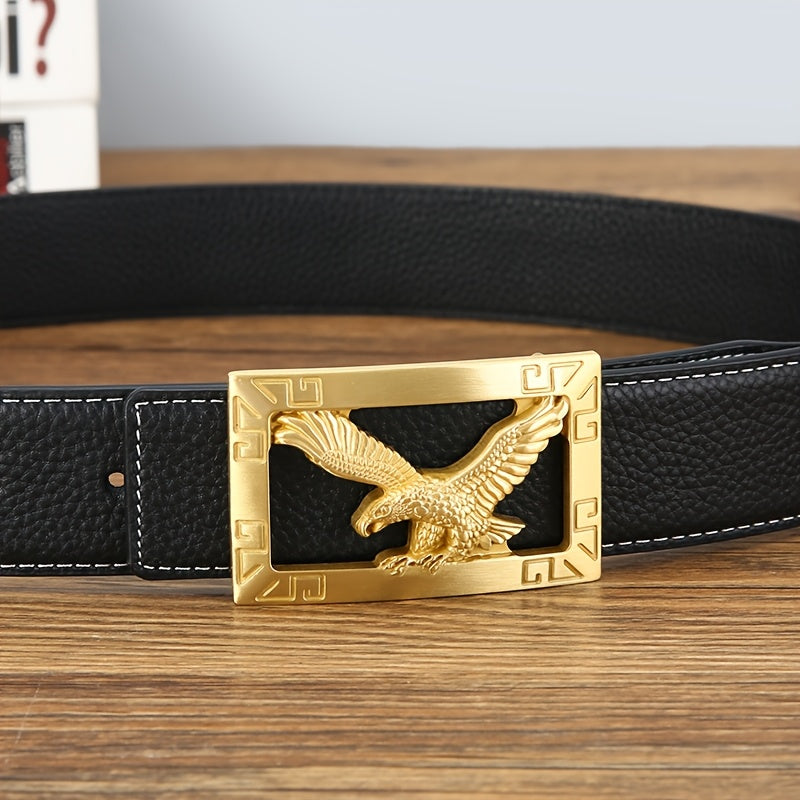 This leather belt features an eagle buckle design with a copper alloy buckle and a smooth finish. It is available in an average size.