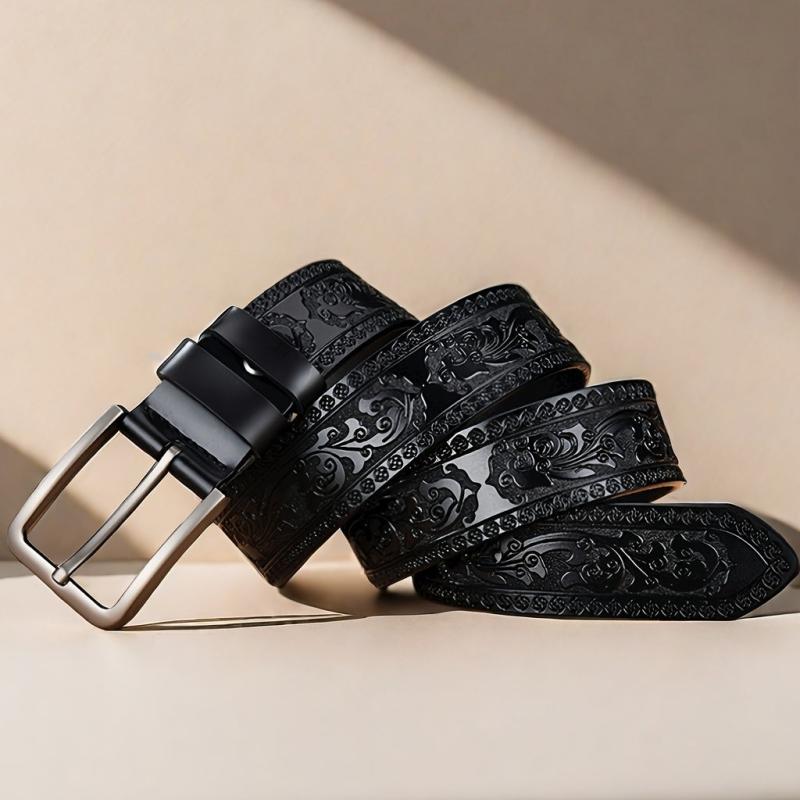 Get these 2 stylish leather belts with alloy buckle featuring engraved floral patterns and red color. Perfect for business, casual, or outdoor wear. An ideal gift for Father's Day.