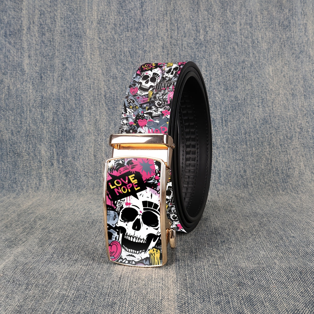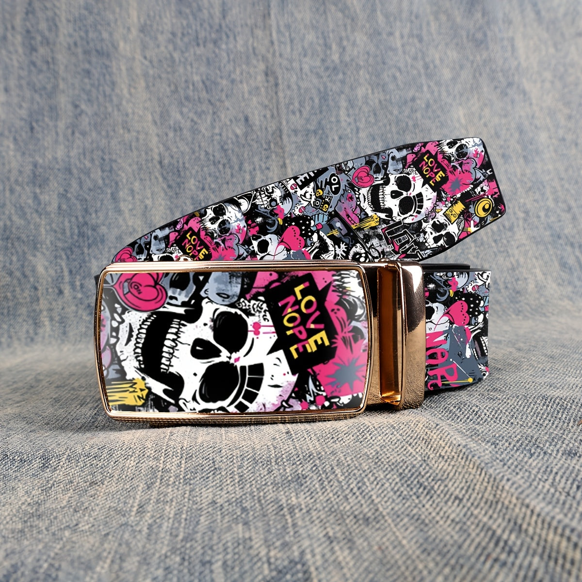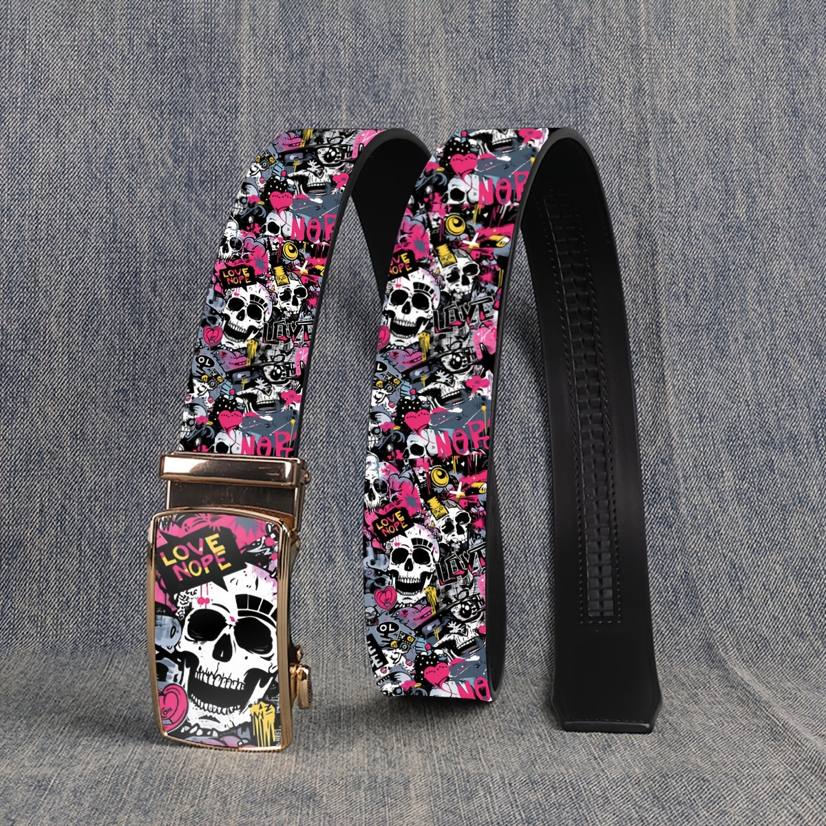 Upgrade your casual style with this trendy men's belt featuring a stylish love skull print design. Crafted from faux leather with a silvery toned automatic buckle, this accessory is versatile and perfect for streetwear.