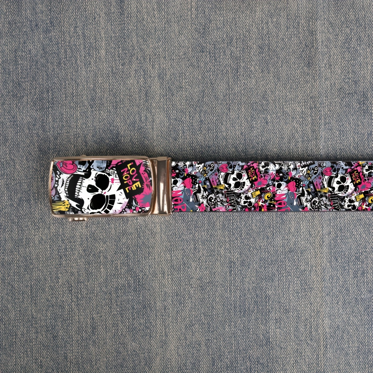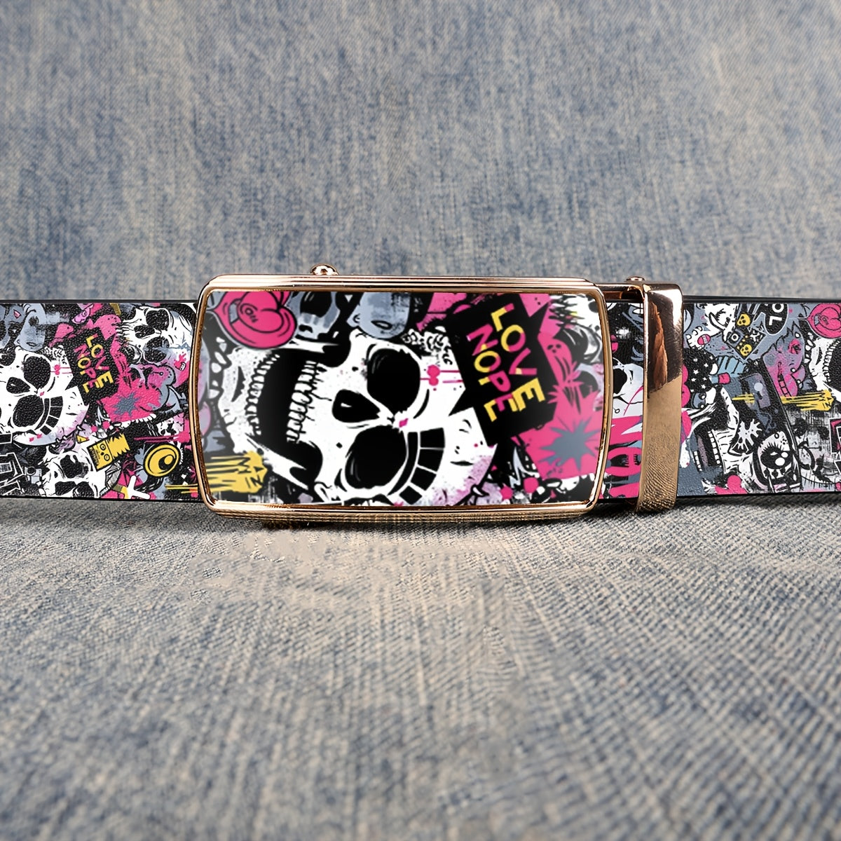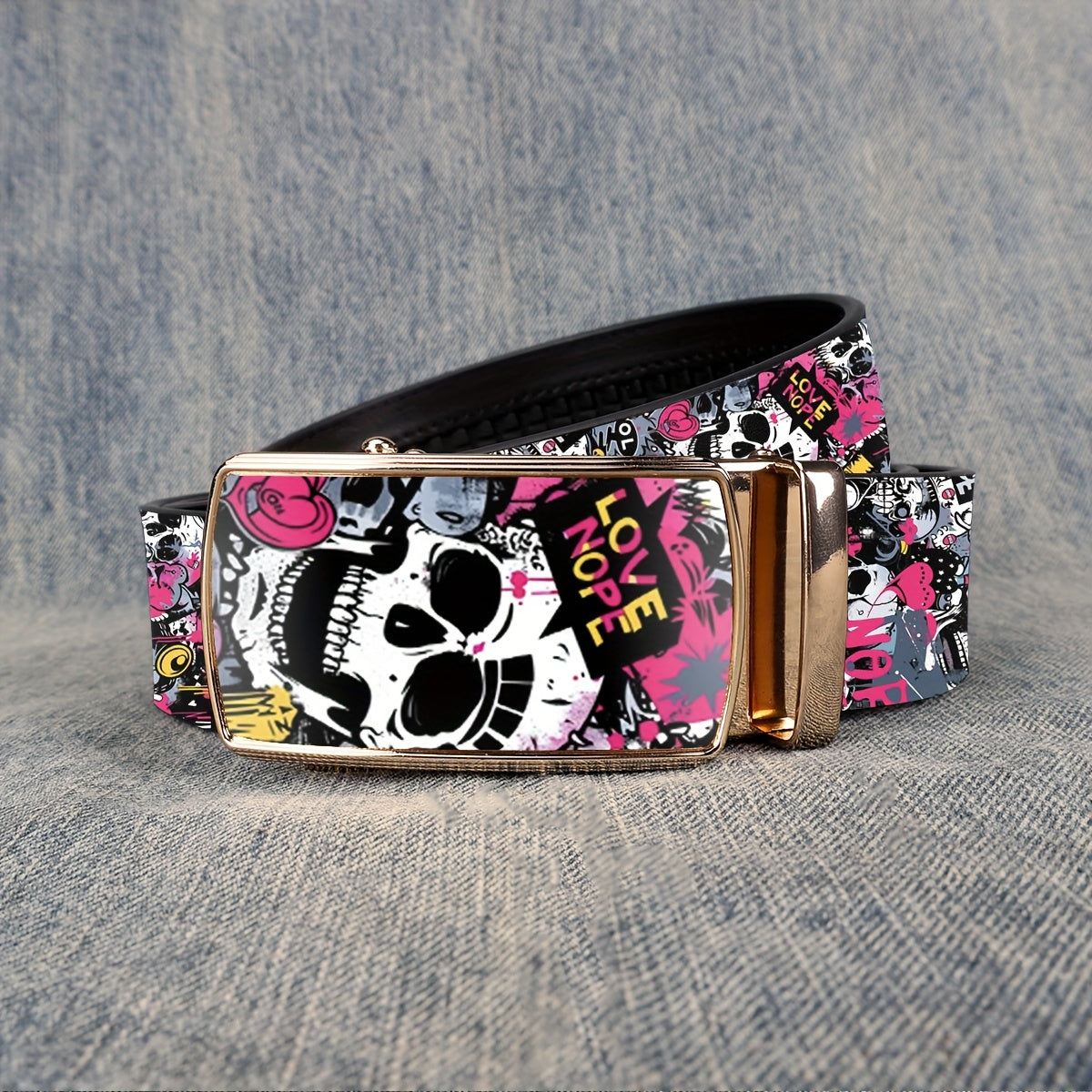 Upgrade your casual style with this trendy men's belt featuring a stylish love skull print design. Crafted from faux leather with a silvery toned automatic buckle, this accessory is versatile and perfect for streetwear.