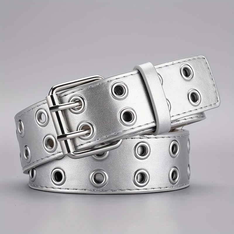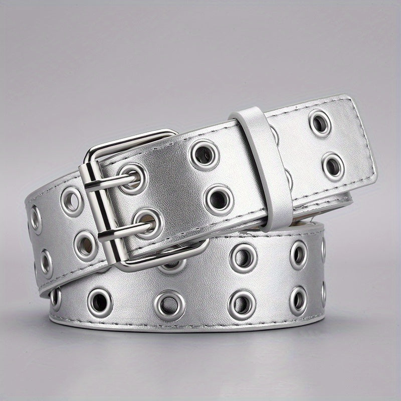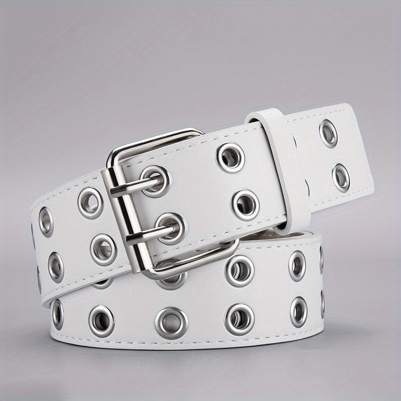 Add a touch of rock style to your outfit with this PU leather belt. The double row eyelet design and pin buckle make it perfect for jeans.