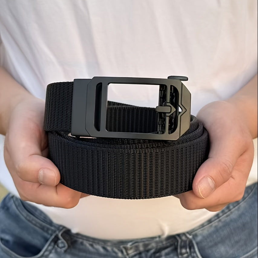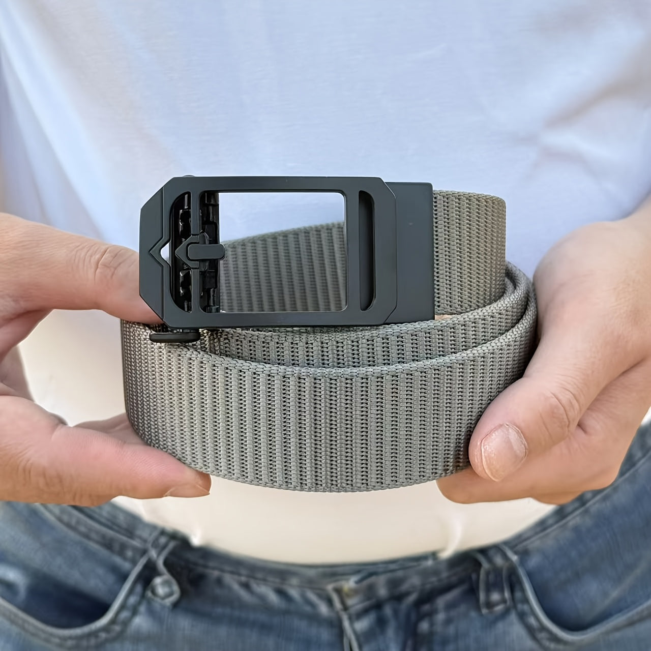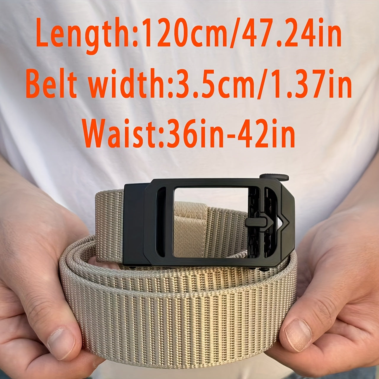 This men's tactical nylon belt is designed for outdoor activities. It features a durable alloy automatic buckle, quick release functionality, and a high secure fit. The adjustable design ensures a comfortable and customizable fit.