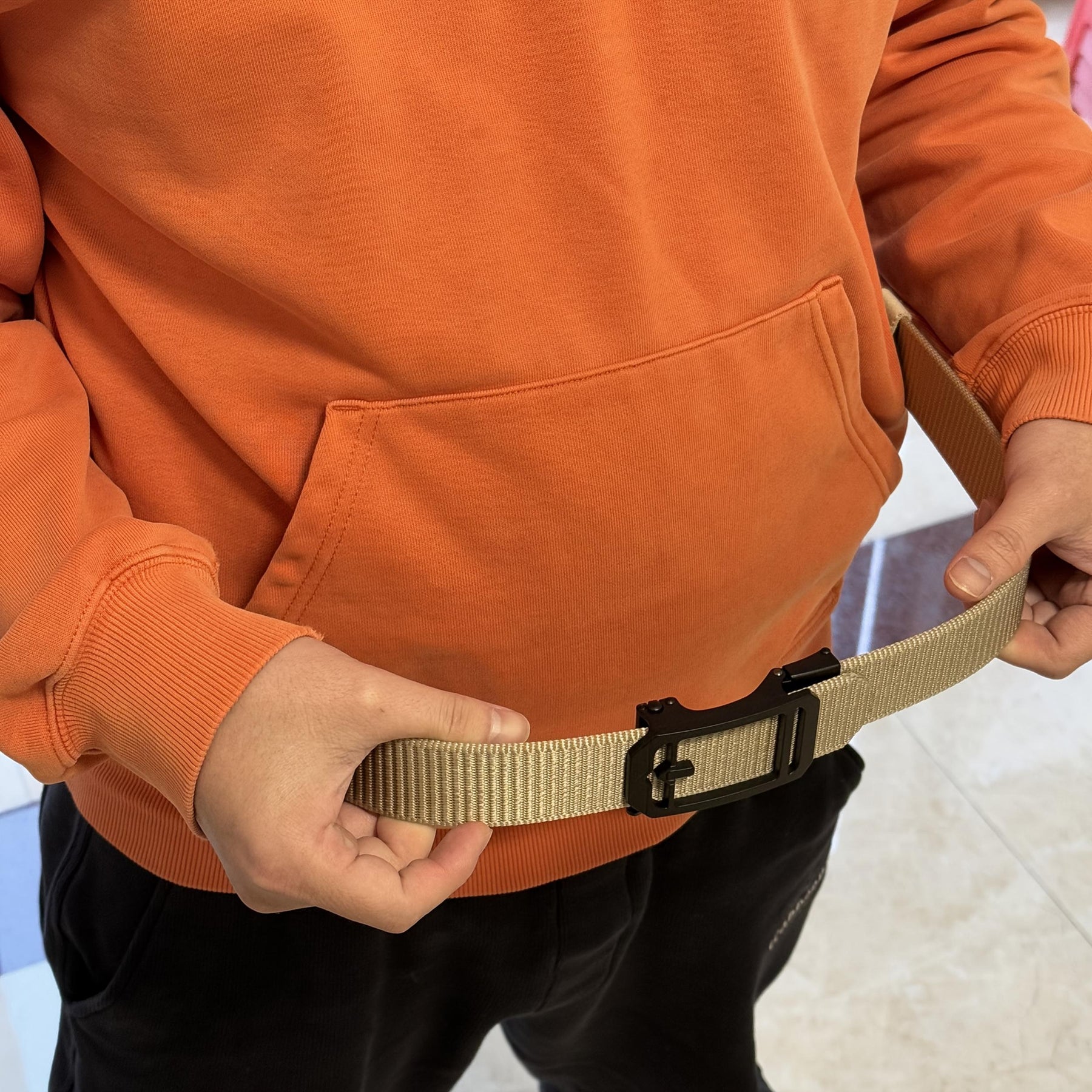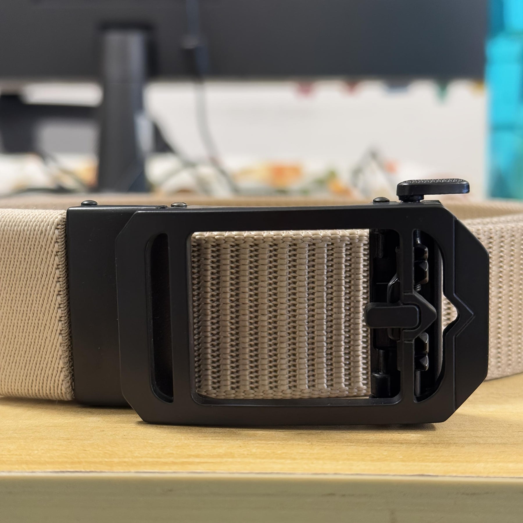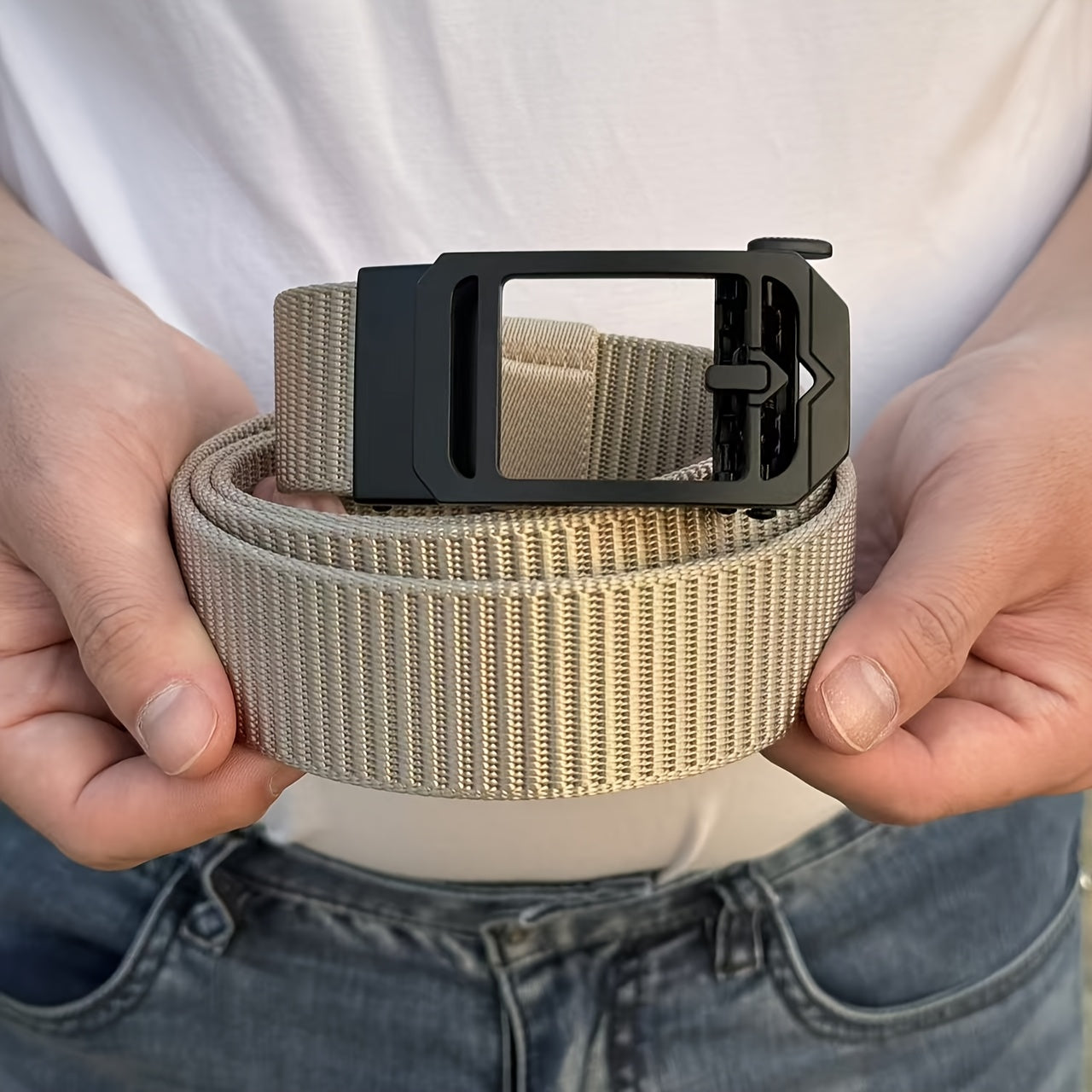 This men's tactical nylon belt is designed for outdoor activities. It features a durable alloy automatic buckle, quick release functionality, and a high secure fit. The adjustable design ensures a comfortable and customizable fit.