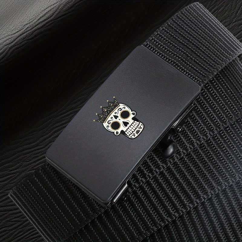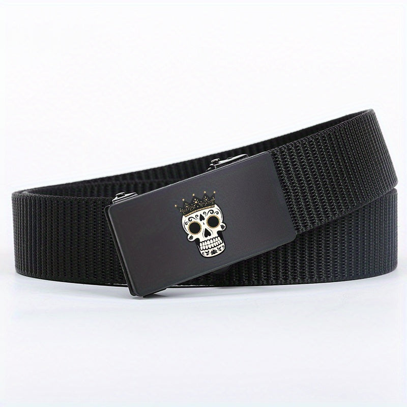 Stylish belt with crown skull buckle & automatic closure. Made of durable polyester fabric, ideal for casual or business wear. A perfect gift idea for any occasion.