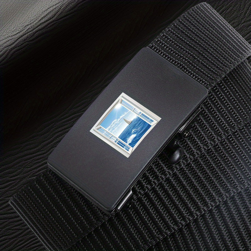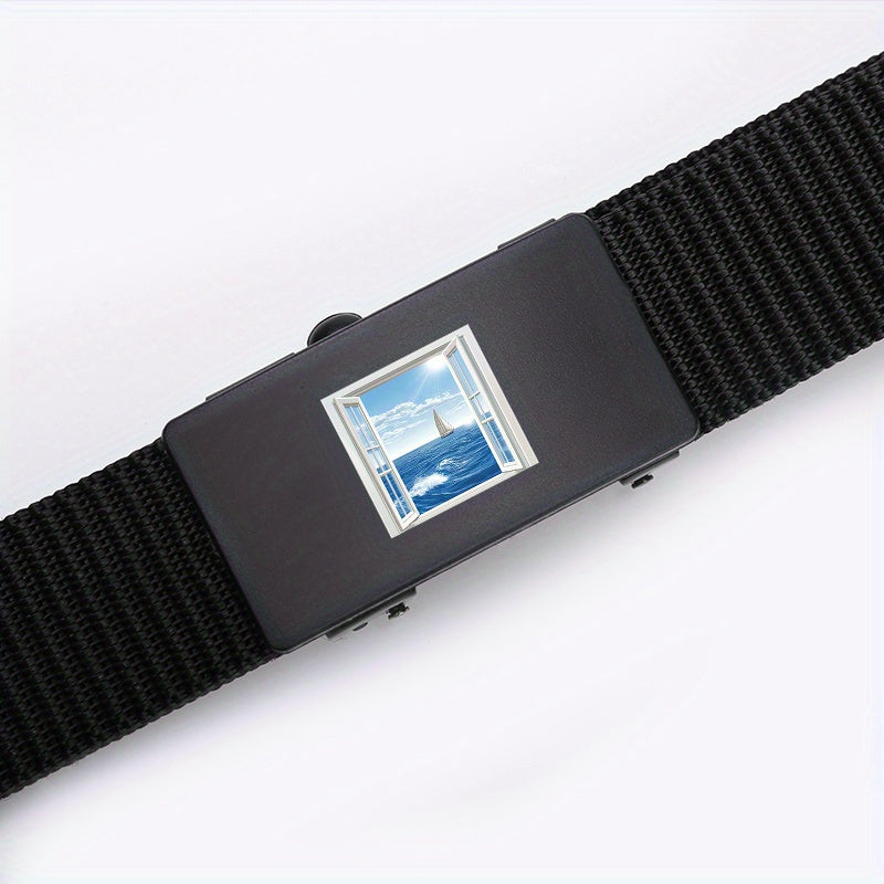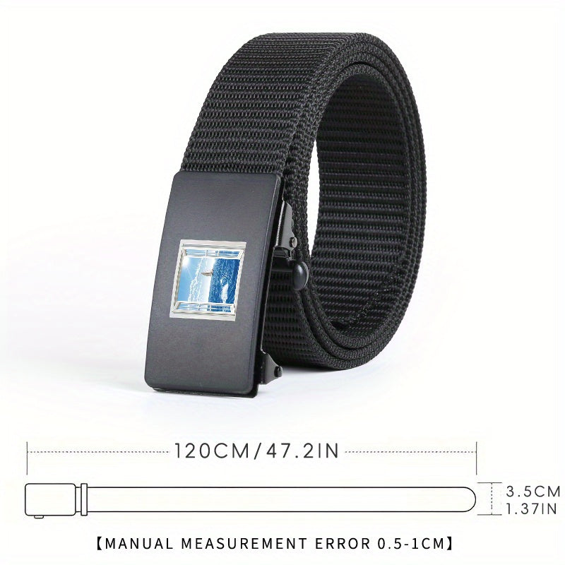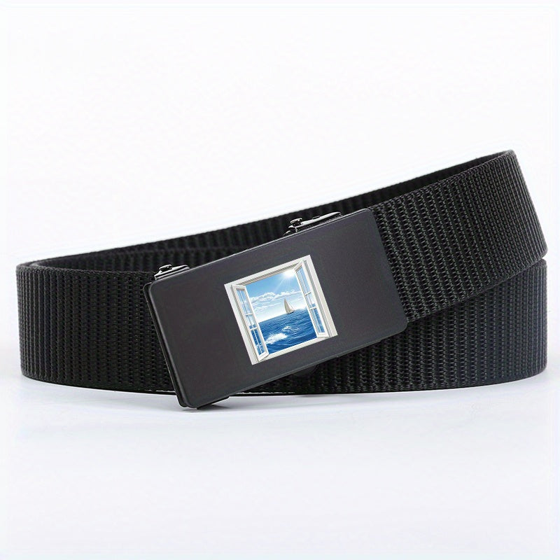 Upgrade your style with this versatile woven belt featuring a window seascape pattern. Made of durable polyester fiber with an automatic alloy buckle, perfect for daily and business wear. Great as a gift!