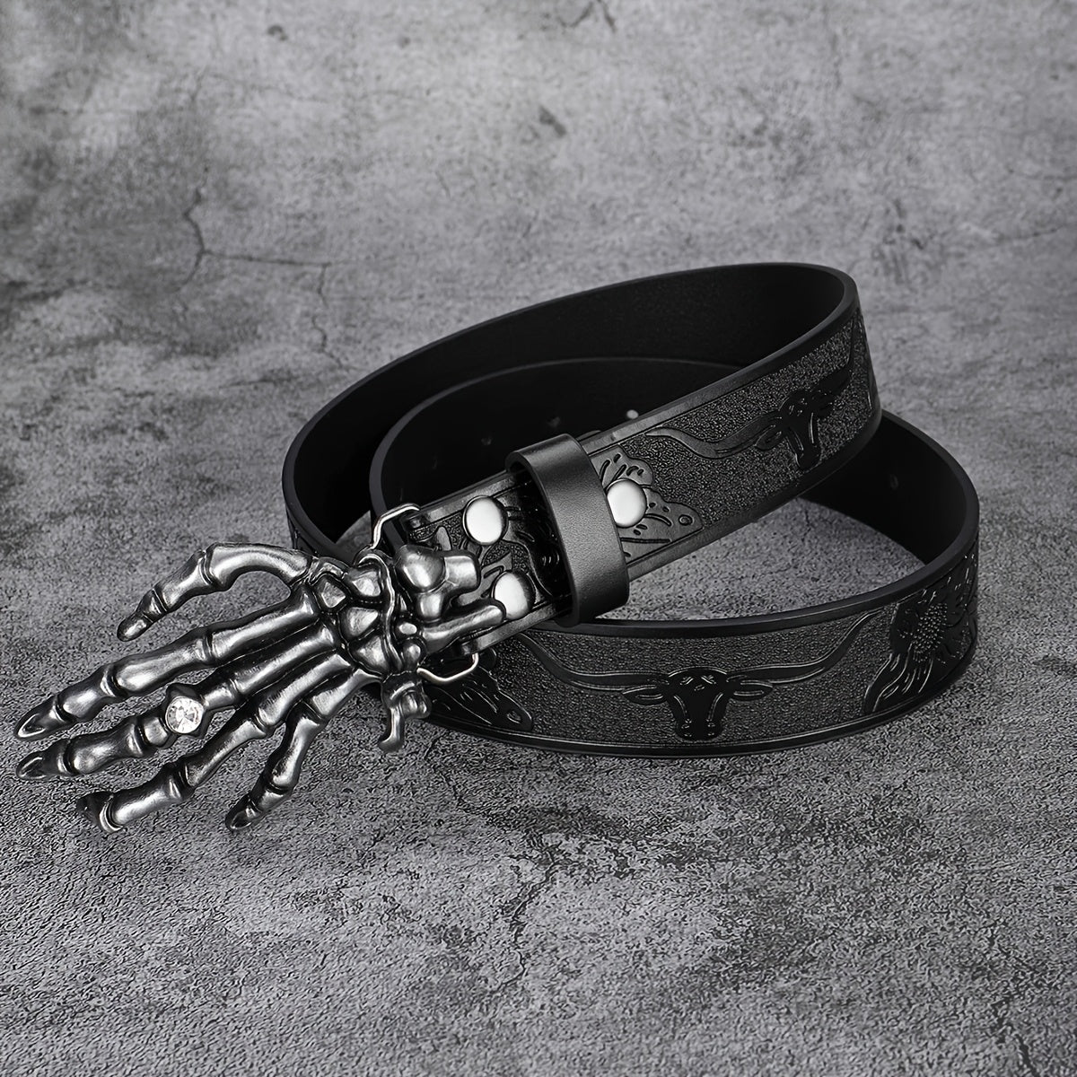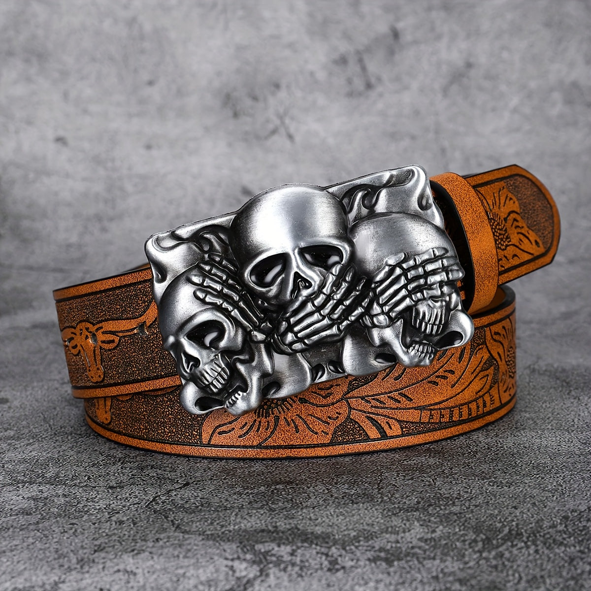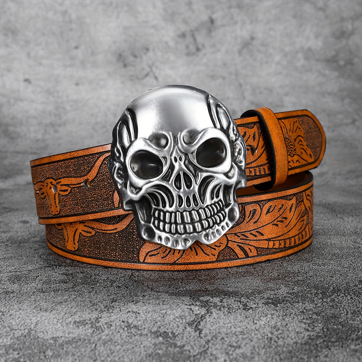 Add a touch of punk style with this vintage-inspired faux leather belt featuring a skull print design. Perfect for jeans and casual wear.