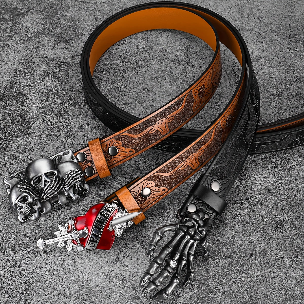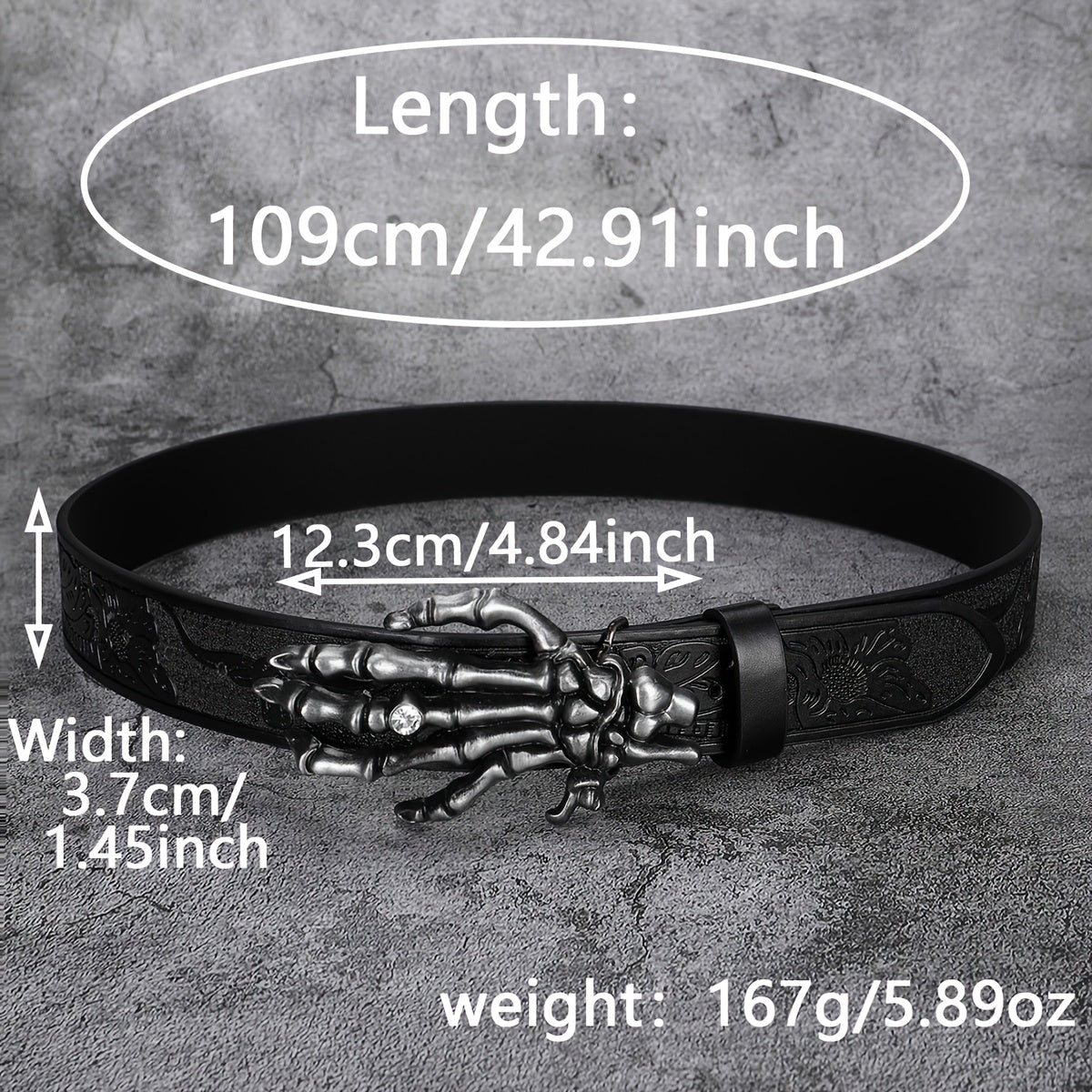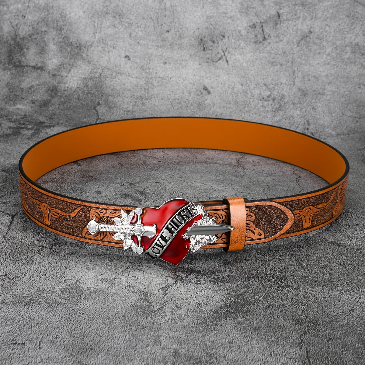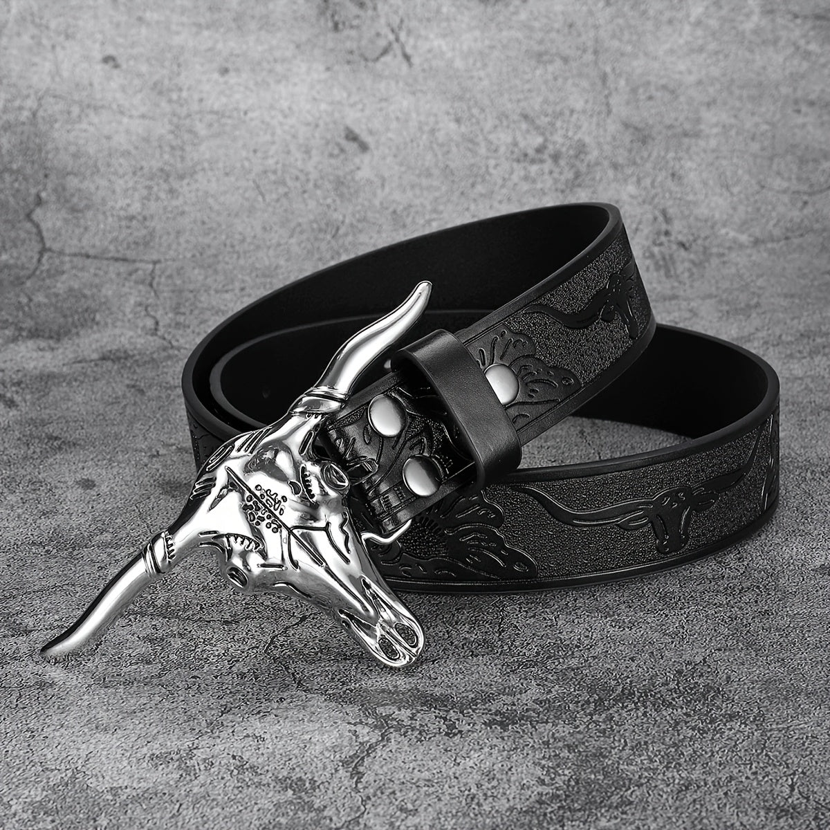 Add a touch of punk style with this vintage-inspired faux leather belt featuring a skull print design. Perfect for jeans and casual wear.