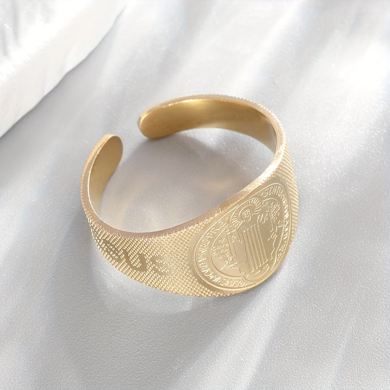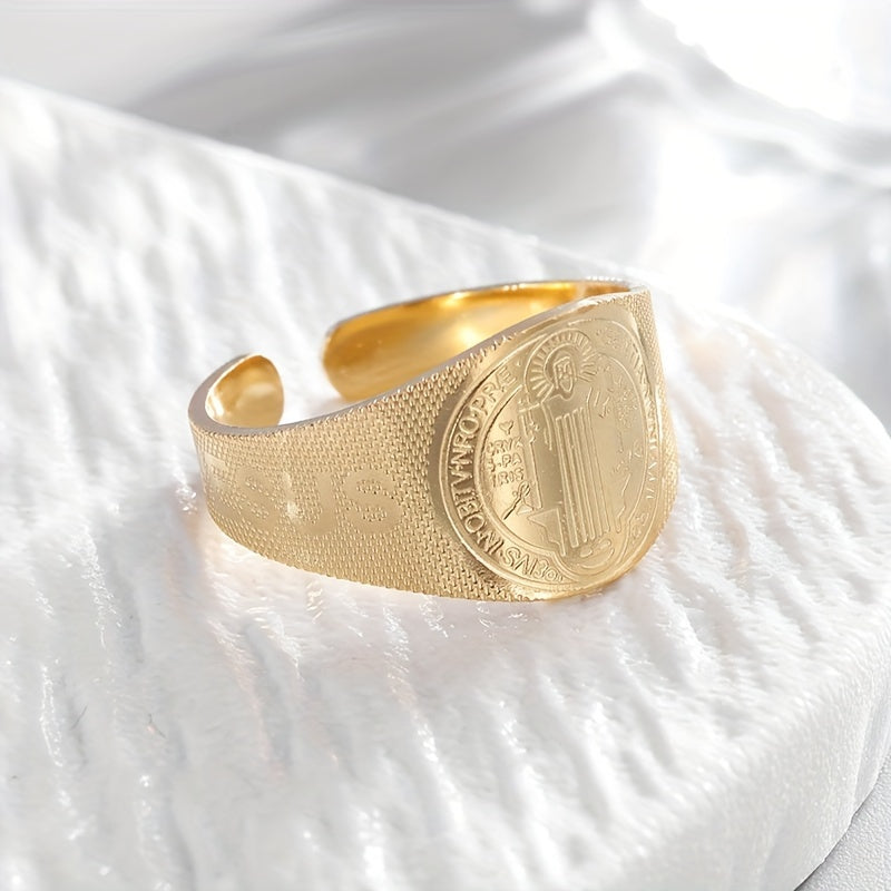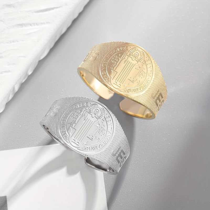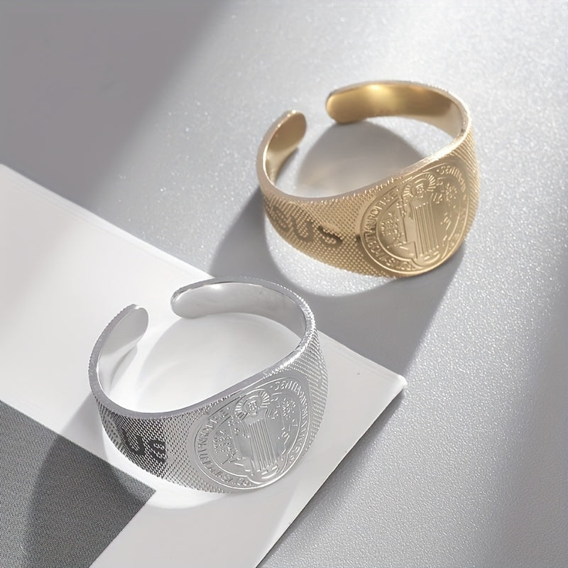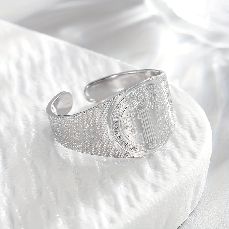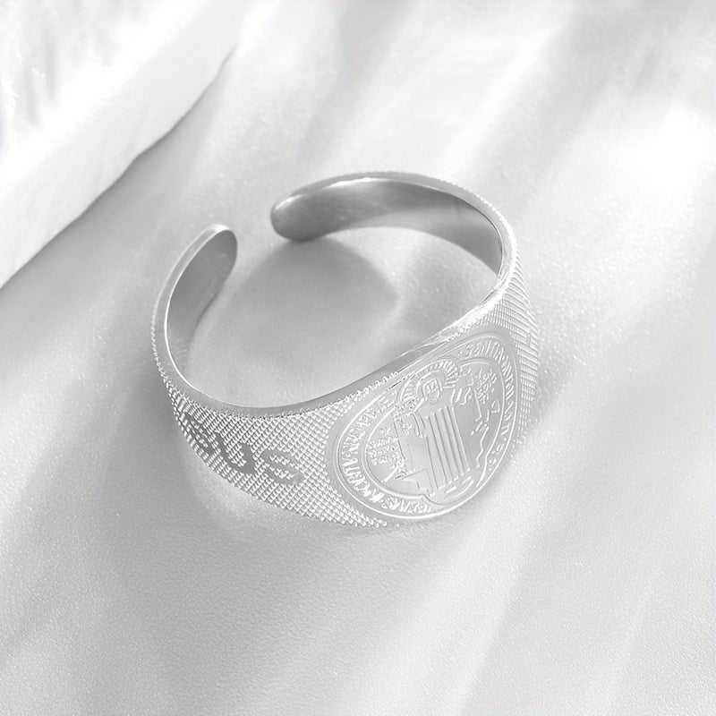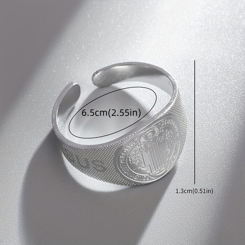 This stainless steel ring features the classic St. Benedict design, perfect for daily wear. The ring is open and adjustable, suitable for both men and women.