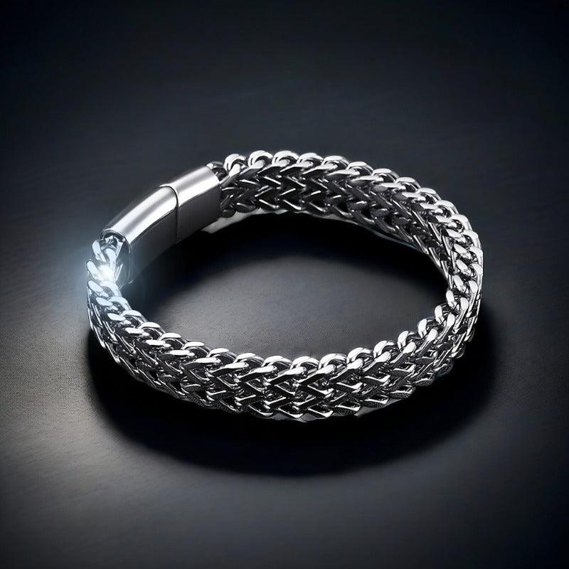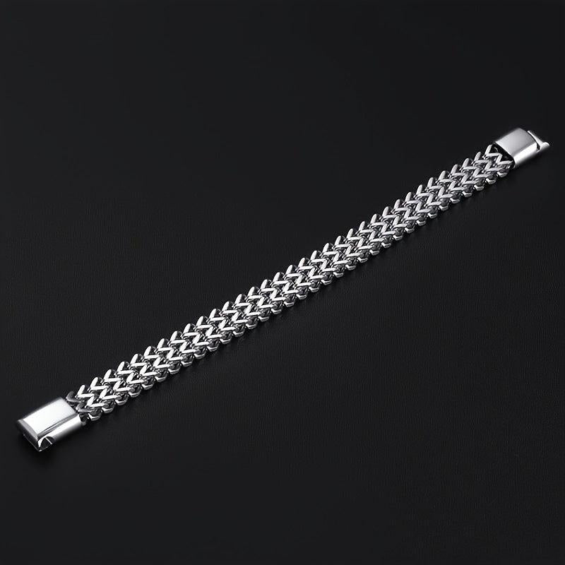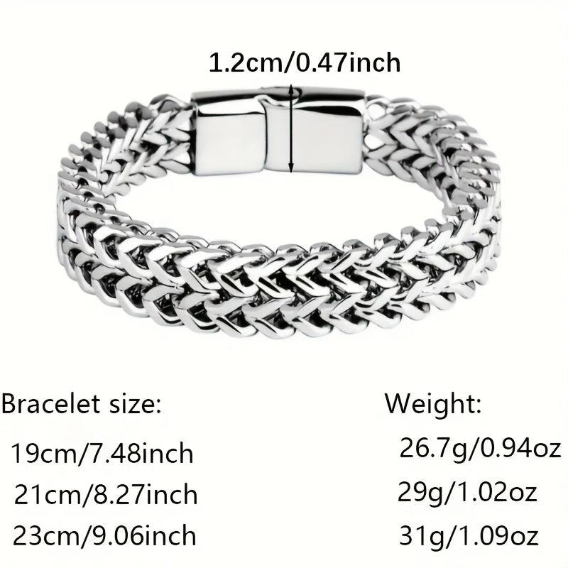 Durable stainless steel bracelet with a double row Cuban link design. Features a magnetic clasp for easy wear. Ideal for sports and daily wear. Perfect gift for husband, friend, or partner.