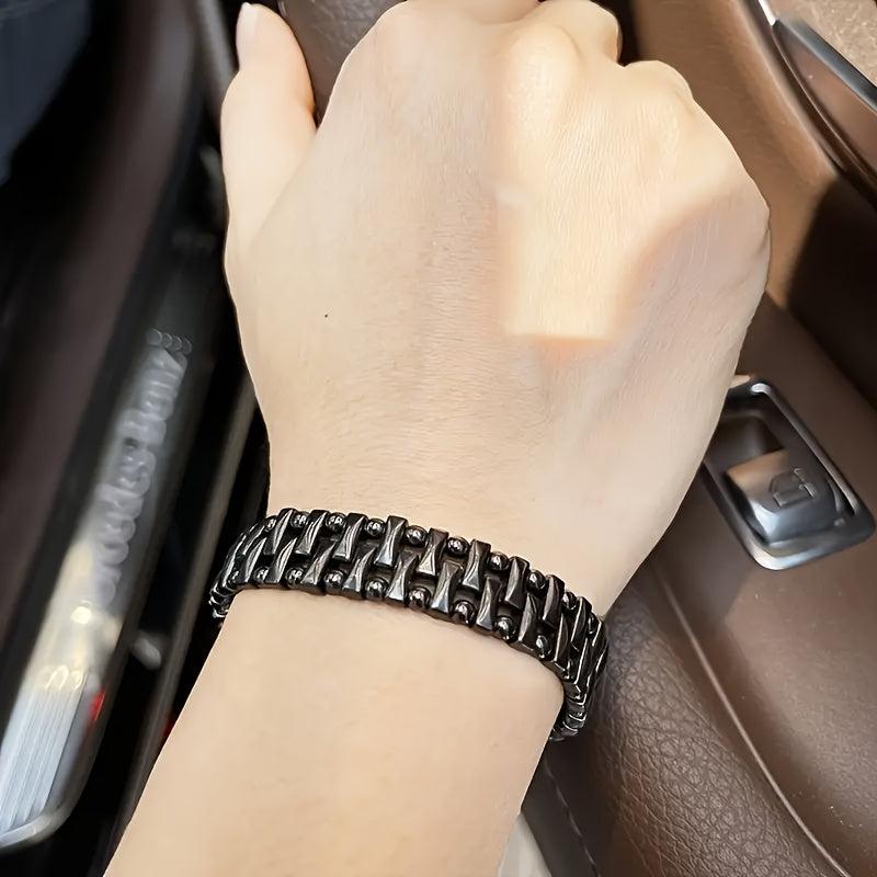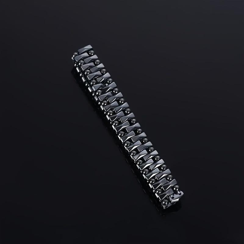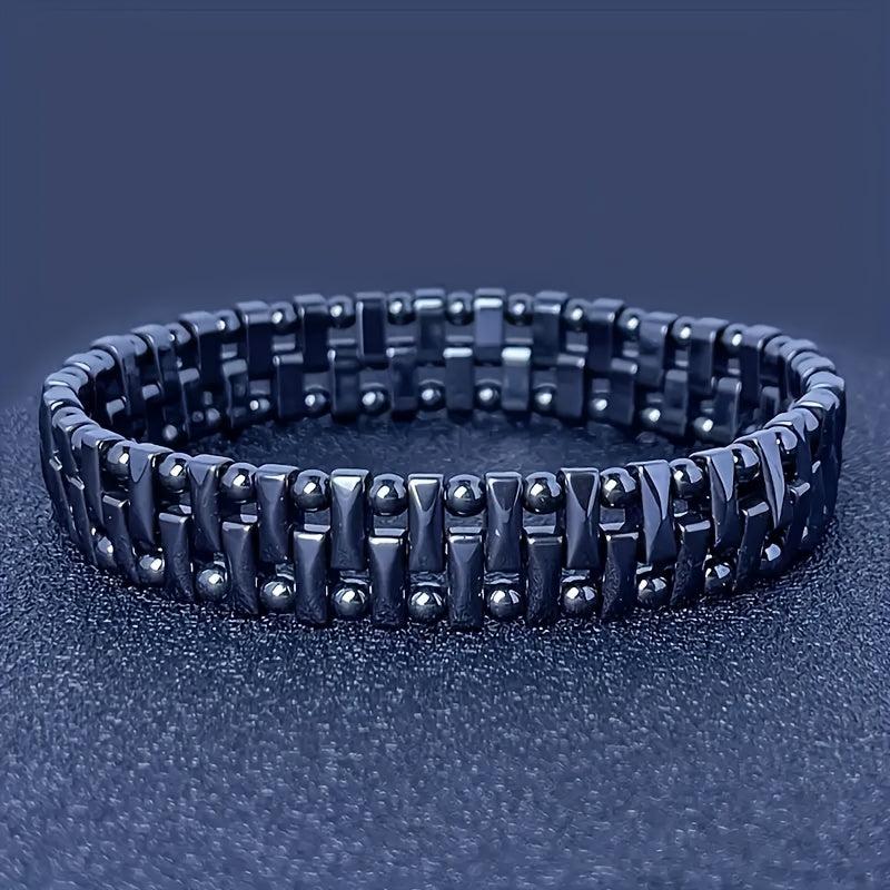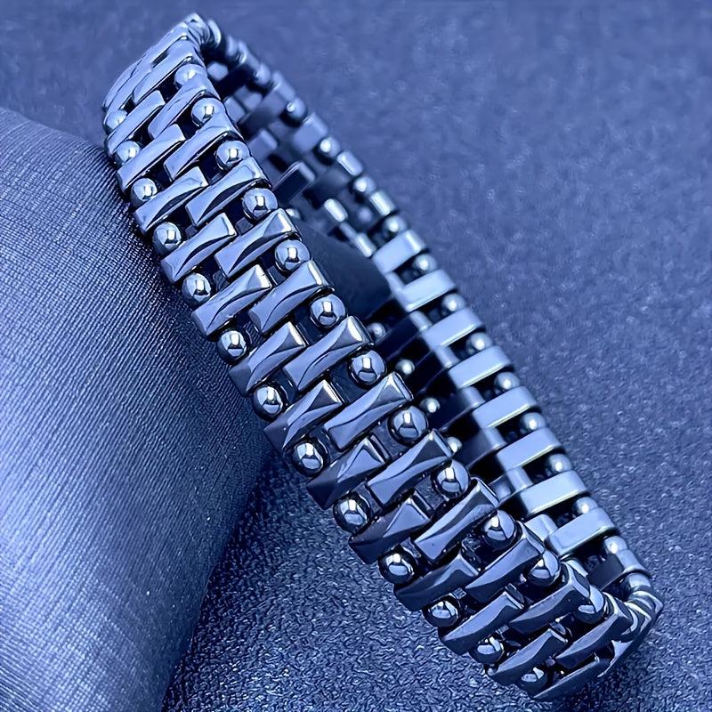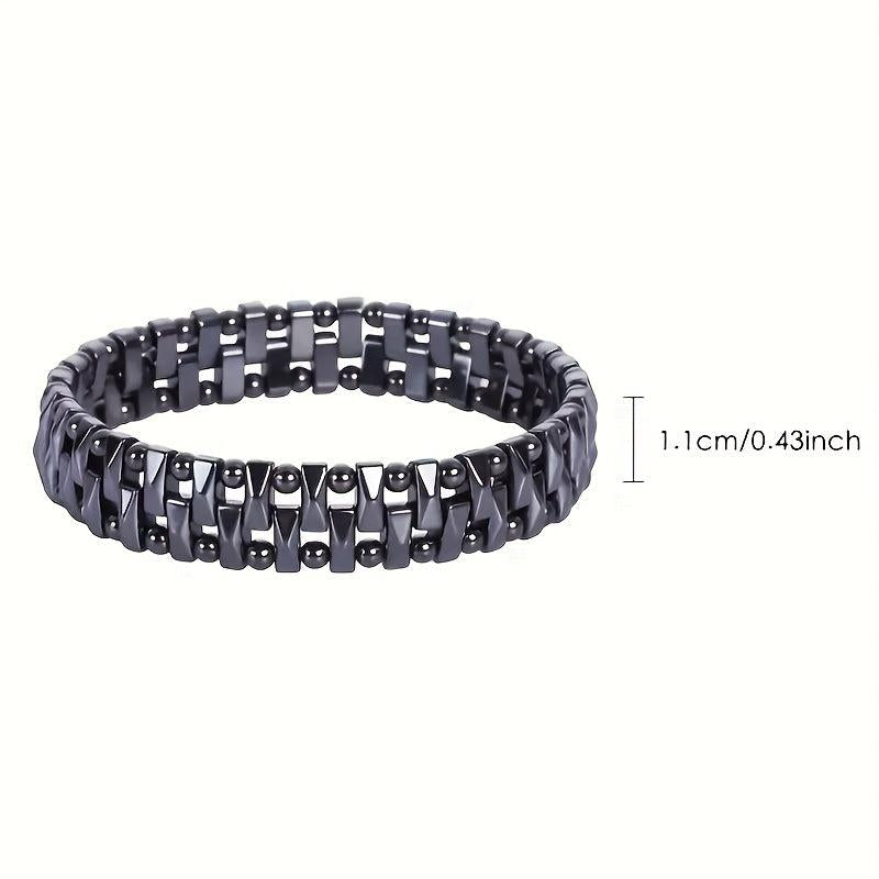 This unisex bracelet features hollow Terahertz stone with elastic design. It's a conservative style accessory with no plating, engraving, or pendant.