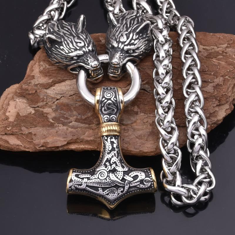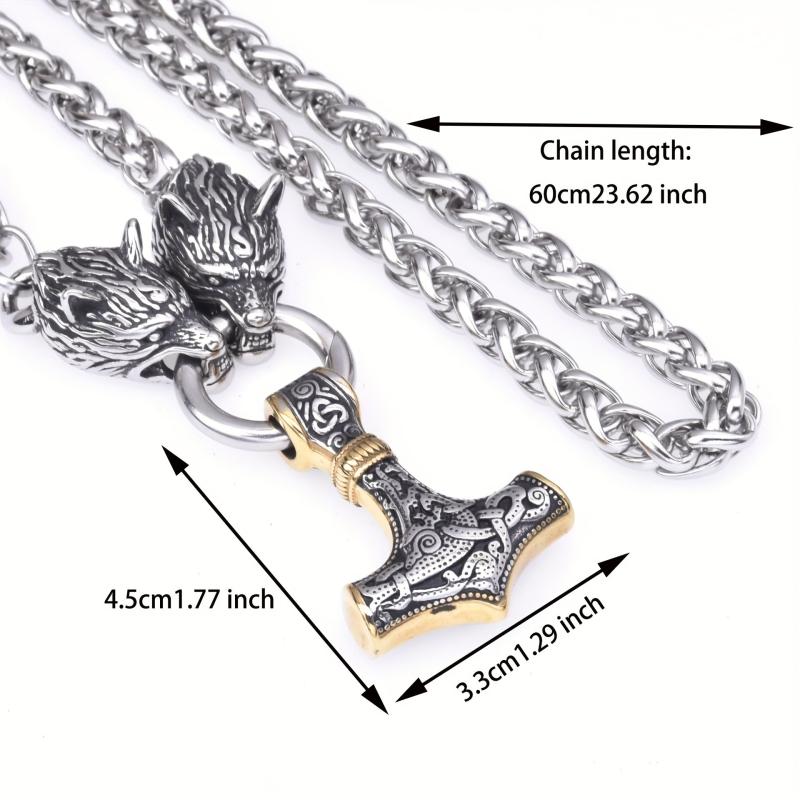 This pendant necklace features a European and American Viking style with a golden wolf head and Thor's hammer design. It is a bold and stylish piece for men's jewelry collection.