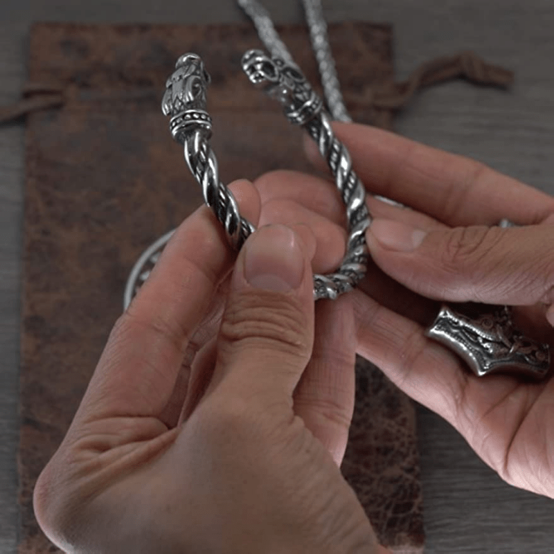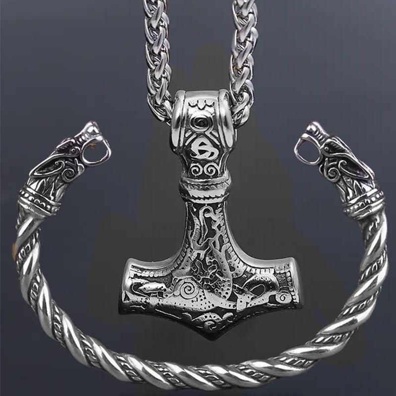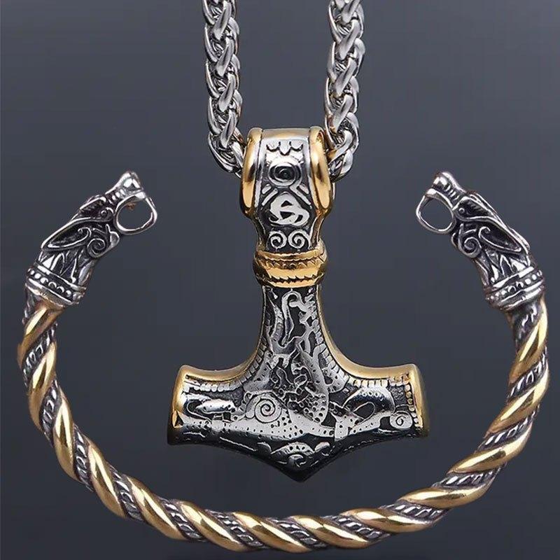 This set includes a wolf head pendant necklace and a matching bracelet with a Nordic hammer pendant. Perfect for men who appreciate Viking-inspired jewelry.